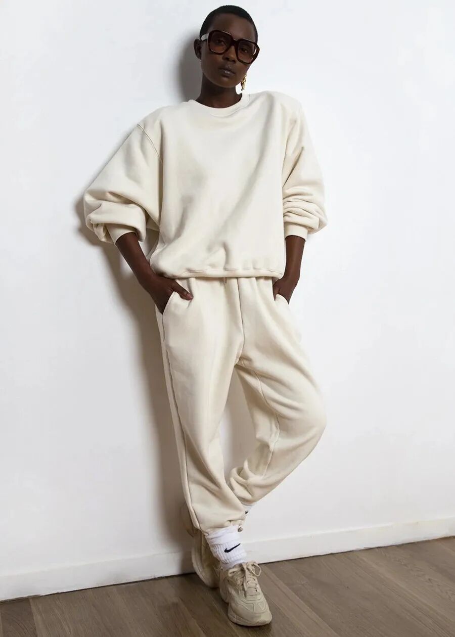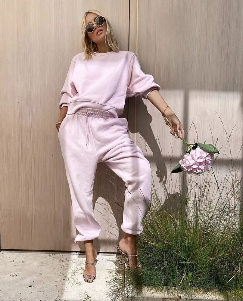 Viky Rader早就上身示范了这身粉色卫衣,搭配高跟鞋和墨镜减弱了一丝运动气息,穿出来属于自己的easy chic,帅气随意。