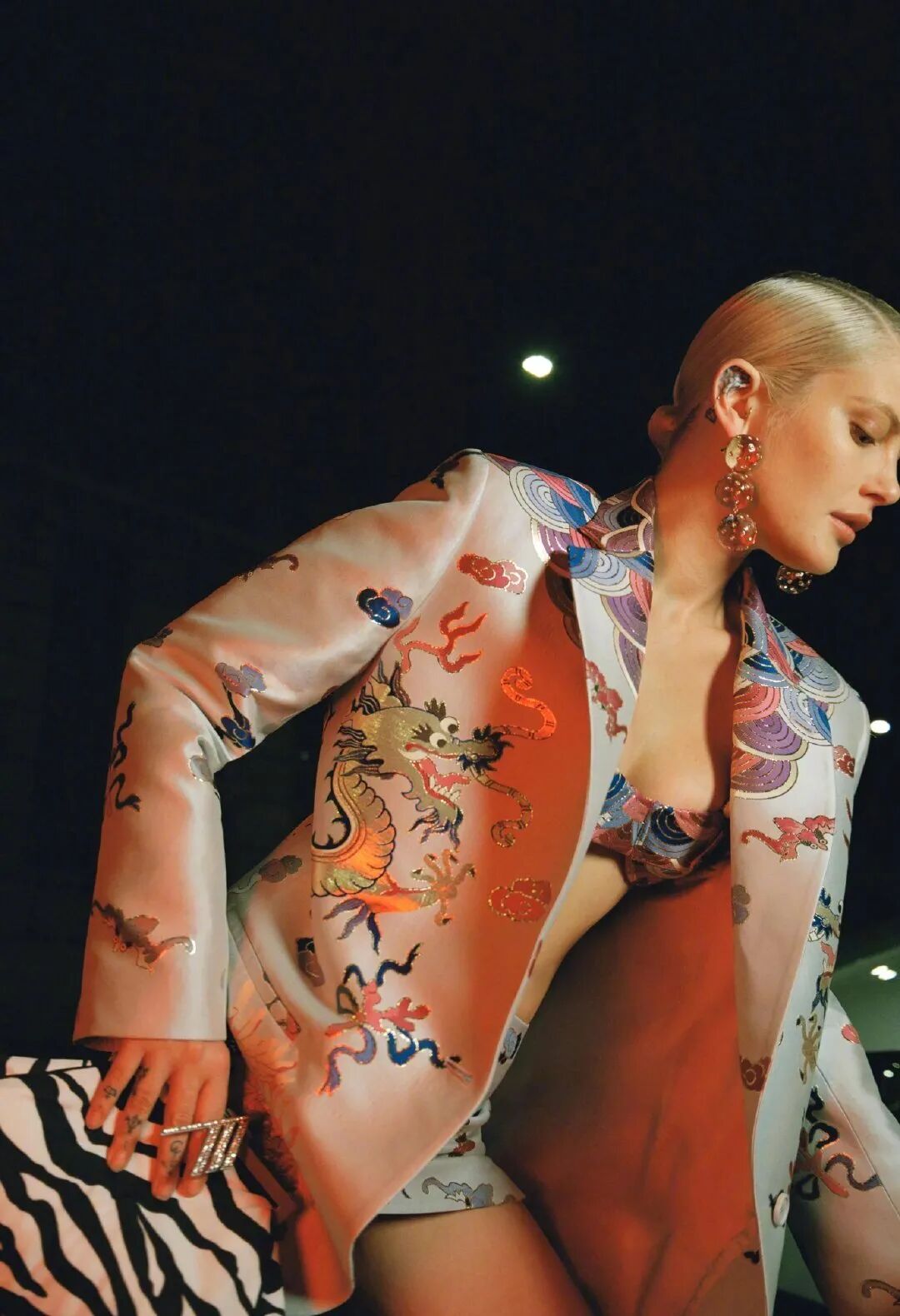 每件都好看到爆表的The Attico也设计了垫肩单品,在2020秋冬系列中更以中国风为主题,通过独一无二的中式风格,塑造出品牌独树一帜的专属韵味。