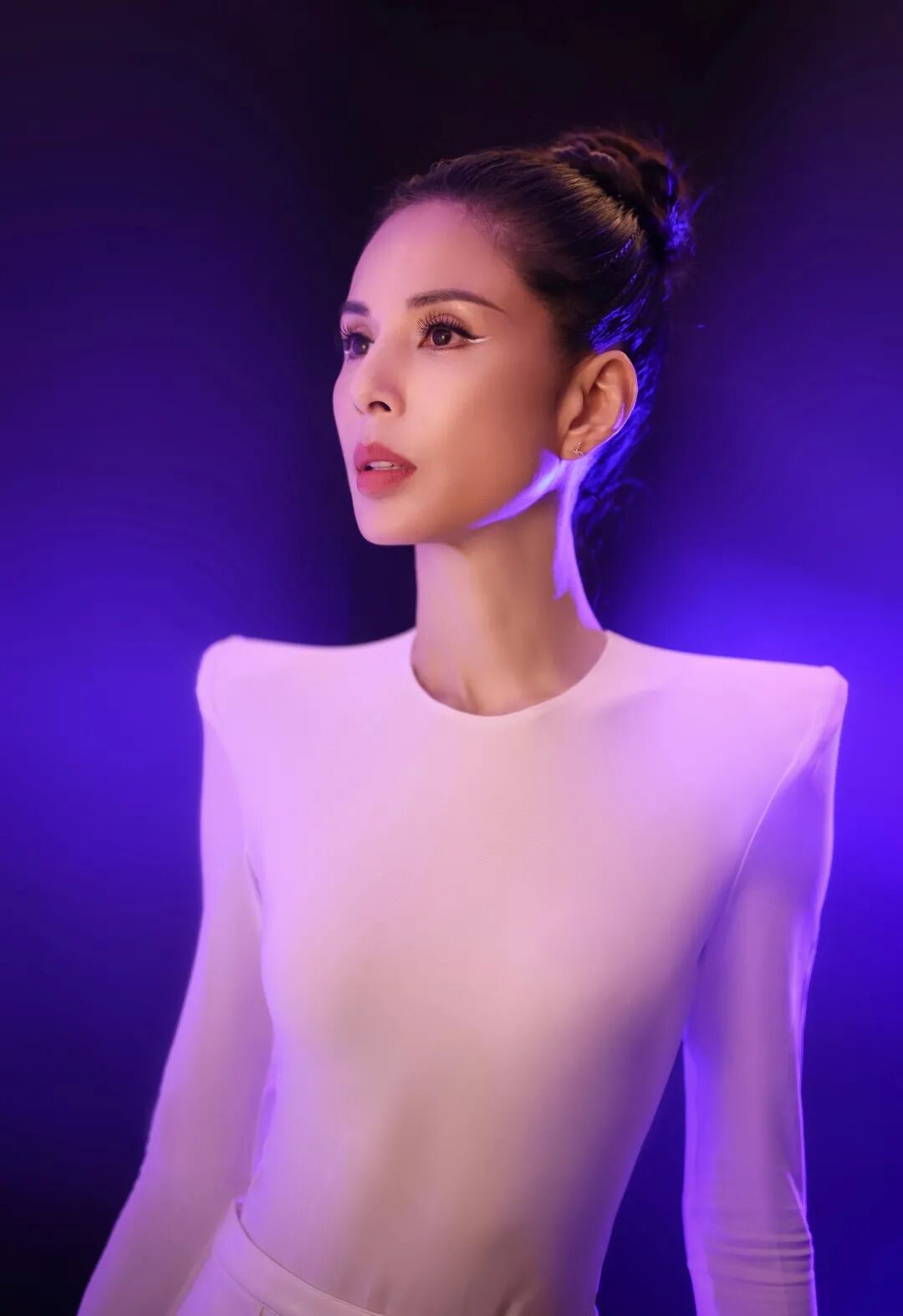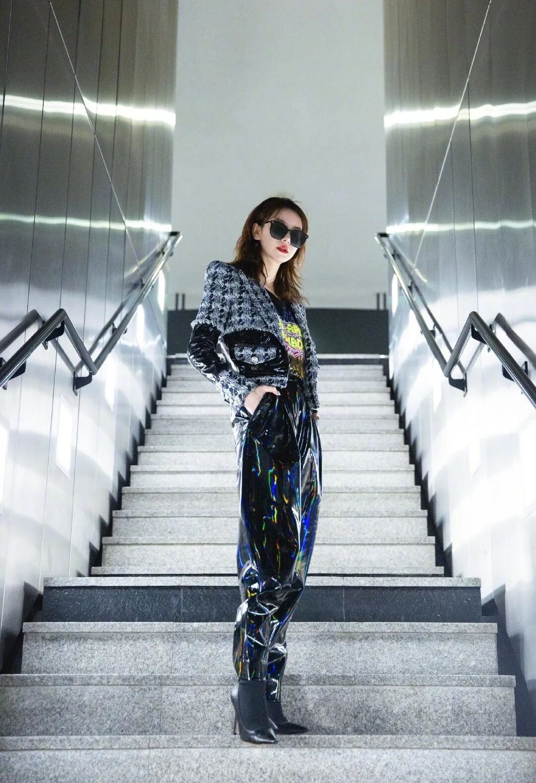 神仙姐姐李若彤拿垫肩元素走了把未来科技感的先进套路,纯白长袖立体垫肩上衣搭配漆皮长裤,又酷又A,完美的身材让粉丝过足了眼瘾。