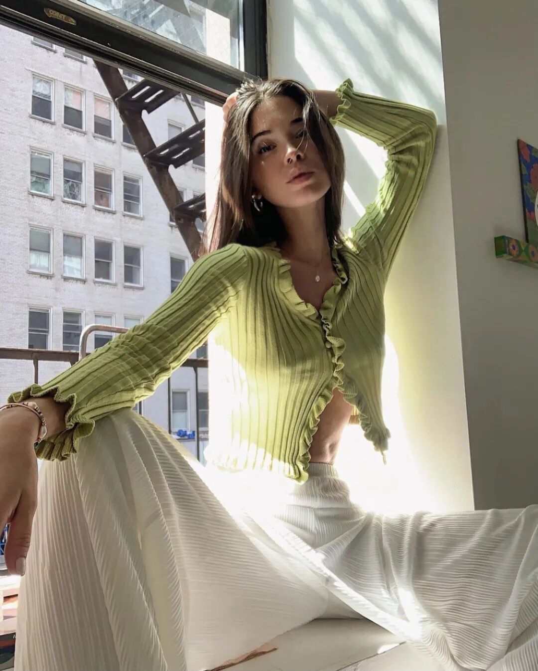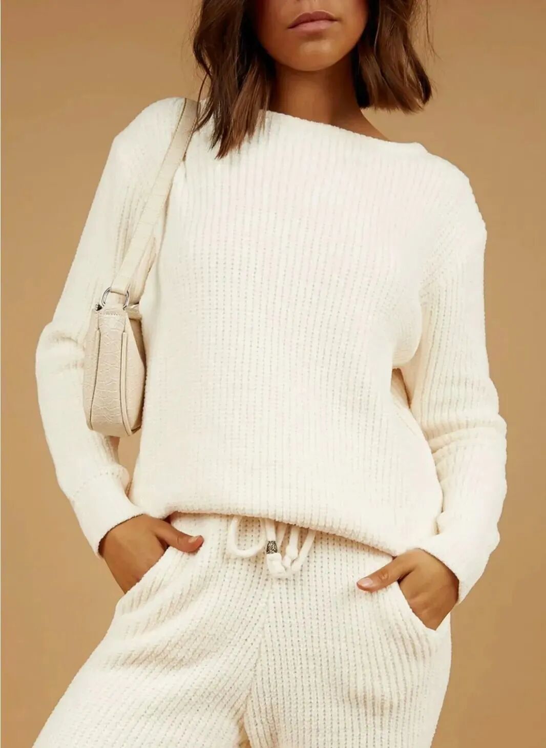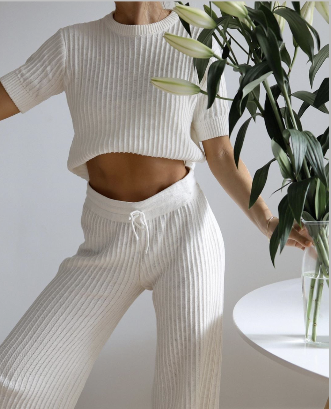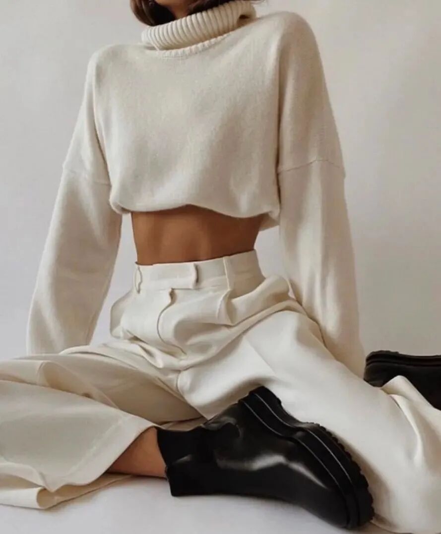 针织衫配上针织长裤,贴身的材质完美勾勒腿部曲线,针织材质垂坠感十足,一套穿上行云流水,展现女性的优雅风姿。