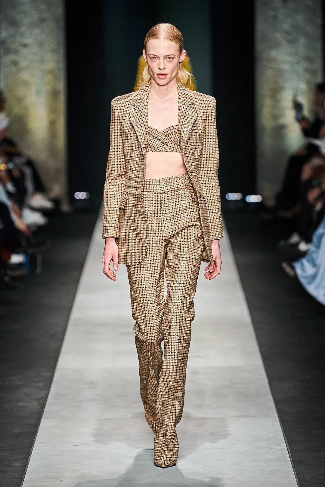 同面料的文胸大胆地适度露肤,打造出精致而不失风雅的crop top效果,再加上高腰微喇叭裤的裤型,突显腿长。整身由内而外散发出高级的质感。
