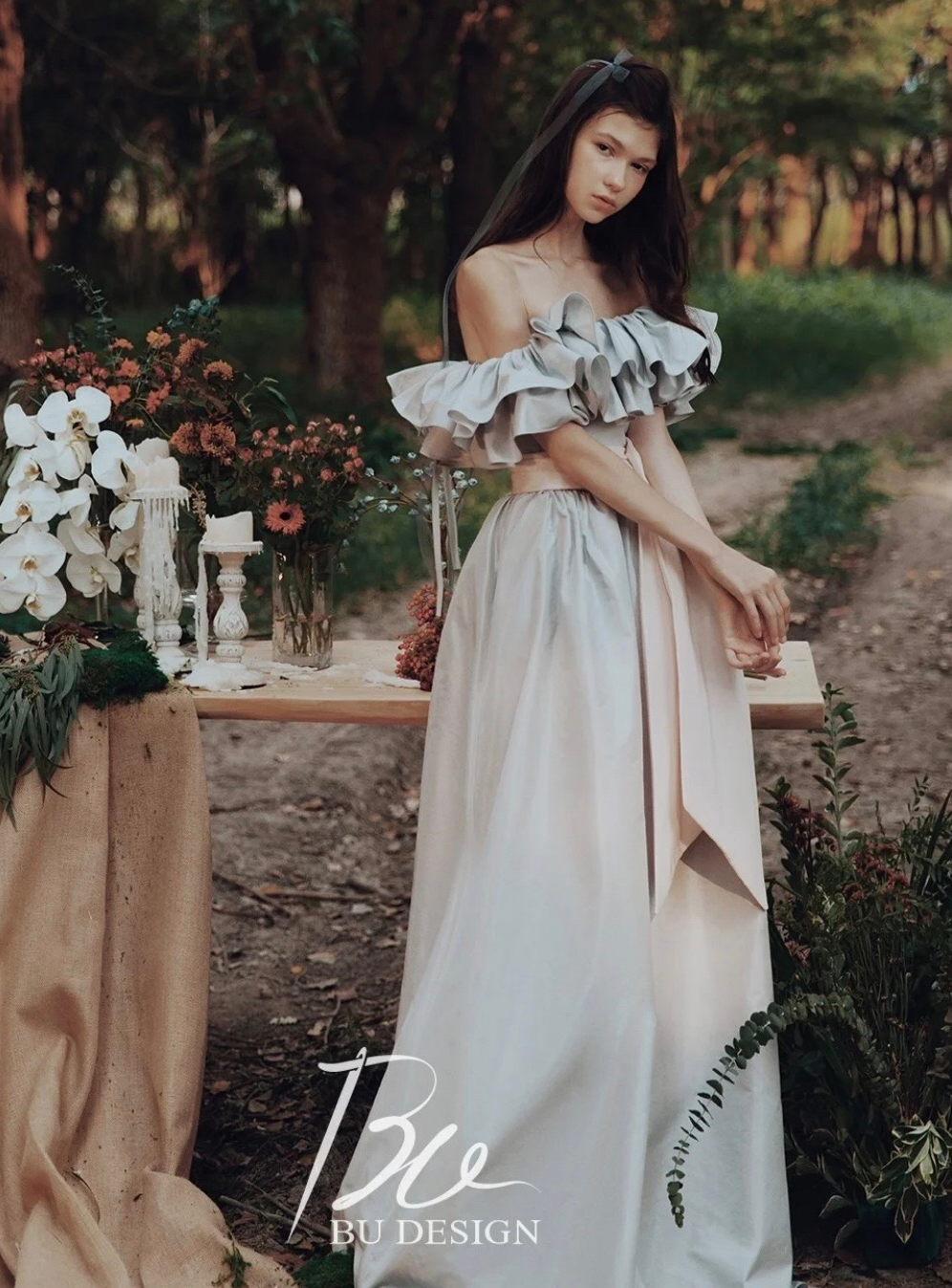 来自BU DESIGN 2021春夏的这条礼服裙线条感极强,绸缎面料带来流动感。胸部荷叶边的设计不仅遮挡住上臂,还显得前臂又细又直。