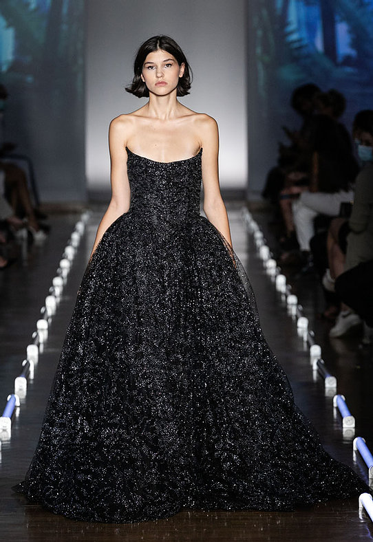 18-19世纪的束腰设计令裙摆更蓬松,一条同材质的淡色宽腰封,从腰部垂到礼裙下摆,像是被包装的礼物,是惊喜的设计。