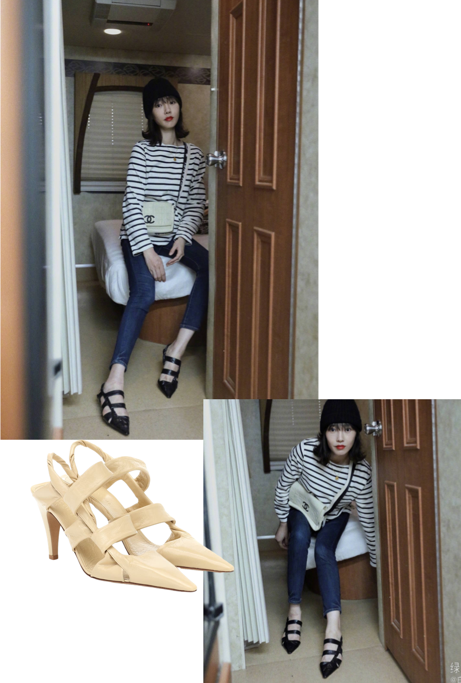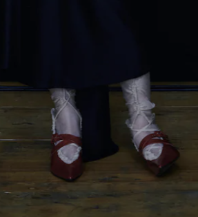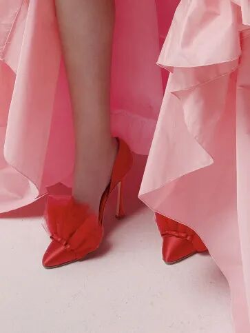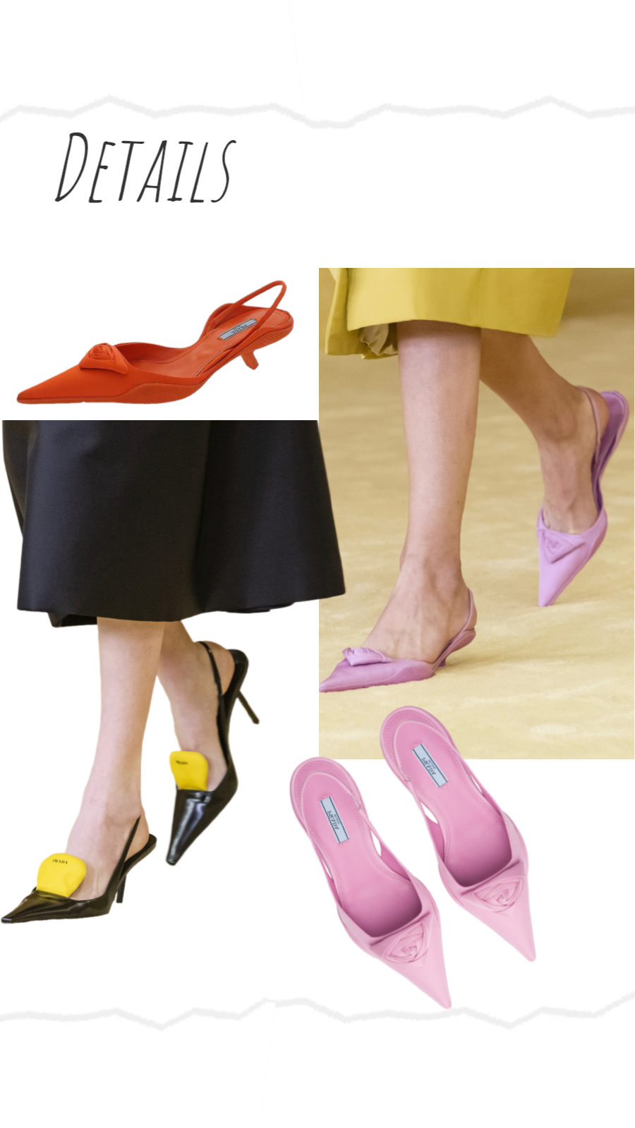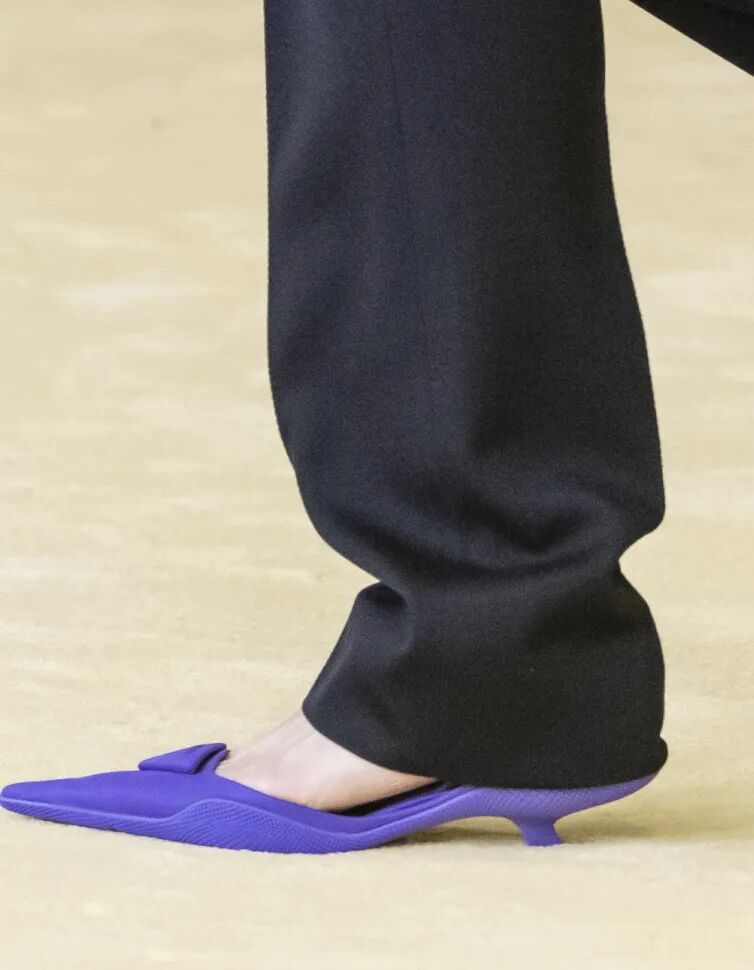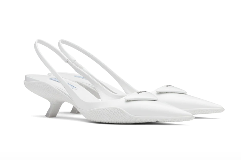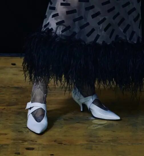 不得不提一下春夏秀场上芭姐身边公认最令人一见钟情的鞋子,这双尖头小猫跟。⬇️出现在Raf入驻Prada的第一季大秀上,必然有些来头。这双Slingback露脚后跟有装饰带的设计,显腿长一绝。