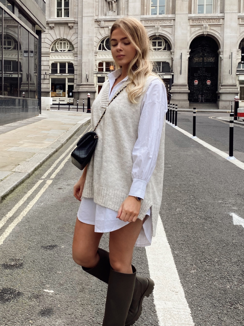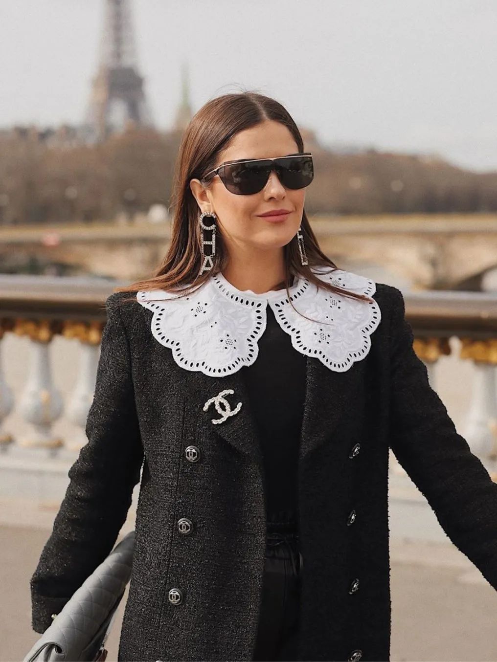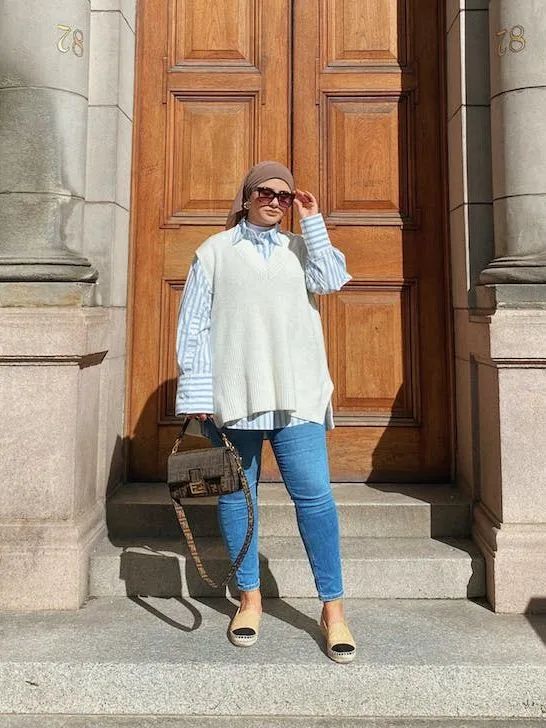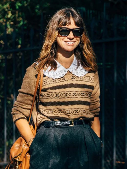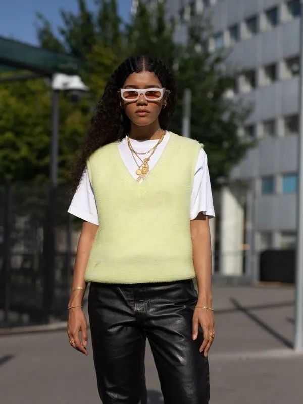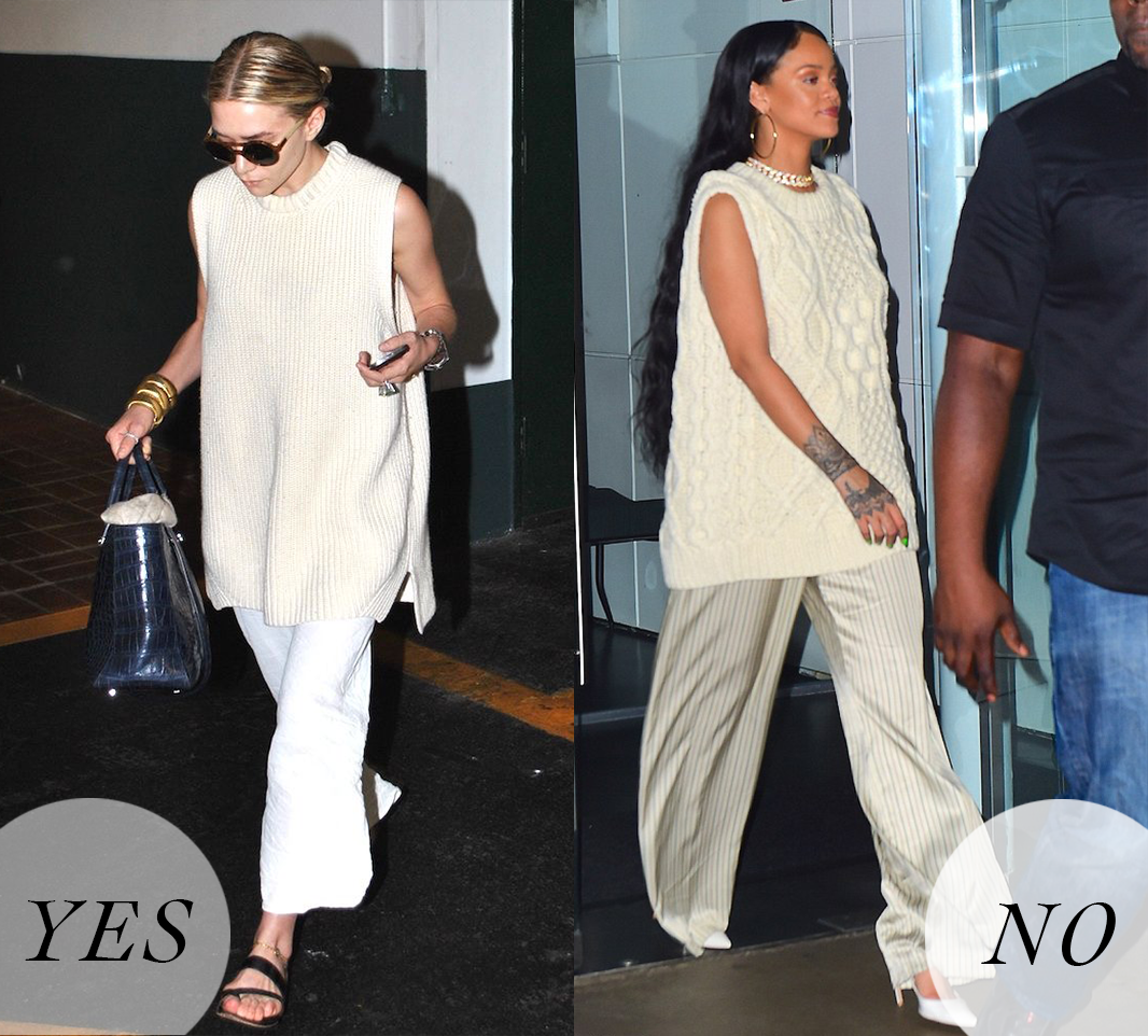 Billie Eilish简直就是廓形卫衣的狂热爱好者,不论是私下还是大小活动,都能看到她穿着各式各样的廓形上衣,不难看出廓形卫衣对大胸女生并不友好,只能起到遮罩的作用,但丝毫不能显瘦。想通过卫衣显瘦的女生,挑选面料和款式的时候千万要注意了!这几年随着时尚圈复古的风潮,学院风十足的针织马甲成为了一个十分流行的单品。但是,对于上围丰满的大胸女生们来说,看到针织马甲还是绕道而行吧,针织马甲的设计不仅显胸,腰也不见了。大胸女生在穿搭时很容易忽视掉针织马甲宽松的设计,给身体侧面带来的厚度,让身体的曲线消失不见,所以针织马甲其实更适合小巧、身板不大、小胸的女孩。Ashley Olsen和Rihanna在穿着同样款型的针织马甲的时候,明显Rihanna的穿搭从侧面看上去会更显胖一些,这也很好地说明了大胸女生会把衣服撑起来,让腰线消失,看上去不仅胖还厚。这两年另外一个流行单品娃娃领也会让大胸女生看上去更加厚实,让你在变可爱的同时也变得“圆滚滚”!红榜中的尖领和娃娃领本质上是两种不同的设计,大胸女生们可不要搞错了哦。娃娃领的圆弧设计和蕾丝元素会增加上身的烦琐感,复杂的设计会让视觉更加集中在胸前的部分,本来想通过可爱的娃娃领减龄的大胸女孩们,最后却容易适得其反。所以娃娃领不能对大胸的情况在视觉上达到削弱的效果,反而看上去还会显憨,一定要小心了!说了这么多,拥有甜蜜烦恼的大胸女孩们学会了吗?新的一年,继续发挥自己的优势大放异彩吧!