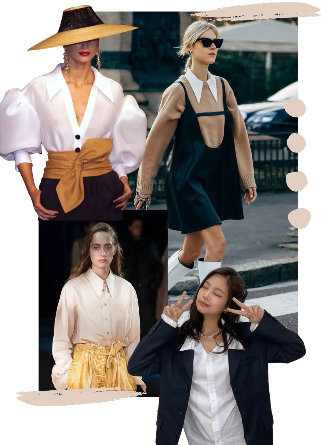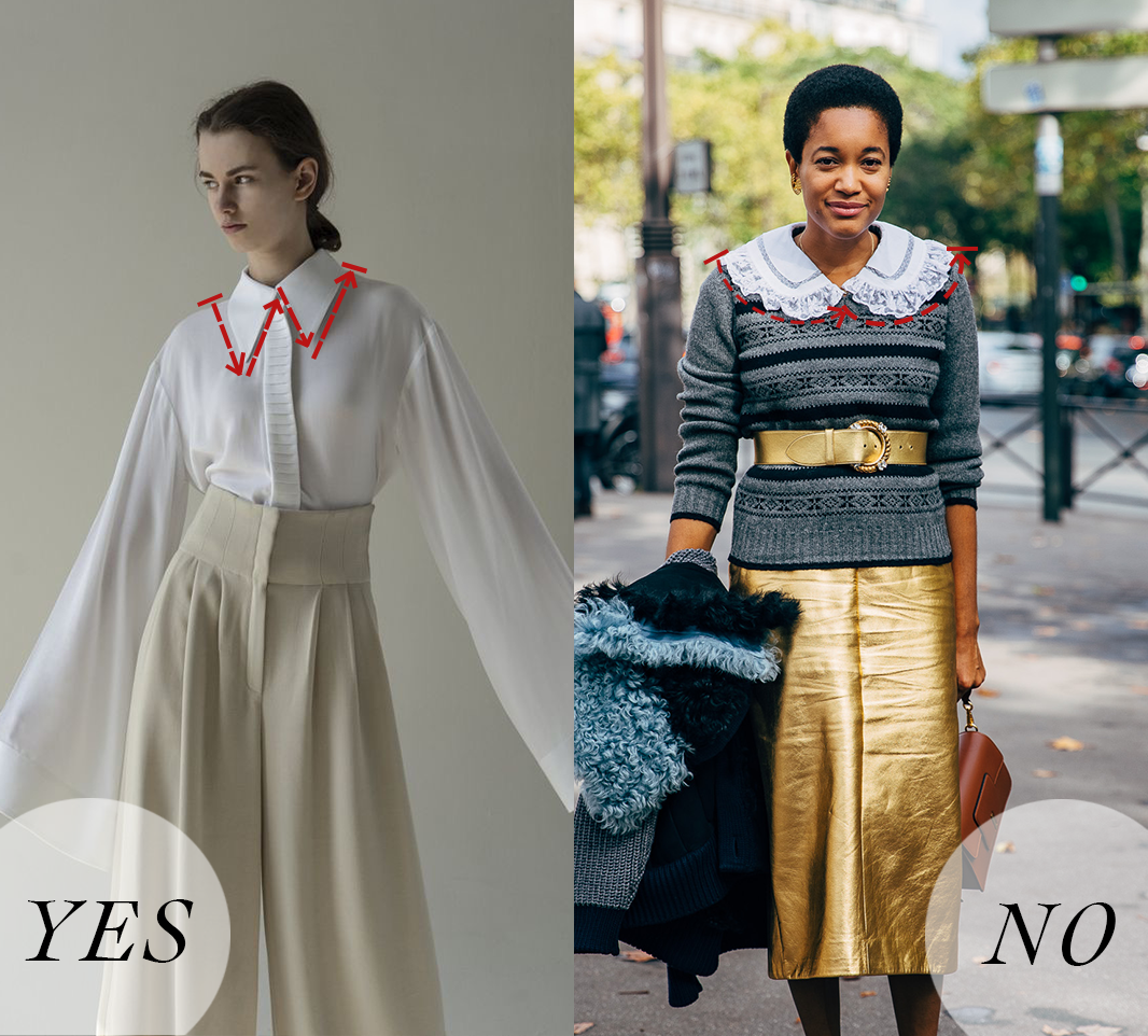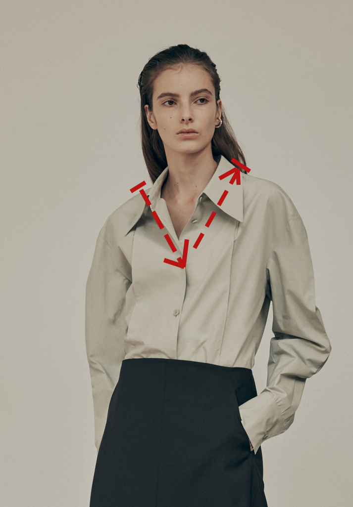 毕竟苹果形身材的女生挑衣服可不容易啊!由于胸大的原因,看上去腰腹浑圆突出,穿什么都容易看上去很胖。说出来你可能不太信,“大胸”的烦恼已经成为了全球女性的穿衣烦恼之一,冬天穿得太多又显胖,夏天穿得太少又莫名不雅。微博上还有过关于胸大烦恼的投票,许多胸大的女生在选择衣服时并不能随心所欲,想穿一些修身类型的衣服,又会因为过于紧身让人产生不好的联想等。票数最高的“衬衫穿搭”,估计大部分大胸的女生都有过穿衬衫出现扣子崩溃的情况,甚至大胸带来的问题不仅仅是胖,而且厚。胸型造成视觉上的上身粗壮、显胖的错觉,很多时候都是因为没有选对合适的单品,造成了体态虎背熊腰的结果,甚至有的时候还会遭受一些恶意满满的评价,让很多原本并不胖的女生开始身材焦虑起来。杨幂也在前阵子采访时谈到所谓“白幼瘦”的标准,她认为是提出这个标准的人有问题,选择一个健康、舒适的身体姿态和生活方式才是现代女性应该享有的社会尊重。大胸女孩又有什么错呢?只要扬长避短,绝对能穿出秒杀四方的好身材。芭姐今天给大胸女生们总结了一套大胸女生穿衣红黑榜,科学讲讲苹果形身材穿衣应该如何挑选衣服,合理缩小上身体积,穿出好身材。⬇️衬衫作为衣柜里的必备单品,对大胸女孩来说却是无法言说的伤啊,款式没选对一不小心就穿出灾难。芭姐建议选择充满设计感和高级感的尖领衬衣,从视觉上能够拯救大胸带来的烦恼,新鲜的小设计搭配基础款也能轻松出彩。尖领设计最早是来自于哥特风,将锐利的三角形和上衣设计融合,延长了颈部线条的同时,还能够弱化胸大在搭配上造成的厚重感。尖领衬衣的衣角运用三角形的几何原理,将最长的两条边设计在衣领,上显脸小,下显胸小,而且不论是单穿还是内搭都能够帮助到大胸女孩实现想要的效果。尖领衬衣还十分巧妙地将视觉集中在上衣的领口,以显瘦的V领设计营造出纤长感,不论是将领口扣上或是解开几颗扣子都能有效显瘦。金子涵妹妹作为发育优秀的少女代表,一不小心就让人觉得漂亮mm又胖了。但这一次,金子涵的这身尖领衬衣不仅弱化了上身的体积,还巨显脸小,完全是元气满满的少女模样。当尖领衬衣成为内搭的时候,像戚薇这样解开几颗扣子,将颈部线条展现出来,又港又飒,轻松打造出高级的冷艳感,分分钟气场一米八。尖领衬衫简直是大胸女生的百搭单品,不管是甜系风还是盐系风都能轻松拿下,快拿小本本记下来!穿搭界的万能搭配法则大家还记得吗?腰线就是永远的神!对于大胸女生来说,腰线就是显胸小的法宝,用腰封来打造出腰线,转移了全身比例的重心,自然就显瘦啦。腰封在搭配西装外套、大衣、oversize卫衣、裙子时都能轻易创造一个新的腰线,打破苹果形身材的视觉扩张感。