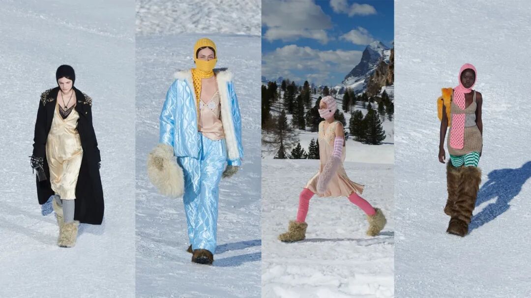 Miu Miu 则直接将秀场选在了意大利滑雪胜地的雪山中,拥有水晶珠片装饰的滑雪服,终于让爱滑雪的女孩儿有了精致俏皮的新选择!