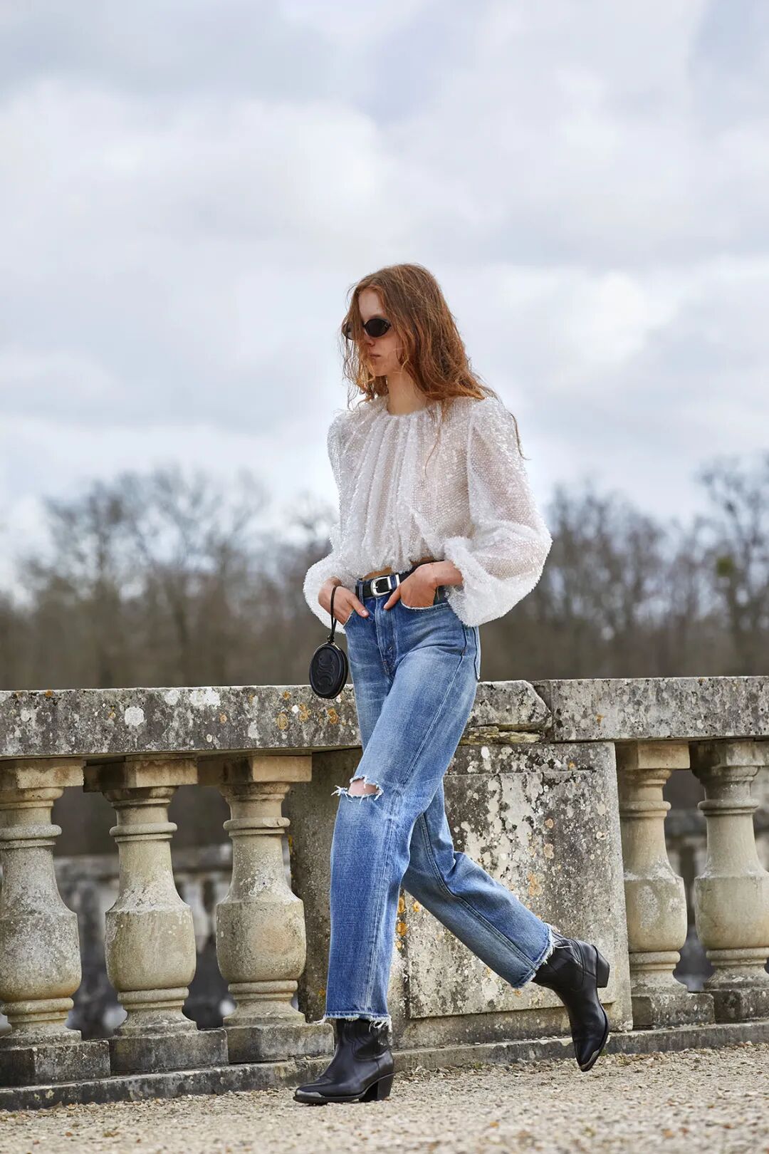 这一季,Hedi Slimane延续了2021春夏女装秀的青年文化以及摇滚元素,伴随着背景音乐里吟唱的“Je Fais Un DayDream”,青年文化与古典文学交织融入时装,共赴一场新时代的游园绮梦。