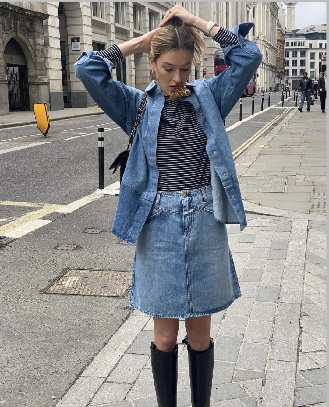 百搭不腻的白背心,配上今年最in的绿色裤子,反差视觉效果一下就有了,要的就是这种easy chic。或是像博主Jess Alizzi这样巧妙地三色混搭,黑色外套与黑色包包呼应,值得注意的是身上的基础款最多不要超过三种颜色,才能练就基础款混搭的“高级段位”。博主Camille一身丹宁牛仔衬衫+牛仔半裙,内搭一件经典黑白条纹,包袋也是一致的黑色,层次感十足,经典果然都是经久不衰的,百看不厌。