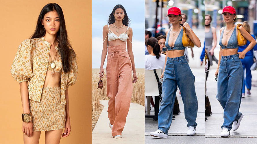 高腰长裤、短裤和裙装不仅能从视觉上拉长你的下半身线条,最重要的是,小肚腩能够被巧妙地藏起来,只露出上半身最纤细的区域。Chanel白色Bra top与黑色高腰半裙相映出现,瞬间拉近了高露肌比例与优雅之间的距离。Alberta Ferretti的秀场上高腰裤、迷你裙与Bra top组合,展示女孩的多面形象。Jacquemus用腰极高的阔腿裤搭配吊带Bra,迎着风,很是飘逸。Emily Ratajkowski看篮球比赛时就穿着Prada的牛仔Bra top 和高腰裤,谁能发现她其实是位五五分美人?