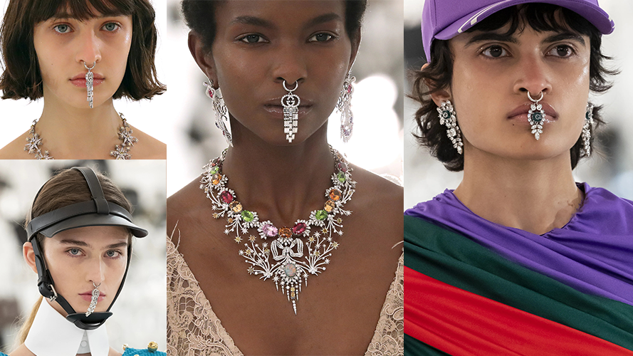 Gucci 在Aria-时尚咏叹调系列中展示了超级抢眼的、带有各类花纹的面部珠宝,鼻环隔穿孔处悬挂着饰有双G Logo的锁链。体积和耳环差不多的大小,谁看了不感叹一声浮华?不过,美丽是美丽,嫌重和不方便也是真。