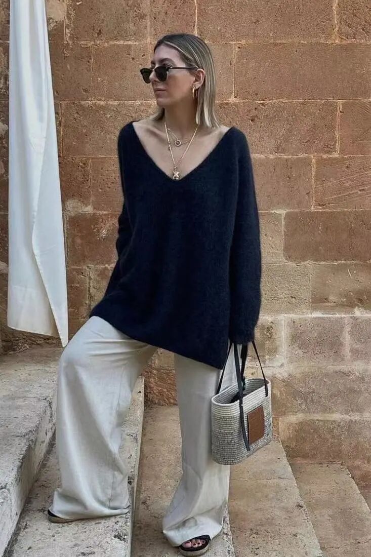 选择较大的领子,比如V领、U领,或者中长的项链,拉长颈部的视觉效果,淡化身形的圆润,博主Ali Tate-Cutler显然深谙此道。袖子长度在五分袖、七分袖,露出身体相对最细的手腕一截,同样非常适合O型姐妹。