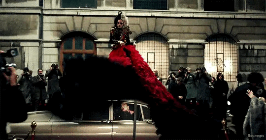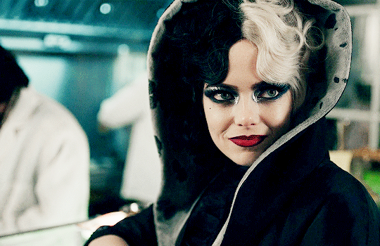 烟熏妆大红唇加上标志性的黑白阴阳头,从贫民窟追梦女孩到暗黑女魔头,就像汤普森说的:任何人都会为“库伊拉”着迷。