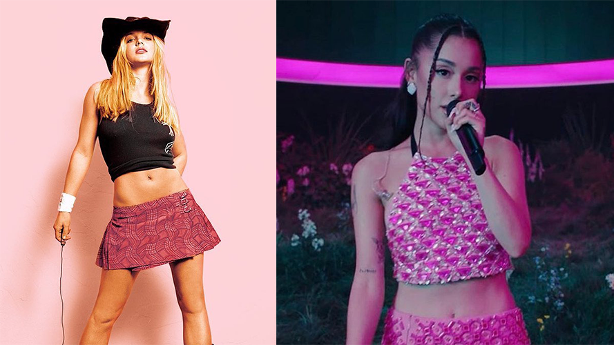 相对于露腿,千禧辣妹更爱露脐,所以下装都按低腰来。当年Britney是“低腰裤女王”,不管是出街、红毯还是演唱会,她都会穿着低腰裤来“炫腹”。而最近,Ariana Grande在《Position》的现场表演中穿了身MiuMiu的挂脖吊带和低腰超短裙,配上她的高马尾,很有Y2K的氛围。