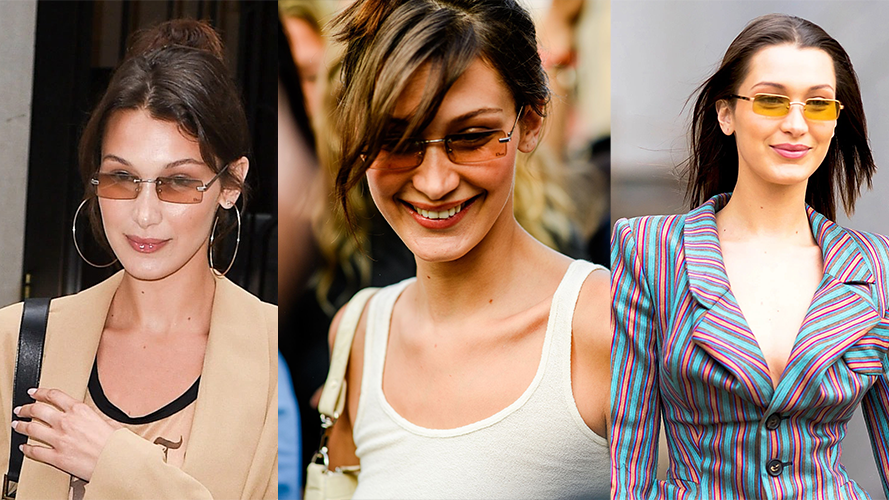 超大镜框、猫眼形状都不及透明太阳眼镜的年代感,特别是渐变效果的茶色款。它确实不太修饰脸形,但很能凹那种又酷又拽的造型。Bella Hadid简直就是这类眼镜的“种草机”,在她标志性的复古造型中,长窄墨镜算是点睛之笔。
