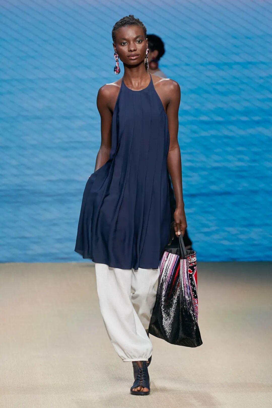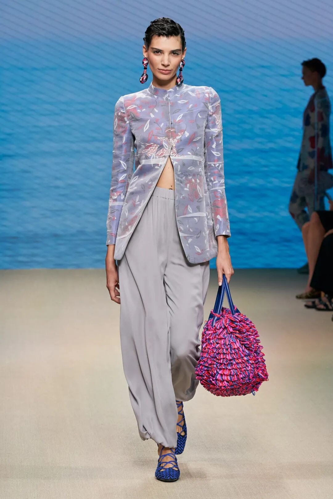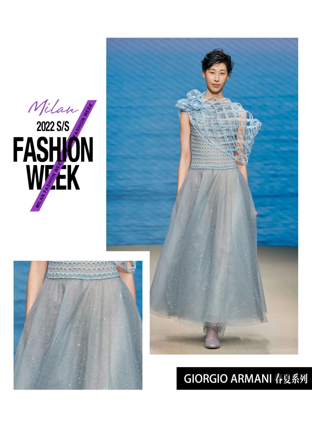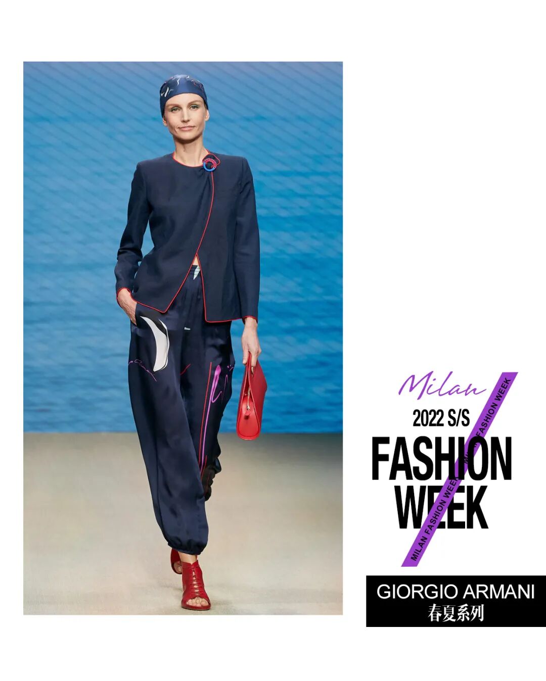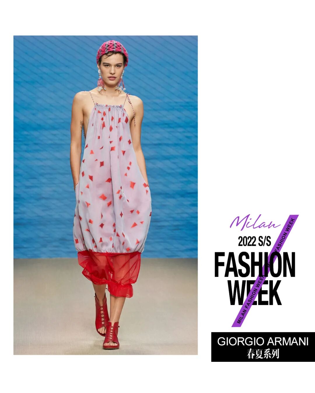 北京时间9月26日凌晨1点,Giorgio Armani 2022春夏女装系列在意大利米兰的Borgonuovo大街 21号历史剧院拉开序幕。这是品牌二十多年后再次将秀场搬回这个曾举办多场重要时装秀的标志性场地。今年87岁的Armani老先生依然积极地坚持着奋战在工作的第一线,以无穷的浪漫想象将我们带往仲夏时分的海边。在大秀开始前,品牌就在官方账号上发布了两套Giorgio Armani在上世纪90年代的女装设计,身穿时装的模特站在沙滩上,仿若海岸上的优雅美人。而“Memories of Summer(夏日记忆)”的配文,也让我们得知本季大秀的灵感来源——仲夏的蔚蓝海洋、阳光璀璨的光影变奏,以及20世纪90年代Armani曾经为我们带来的优雅着装风格。这一季,Armani 将品牌简约优雅与游牧民族气息精妙融和到时装系列里。那些绚丽的色彩、带着异域风情的装饰,如同在旅途中沿途被撷取而下,继而被赋予了时髦现代都市感,焕发出不一样的魅力,让我们再一次见证时尚的轮回。剪裁精巧的优雅套装作为第一套Look出场,从线条挺括的斜襟垫肩西装中,我们不难从中看出上世纪90年代经典西装的影子。下装部分,Armani老先生却选择了以流动的线条印花、光滑的绸缎面料打造休闲的裤装,将品牌的流线型风格展露无遗。 从面料到剪裁的变化带来随性碰撞,以及一种舒适与放松的感觉,传达着每位女性皆可随心穿搭,通过时装找到最舒服的那一个自己。随后,更柔软的绸缎风衣和衬衫上场,廓形修长流动,轻裹曼妙身躯,没有过多的繁杂设计就可让都市女性展现自身的自然优雅气质。结合着薄纱、雪纺和绸缎等材质,我们可以看到Giorgio Armani老先生将海边的波光粼粼,变幻出各种深浅不一的色彩运用到时装上,那中性柔和的色调还是Armani一贯的风格,带给视觉上更为舒适放松的时髦风格。从简约的衬衫到华丽浪漫的长款连衣裙、编织抹胸的出现,仿若白日里现代职场的活力女性,脱下束缚、换上华服,化身为夜幕下优雅的晚宴女郎。裤筒设计也变得更为宽大和飘逸,如同裙子一样,流畅的线条,微妙考究的设计,展现着Armani女性的优雅魅力。当一抹亮眼的红色出现在秀场上,昭示着太阳光线对海面的影响变化,催生出变幻莫测的美丽,大秀又掀开一场浪漫华丽的新篇章。 如同夕阳洒落海面,看着大海由蔚蓝一点点变为红色与紫色交汇的海洋,接下来登场的Armani女郎,身上的时装都被赋予了更多绚烂色彩。色彩明艳的轻质薄纱、塔夫绸赋予晚装更多的华丽和浪漫,“花朵”元素蔓延在身上,为造型增添了更多春夏的气息。随着背景色调的变化,那些极致美丽的长款礼服也幻化成不同的气质,时而静寂,时而神秘,时而绚丽,时而平和,如同大海一样有着无穷的魅力。刺绣薄纱的裙体上满布璀璨夺目的闪亮,更让礼服充满了梦幻色彩,营造出仙气满满,如同点点星光洒落在海面之上。流光溢彩的感觉,让模特仿佛踏破夜色,披着星光向我们走来,营造出甜美、大胆、无限柔和的微妙色彩。这一季,Giorgio Armani 让我们看到头饰的风潮又回来了。通过印花丝巾和钩针帽,在都市女性的时髦感和吉普赛女郎的休闲中切换两种风格,造型感十足,提升了女性柔美的气质。配饰上,夸张风格的串珠层层叠叠,呈现出带有异域感的浪漫韵味。串珠缠绕在身上作为点缀,为日常衣柜注入了更多的奇思妙想。夸张的亚克力耳环依然是造型的亮点之一,毋庸置疑,不管什么时候一副耀眼的耳饰就能够增加隆重感。包袋设计上,Giorgio Armani 增添了大胆的流线型设计。手提包的提手、包身线条都带弧形,让包包的风格变得更为优雅。而更大钩针单肩包和刺绣亮片包包上也体现到这种流线型设计,尤其在提手部分,细节处更有设计感。其实不管是时髦的都市女性,还是浪漫的吉普赛女郎,在Giorgio Armani的时装下,优雅始终都是她们形象中不变的内核。Giorgio Armani 以想象赋予现代女性随性、自在的优雅气质,正如他所说过的那样:Elegence is not about noticed,it's about being remebered.(真正的优雅不是惹人注意,而是被人铭记。)
