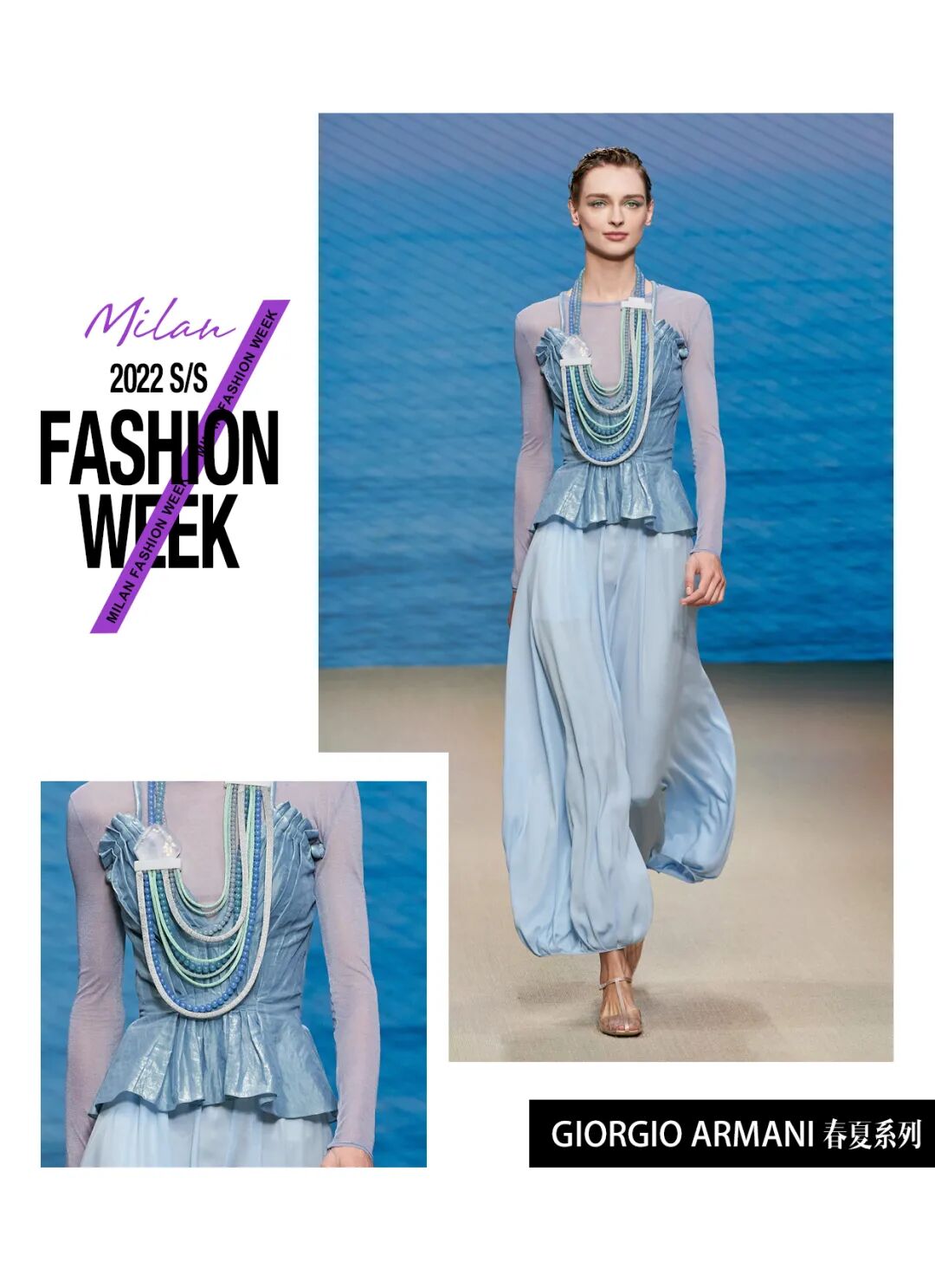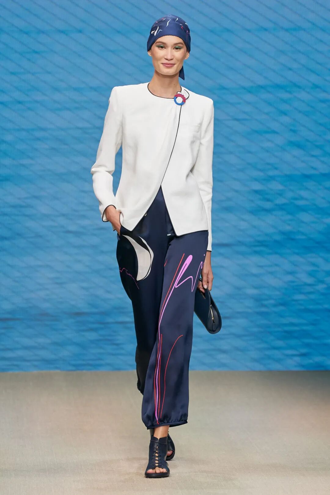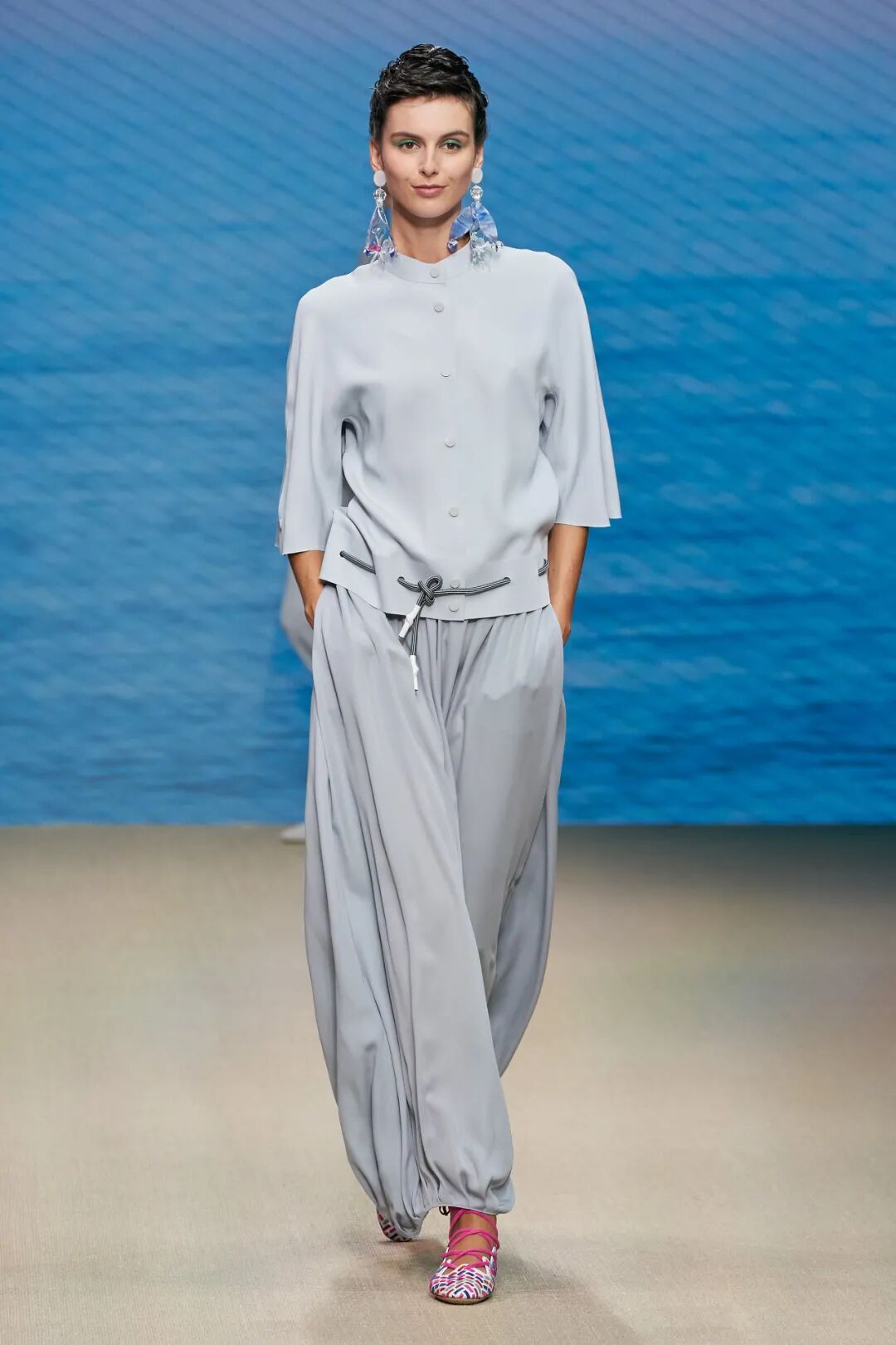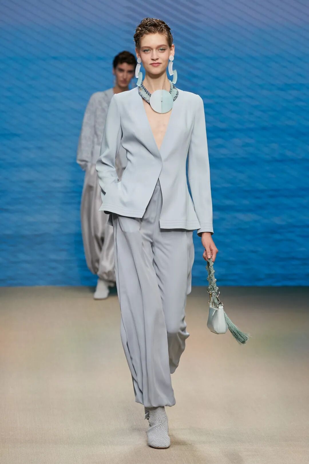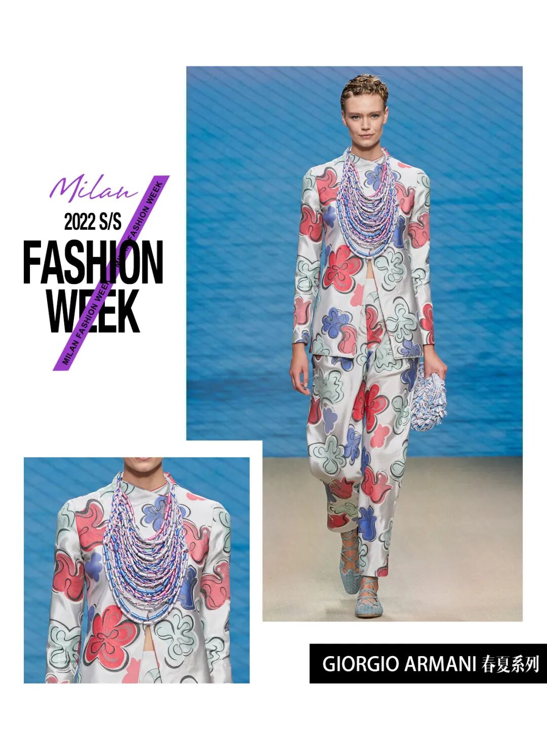 北京时间9月26日凌晨1点,Giorgio Armani 2022春夏女装系列在意大利米兰的Borgonuovo大街 21号历史剧院拉开序幕。这是品牌二十多年后再次将秀场搬回这个曾举办多场重要时装秀的标志性场地。今年87岁的Armani老先生依然积极地坚持着奋战在工作的第一线,以无穷的浪漫想象将我们带往仲夏时分的海边。在大秀开始前,品牌就在官方账号上发布了两套Giorgio Armani在上世纪90年代的女装设计,身穿时装的模特站在沙滩上,仿若海岸上的优雅美人。而“Memories of Summer(夏日记忆)”的配文,也让我们得知本季大秀的灵感来源——仲夏的蔚蓝海洋、阳光璀璨的光影变奏,以及20世纪90年代Armani曾经为我们带来的优雅着装风格。这一季,Armani 将品牌简约优雅与游牧民族气息精妙融和到时装系列里。那些绚丽的色彩、带着异域风情的装饰,如同在旅途中沿途被撷取而下,继而被赋予了时髦现代都市感,焕发出不一样的魅力,让我们再一次见证时尚的轮回。剪裁精巧的优雅套装作为第一套Look出场,从线条挺括的斜襟垫肩西装中,我们不难从中看出上世纪90年代经典西装的影子。下装部分,Armani老先生却选择了以流动的线条印花、光滑的绸缎面料打造休闲的裤装,将品牌的流线型风格展露无遗。 从面料到剪裁的变化带来随性碰撞,以及一种舒适与放松的感觉,传达着每位女性皆可随心穿搭,通过时装找到最舒服的那一个自己。随后,更柔软的绸缎风衣和衬衫上场,廓形修长流动,轻裹曼妙身躯,没有过多的繁杂设计就可让都市女性展现自身的自然优雅气质。结合着薄纱、雪纺和绸缎等材质,我们可以看到Giorgio Armani老先生将海边的波光粼粼,变幻出各种深浅不一的色彩运用到时装上,那中性柔和的色调还是Armani一贯的风格,带给视觉上更为舒适放松的时髦风格。从简约的衬衫到华丽浪漫的长款连衣裙、编织抹胸的出现,仿若白日里现代职场的活力女性,脱下束缚、换上华服,化身为夜幕下优雅的晚宴女郎。裤筒设计也变得更为宽大和飘逸,如同裙子一样,流畅的线条,微妙考究的设计,展现着Armani女性的优雅魅力。当一抹亮眼的红色出现在秀场上,昭示着太阳光线对海面的影响变化,催生出变幻莫测的美丽,大秀又掀开一场浪漫华丽的新篇章。 如同夕阳洒落海面,看着大海由蔚蓝一点点变为红色与紫色交汇的海洋,接下来登场的Armani女郎,身上的时装都被赋予了更多绚烂色彩。色彩明艳的轻质薄纱、塔夫绸赋予晚装更多的华丽和浪漫,“花朵”元素蔓延在身上,为造型增添了更多春夏的气息。随着背景色调的变化,那些极致美丽的长款礼服也幻化成不同的气质,时而静寂,时而神秘,时而绚丽,时而平和,如同大海一样有着无穷的魅力。刺绣薄纱的裙体上满布璀璨夺目的闪亮,更让礼服充满了梦幻色彩,营造出仙气满满,如同点点星光洒落在海面之上。流光溢彩的感觉,让模特仿佛踏破夜色,披着星光向我们走来,营造出甜美、大胆、无限柔和的微妙色彩。这一季,Giorgio Armani 让我们看到头饰的风潮又回来了。通过印花丝巾和钩针帽,在都市女性的时髦感和吉普赛女郎的休闲中切换两种风格,造型感十足,提升了女性柔美的气质。配饰上,夸张风格的串珠层层叠叠,呈现出带有异域感的浪漫韵味。串珠缠绕在身上作为点缀,为日常衣柜注入了更多的奇思妙想。夸张的亚克力耳环依然是造型的亮点之一,毋庸置疑,不管什么时候一副耀眼的耳饰就能够增加隆重感。包袋设计上,Giorgio Armani 增添了大胆的流线型设计。手提包的提手、包身线条都带弧形,让包包的风格变得更为优雅。而更大钩针单肩包和刺绣亮片包包上也体现到这种流线型设计,尤其在提手部分,细节处更有设计感。其实不管是时髦的都市女性,还是浪漫的吉普赛女郎,在Giorgio Armani的时装下,优雅始终都是她们形象中不变的内核。Giorgio Armani 以想象赋予现代女性随性、自在的优雅气质,正如他所说过的那样:Elegence is not about noticed,it's about being remebered.(真正的优雅不是惹人注意,而是被人铭记。)