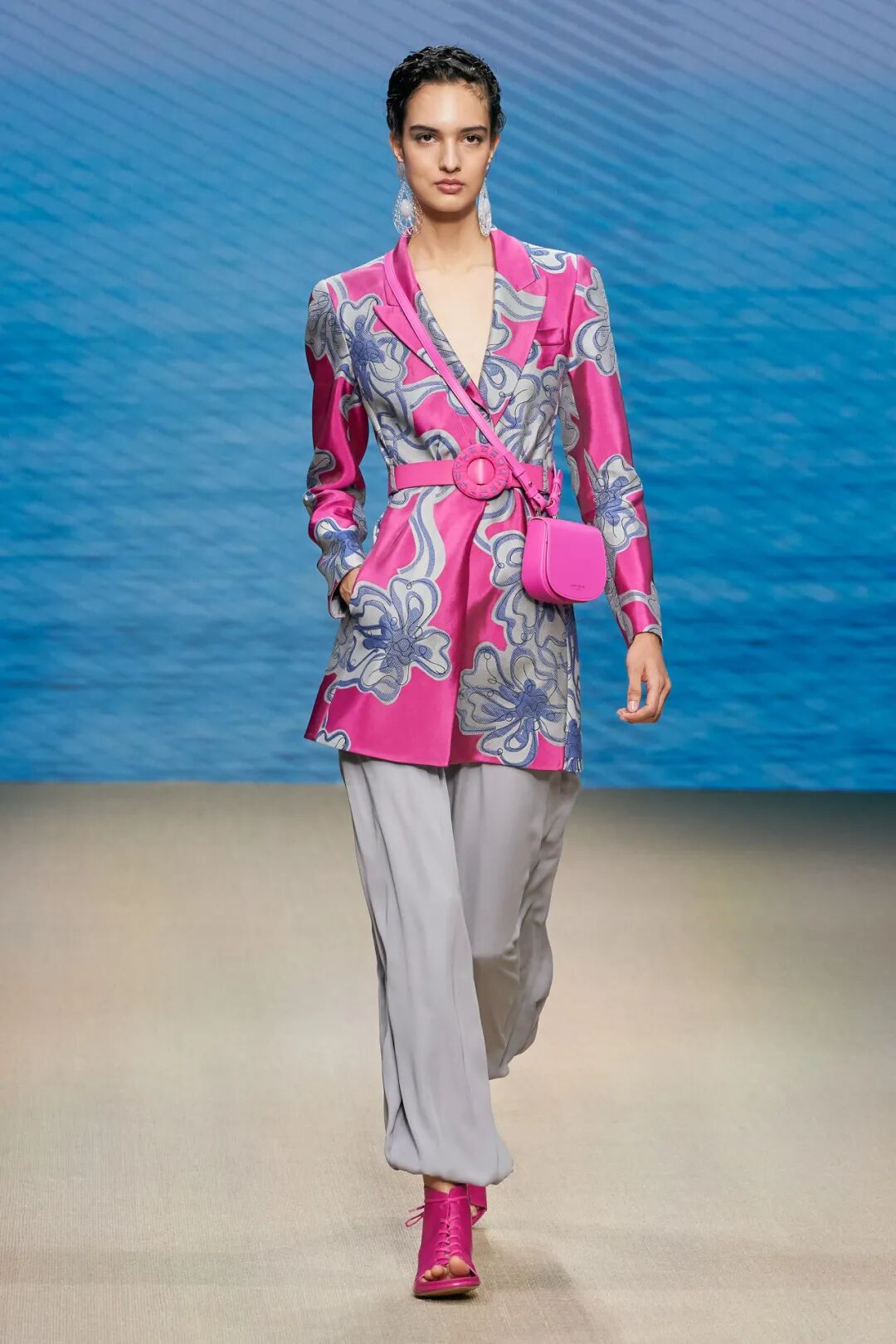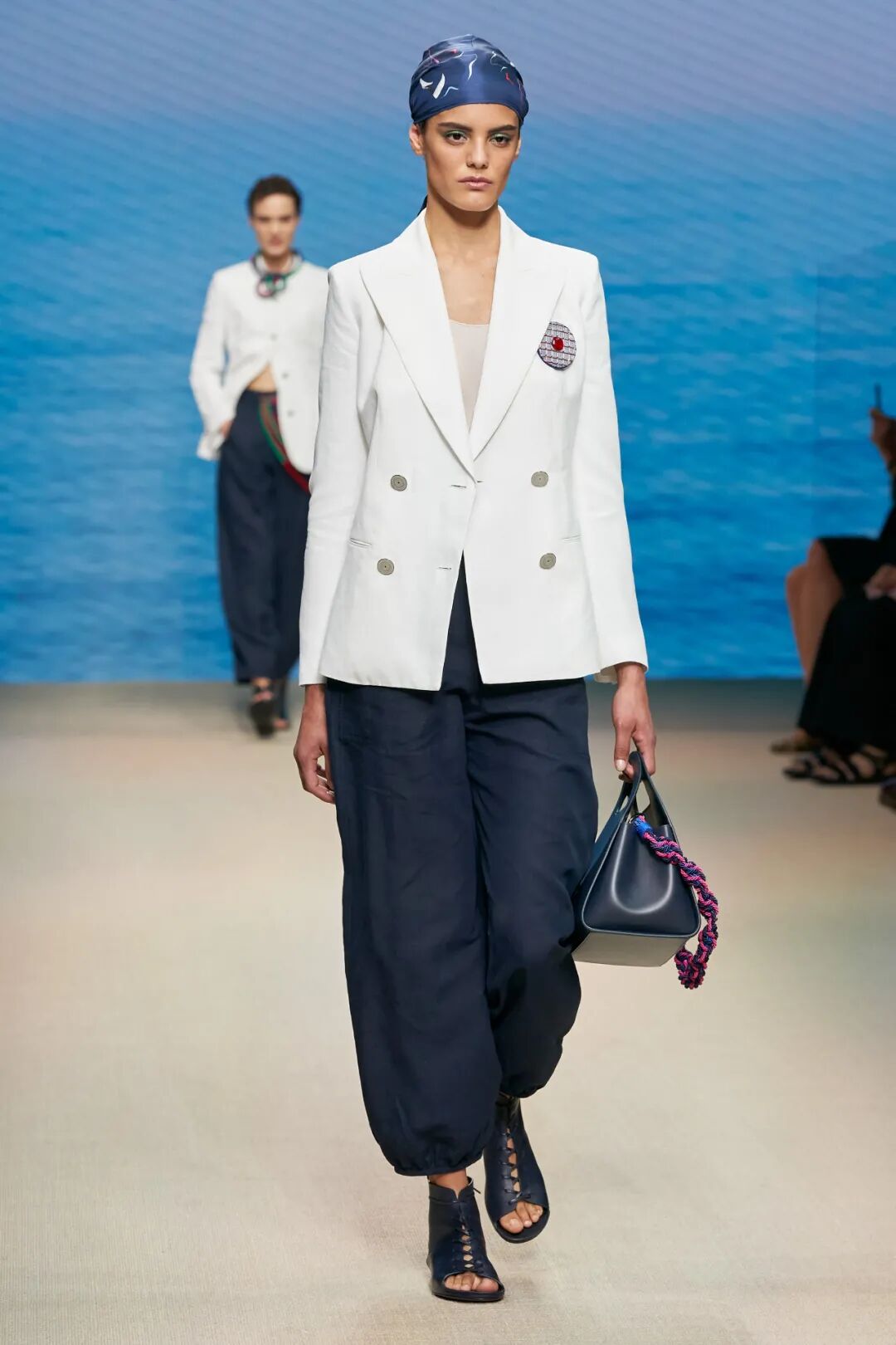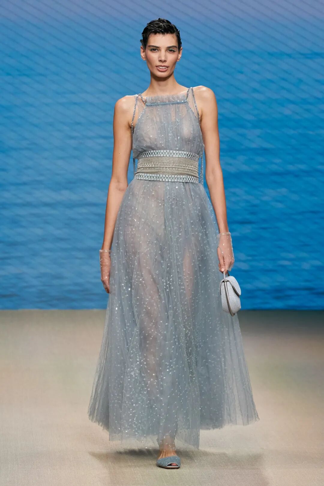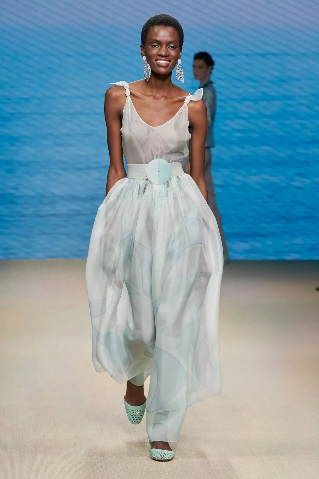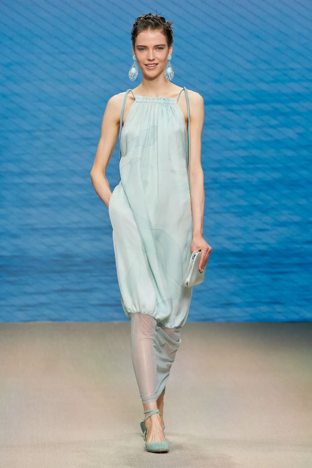 北京时间9月26日凌晨1点,Giorgio Armani 2022春夏女装系列在意大利米兰的Borgonuovo大街 21号历史剧院拉开序幕。这是品牌二十多年后再次将秀场搬回这个曾举办多场重要时装秀的标志性场地。今年87岁的Armani老先生依然积极地坚持着奋战在工作的第一线,以无穷的浪漫想象将我们带往仲夏时分的海边。在大秀开始前,品牌就在官方账号上发布了两套Giorgio Armani在上世纪90年代的女装设计,身穿时装的模特站在沙滩上,仿若海岸上的优雅美人。而“Memories of Summer(夏日记忆)”的配文,也让我们得知本季大秀的灵感来源——仲夏的蔚蓝海洋、阳光璀璨的光影变奏,以及20世纪90年代Armani曾经为我们带来的优雅着装风格。这一季,Armani 将品牌简约优雅与游牧民族气息精妙融和到时装系列里。那些绚丽的色彩、带着异域风情的装饰,如同在旅途中沿途被撷取而下,继而被赋予了时髦现代都市感,焕发出不一样的魅力,让我们再一次见证时尚的轮回。剪裁精巧的优雅套装作为第一套Look出场,从线条挺括的斜襟垫肩西装中,我们不难从中看出上世纪90年代经典西装的影子。下装部分,Armani老先生却选择了以流动的线条印花、光滑的绸缎面料打造休闲的裤装,将品牌的流线型风格展露无遗。 从面料到剪裁的变化带来随性碰撞,以及一种舒适与放松的感觉,传达着每位女性皆可随心穿搭,通过时装找到最舒服的那一个自己。随后,更柔软的绸缎风衣和衬衫上场,廓形修长流动,轻裹曼妙身躯,没有过多的繁杂设计就可让都市女性展现自身的自然优雅气质。结合着薄纱、雪纺和绸缎等材质,我们可以看到Giorgio Armani老先生将海边的波光粼粼,变幻出各种深浅不一的色彩运用到时装上,那中性柔和的色调还是Armani一贯的风格,带给视觉上更为舒适放松的时髦风格。从简约的衬衫到华丽浪漫的长款连衣裙、编织抹胸的出现,仿若白日里现代职场的活力女性,脱下束缚、换上华服,化身为夜幕下优雅的晚宴女郎。裤筒设计也变得更为宽大和飘逸,如同裙子一样,流畅的线条,微妙考究的设计,展现着Armani女性的优雅魅力。当一抹亮眼的红色出现在秀场上,昭示着太阳光线对海面的影响变化,催生出变幻莫测的美丽,大秀又掀开一场浪漫华丽的新篇章。 如同夕阳洒落海面,看着大海由蔚蓝一点点变为红色与紫色交汇的海洋,接下来登场的Armani女郎,身上的时装都被赋予了更多绚烂色彩。色彩明艳的轻质薄纱、塔夫绸赋予晚装更多的华丽和浪漫,“花朵”元素蔓延在身上,为造型增添了更多春夏的气息。随着背景色调的变化,那些极致美丽的长款礼服也幻化成不同的气质,时而静寂,时而神秘,时而绚丽,时而平和,如同大海一样有着无穷的魅力。刺绣薄纱的裙体上满布璀璨夺目的闪亮,更让礼服充满了梦幻色彩,营造出仙气满满,如同点点星光洒落在海面之上。流光溢彩的感觉,让模特仿佛踏破夜色,披着星光向我们走来,营造出甜美、大胆、无限柔和的微妙色彩。这一季,Giorgio Armani 让我们看到头饰的风潮又回来了。通过印花丝巾和钩针帽,在都市女性的时髦感和吉普赛女郎的休闲中切换两种风格,造型感十足,提升了女性柔美的气质。配饰上,夸张风格的串珠层层叠叠,呈现出带有异域感的浪漫韵味。串珠缠绕在身上作为点缀,为日常衣柜注入了更多的奇思妙想。夸张的亚克力耳环依然是造型的亮点之一,毋庸置疑,不管什么时候一副耀眼的耳饰就能够增加隆重感。包袋设计上,Giorgio Armani 增添了大胆的流线型设计。手提包的提手、包身线条都带弧形,让包包的风格变得更为优雅。而更大钩针单肩包和刺绣亮片包包上也体现到这种流线型设计,尤其在提手部分,细节处更有设计感。其实不管是时髦的都市女性,还是浪漫的吉普赛女郎,在Giorgio Armani的时装下,优雅始终都是她们形象中不变的内核。Giorgio Armani 以想象赋予现代女性随性、自在的优雅气质,正如他所说过的那样:Elegence is not about noticed,it's about being remebered.(真正的优雅不是惹人注意,而是被人铭记。)