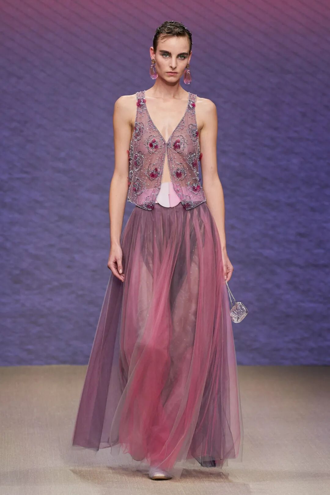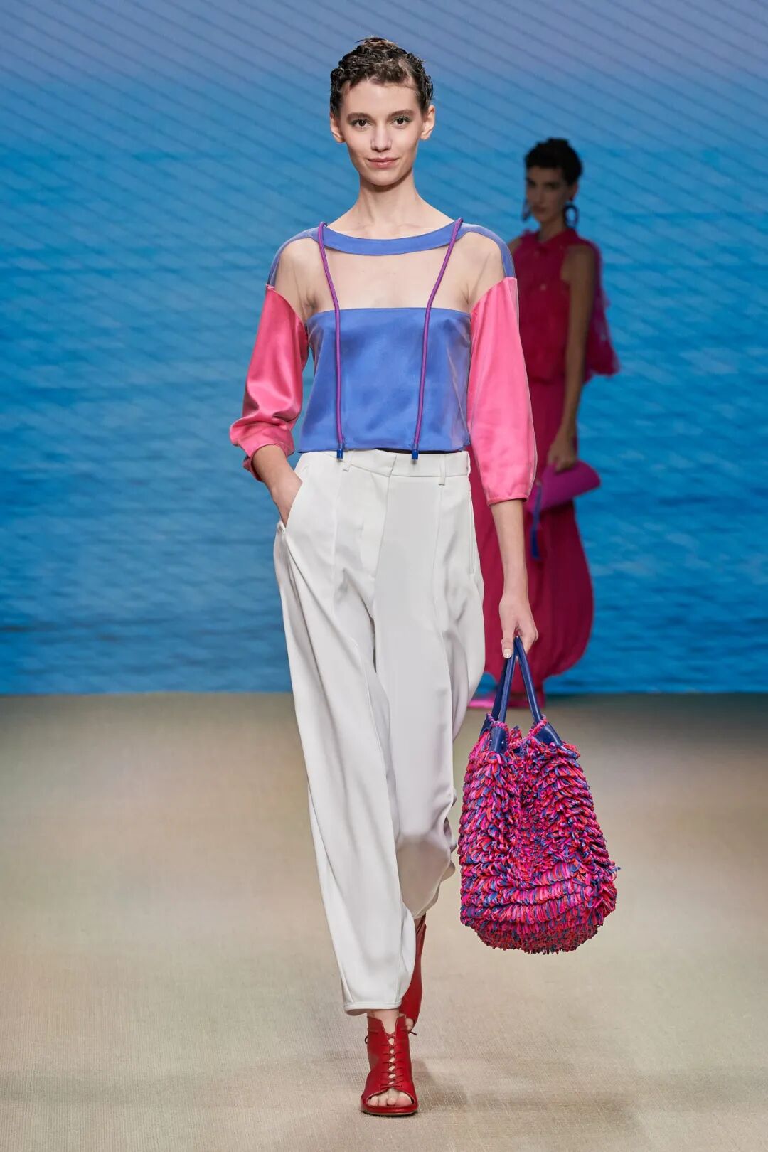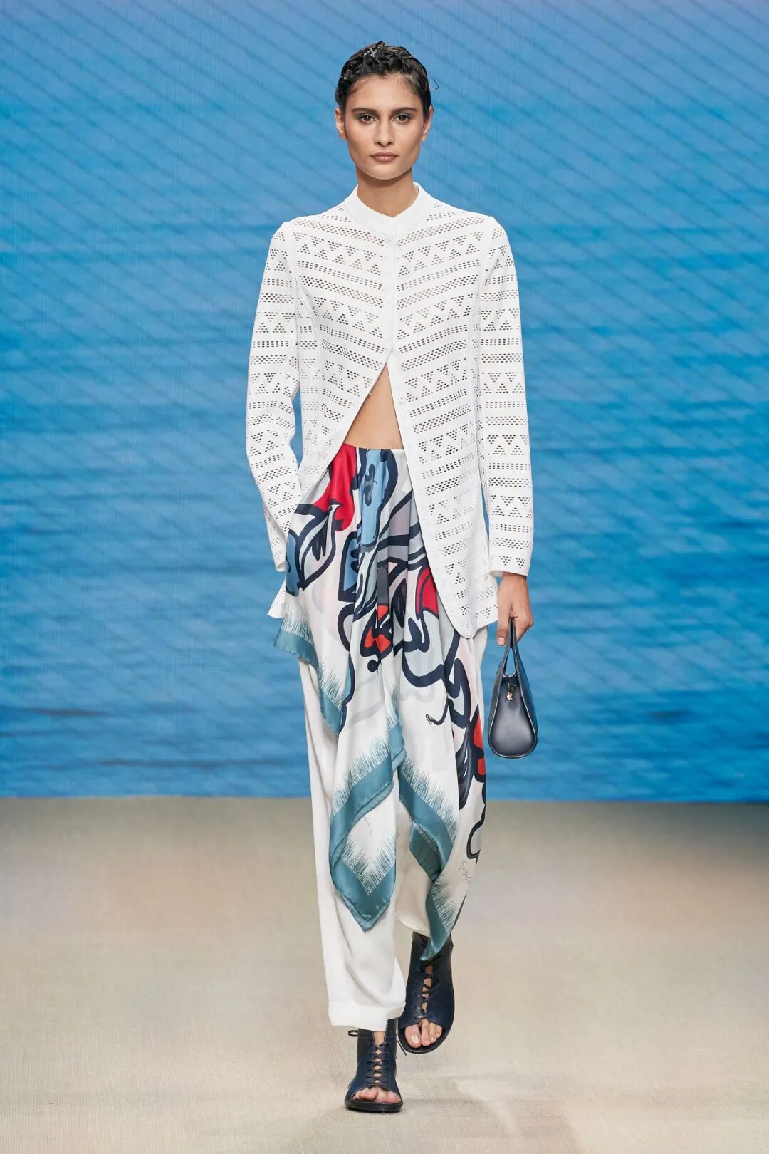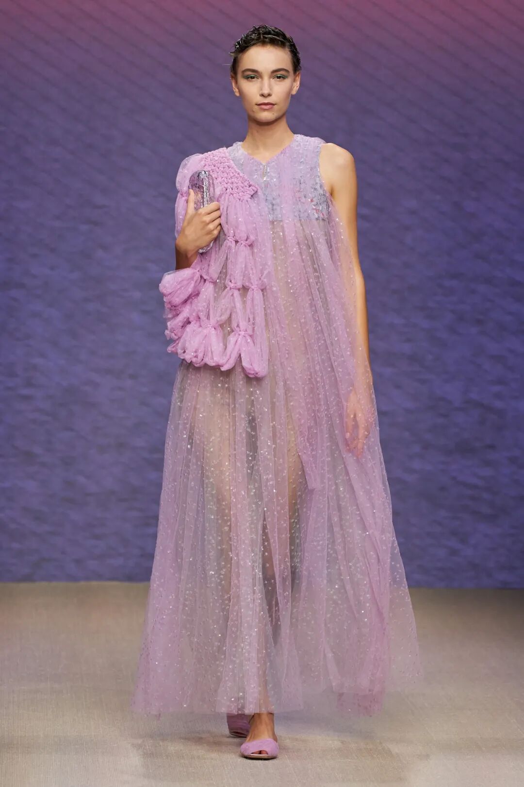 北京时间9月26日凌晨1点,Giorgio Armani 2022春夏女装系列在意大利米兰的Borgonuovo大街 21号历史剧院拉开序幕。这是品牌二十多年后再次将秀场搬回这个曾举办多场重要时装秀的标志性场地。今年87岁的Armani老先生依然积极地坚持着奋战在工作的第一线,以无穷的浪漫想象将我们带往仲夏时分的海边。在大秀开始前,品牌就在官方账号上发布了两套Giorgio Armani在上世纪90年代的女装设计,身穿时装的模特站在沙滩上,仿若海岸上的优雅美人。而“Memories of Summer(夏日记忆)”的配文,也让我们得知本季大秀的灵感来源——仲夏的蔚蓝海洋、阳光璀璨的光影变奏,以及20世纪90年代Armani曾经为我们带来的优雅着装风格。这一季,Armani 将品牌简约优雅与游牧民族气息精妙融和到时装系列里。那些绚丽的色彩、带着异域风情的装饰,如同在旅途中沿途被撷取而下,继而被赋予了时髦现代都市感,焕发出不一样的魅力,让我们再一次见证时尚的轮回。剪裁精巧的优雅套装作为第一套Look出场,从线条挺括的斜襟垫肩西装中,我们不难从中看出上世纪90年代经典西装的影子。下装部分,Armani老先生却选择了以流动的线条印花、光滑的绸缎面料打造休闲的裤装,将品牌的流线型风格展露无遗。 从面料到剪裁的变化带来随性碰撞,以及一种舒适与放松的感觉,传达着每位女性皆可随心穿搭,通过时装找到最舒服的那一个自己。随后,更柔软的绸缎风衣和衬衫上场,廓形修长流动,轻裹曼妙身躯,没有过多的繁杂设计就可让都市女性展现自身的自然优雅气质。结合着薄纱、雪纺和绸缎等材质,我们可以看到Giorgio Armani老先生将海边的波光粼粼,变幻出各种深浅不一的色彩运用到时装上,那中性柔和的色调还是Armani一贯的风格,带给视觉上更为舒适放松的时髦风格。从简约的衬衫到华丽浪漫的长款连衣裙、编织抹胸的出现,仿若白日里现代职场的活力女性,脱下束缚、换上华服,化身为夜幕下优雅的晚宴女郎。裤筒设计也变得更为宽大和飘逸,如同裙子一样,流畅的线条,微妙考究的设计,展现着Armani女性的优雅魅力。当一抹亮眼的红色出现在秀场上,昭示着太阳光线对海面的影响变化,催生出变幻莫测的美丽,大秀又掀开一场浪漫华丽的新篇章。 如同夕阳洒落海面,看着大海由蔚蓝一点点变为红色与紫色交汇的海洋,接下来登场的Armani女郎,身上的时装都被赋予了更多绚烂色彩。色彩明艳的轻质薄纱、塔夫绸赋予晚装更多的华丽和浪漫,“花朵”元素蔓延在身上,为造型增添了更多春夏的气息。随着背景色调的变化,那些极致美丽的长款礼服也幻化成不同的气质,时而静寂,时而神秘,时而绚丽,时而平和,如同大海一样有着无穷的魅力。刺绣薄纱的裙体上满布璀璨夺目的闪亮,更让礼服充满了梦幻色彩,营造出仙气满满,如同点点星光洒落在海面之上。流光溢彩的感觉,让模特仿佛踏破夜色,披着星光向我们走来,营造出甜美、大胆、无限柔和的微妙色彩。这一季,Giorgio Armani 让我们看到头饰的风潮又回来了。通过印花丝巾和钩针帽,在都市女性的时髦感和吉普赛女郎的休闲中切换两种风格,造型感十足,提升了女性柔美的气质。配饰上,夸张风格的串珠层层叠叠,呈现出带有异域感的浪漫韵味。串珠缠绕在身上作为点缀,为日常衣柜注入了更多的奇思妙想。夸张的亚克力耳环依然是造型的亮点之一,毋庸置疑,不管什么时候一副耀眼的耳饰就能够增加隆重感。包袋设计上,Giorgio Armani 增添了大胆的流线型设计。手提包的提手、包身线条都带弧形,让包包的风格变得更为优雅。而更大钩针单肩包和刺绣亮片包包上也体现到这种流线型设计,尤其在提手部分,细节处更有设计感。其实不管是时髦的都市女性,还是浪漫的吉普赛女郎,在Giorgio Armani的时装下,优雅始终都是她们形象中不变的内核。Giorgio Armani 以想象赋予现代女性随性、自在的优雅气质,正如他所说过的那样:Elegence is not about noticed,it's about being remebered.(真正的优雅不是惹人注意,而是被人铭记。)