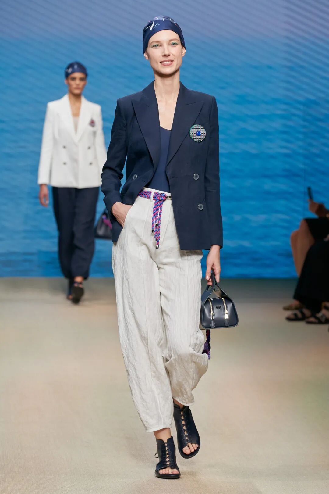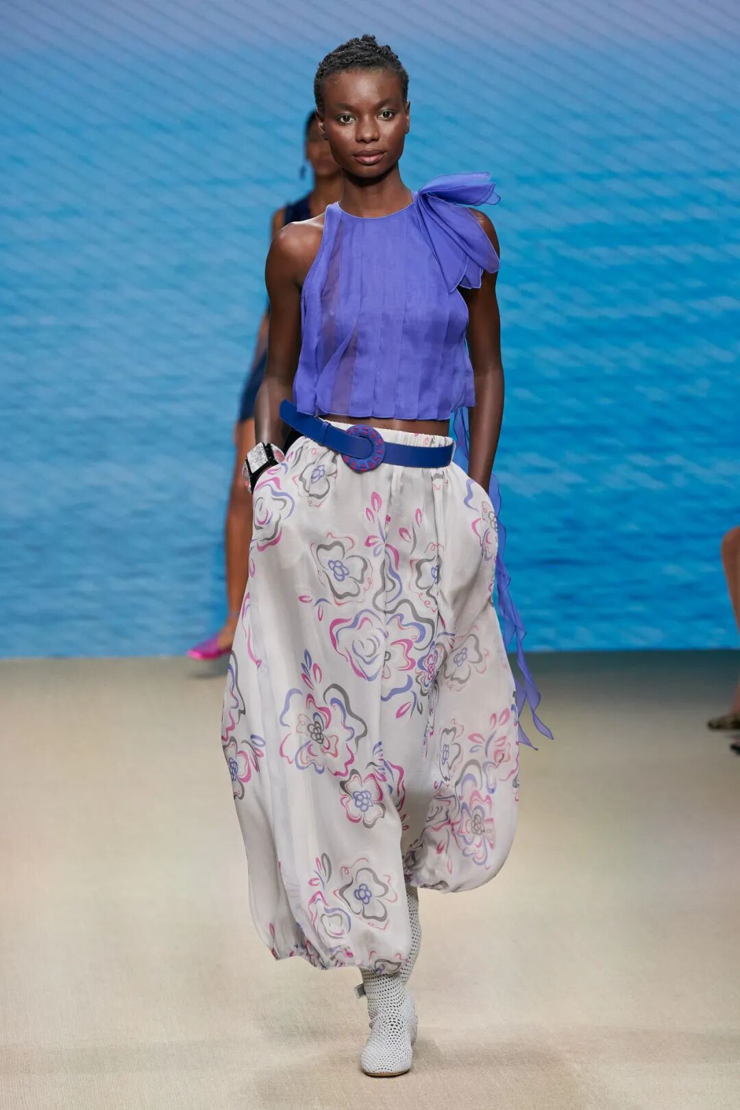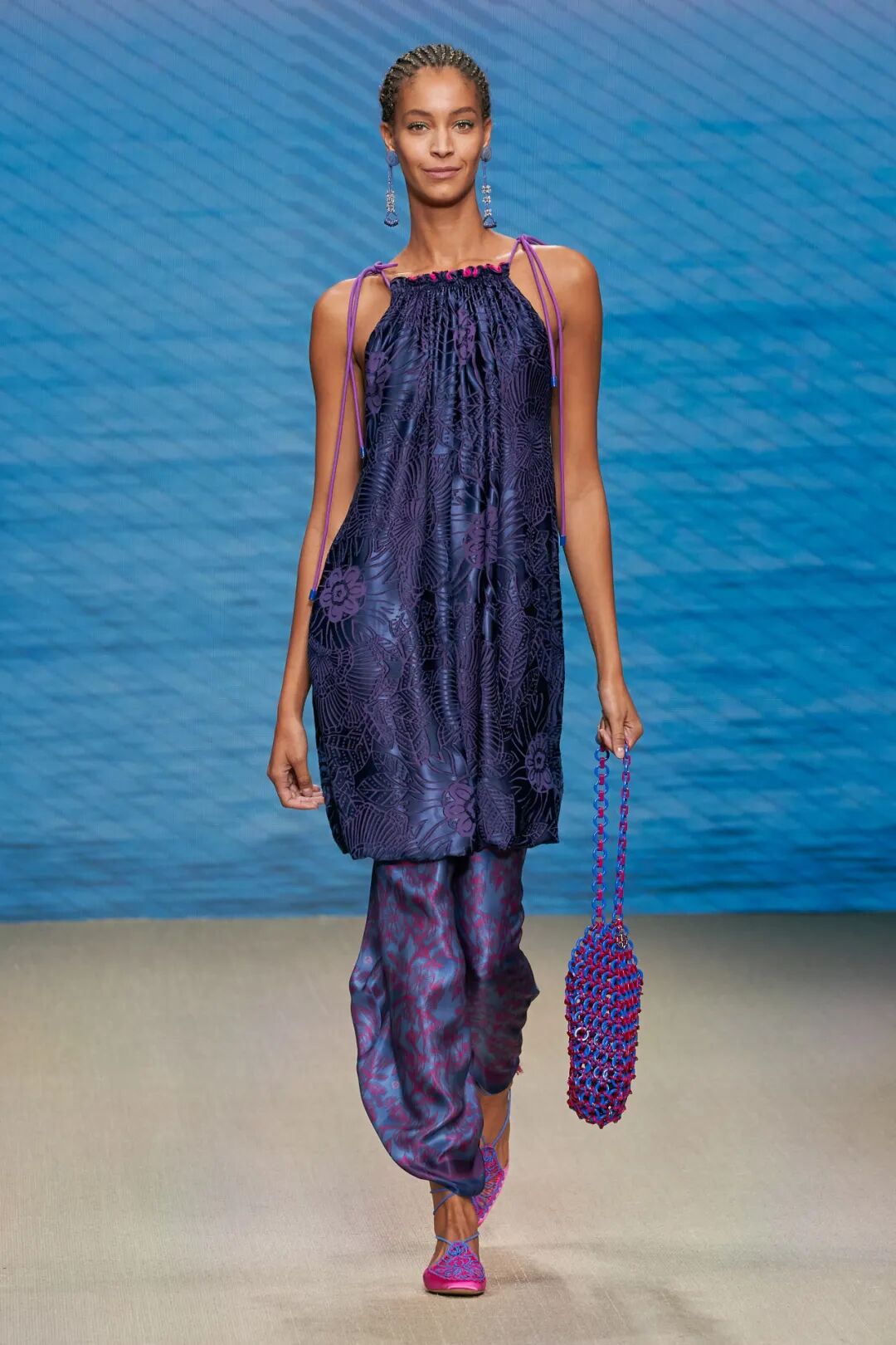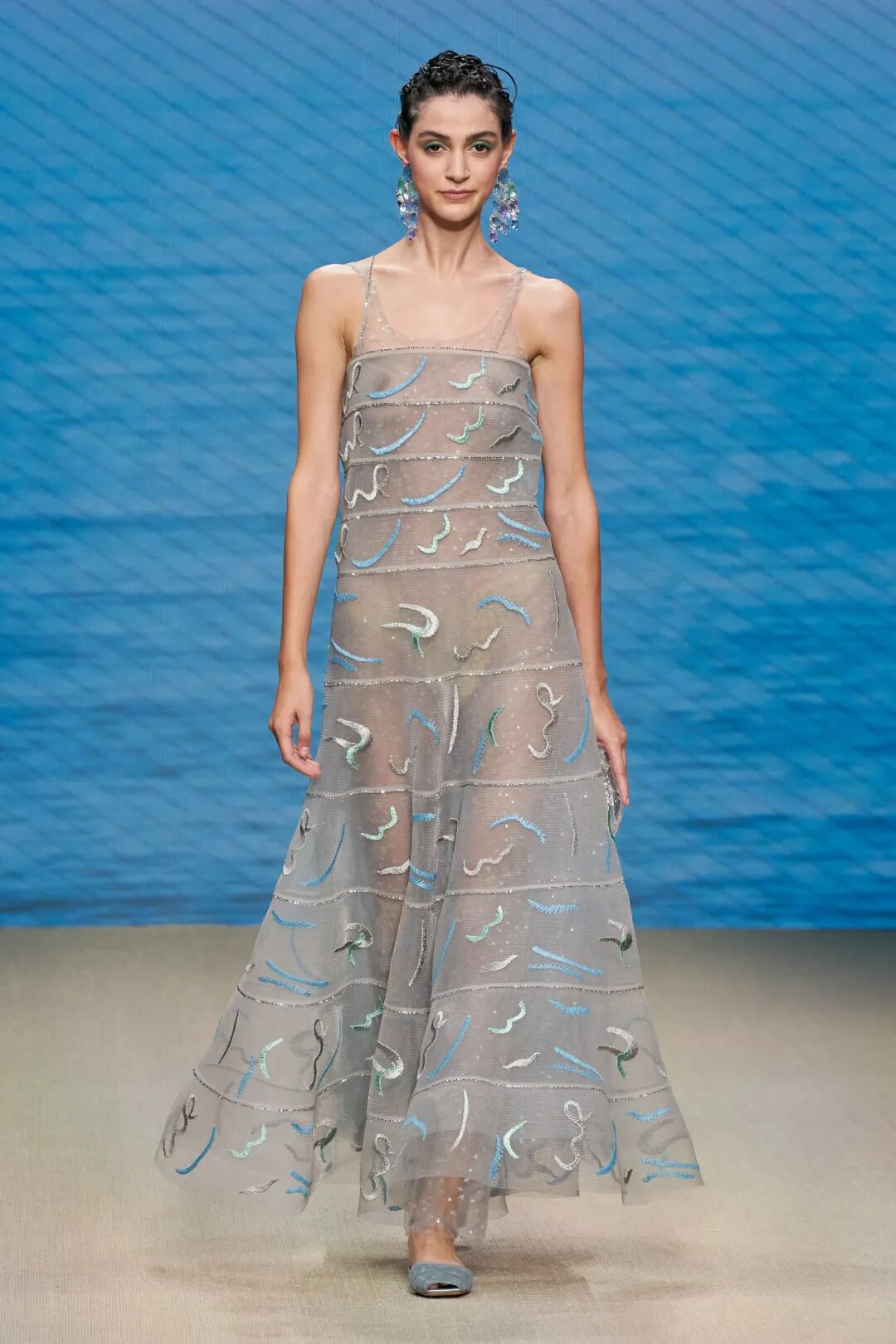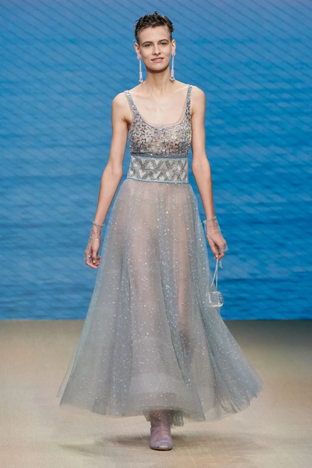 北京时间9月26日凌晨1点,Giorgio Armani 2022春夏女装系列在意大利米兰的Borgonuovo大街 21号历史剧院拉开序幕。这是品牌二十多年后再次将秀场搬回这个曾举办多场重要时装秀的标志性场地。今年87岁的Armani老先生依然积极地坚持着奋战在工作的第一线,以无穷的浪漫想象将我们带往仲夏时分的海边。在大秀开始前,品牌就在官方账号上发布了两套Giorgio Armani在上世纪90年代的女装设计,身穿时装的模特站在沙滩上,仿若海岸上的优雅美人。而“Memories of Summer(夏日记忆)”的配文,也让我们得知本季大秀的灵感来源——仲夏的蔚蓝海洋、阳光璀璨的光影变奏,以及20世纪90年代Armani曾经为我们带来的优雅着装风格。这一季,Armani 将品牌简约优雅与游牧民族气息精妙融和到时装系列里。那些绚丽的色彩、带着异域风情的装饰,如同在旅途中沿途被撷取而下,继而被赋予了时髦现代都市感,焕发出不一样的魅力,让我们再一次见证时尚的轮回。剪裁精巧的优雅套装作为第一套Look出场,从线条挺括的斜襟垫肩西装中,我们不难从中看出上世纪90年代经典西装的影子。下装部分,Armani老先生却选择了以流动的线条印花、光滑的绸缎面料打造休闲的裤装,将品牌的流线型风格展露无遗。 从面料到剪裁的变化带来随性碰撞,以及一种舒适与放松的感觉,传达着每位女性皆可随心穿搭,通过时装找到最舒服的那一个自己。随后,更柔软的绸缎风衣和衬衫上场,廓形修长流动,轻裹曼妙身躯,没有过多的繁杂设计就可让都市女性展现自身的自然优雅气质。结合着薄纱、雪纺和绸缎等材质,我们可以看到Giorgio Armani老先生将海边的波光粼粼,变幻出各种深浅不一的色彩运用到时装上,那中性柔和的色调还是Armani一贯的风格,带给视觉上更为舒适放松的时髦风格。从简约的衬衫到华丽浪漫的长款连衣裙、编织抹胸的出现,仿若白日里现代职场的活力女性,脱下束缚、换上华服,化身为夜幕下优雅的晚宴女郎。裤筒设计也变得更为宽大和飘逸,如同裙子一样,流畅的线条,微妙考究的设计,展现着Armani女性的优雅魅力。当一抹亮眼的红色出现在秀场上,昭示着太阳光线对海面的影响变化,催生出变幻莫测的美丽,大秀又掀开一场浪漫华丽的新篇章。 如同夕阳洒落海面,看着大海由蔚蓝一点点变为红色与紫色交汇的海洋,接下来登场的Armani女郎,身上的时装都被赋予了更多绚烂色彩。色彩明艳的轻质薄纱、塔夫绸赋予晚装更多的华丽和浪漫,“花朵”元素蔓延在身上,为造型增添了更多春夏的气息。随着背景色调的变化,那些极致美丽的长款礼服也幻化成不同的气质,时而静寂,时而神秘,时而绚丽,时而平和,如同大海一样有着无穷的魅力。刺绣薄纱的裙体上满布璀璨夺目的闪亮,更让礼服充满了梦幻色彩,营造出仙气满满,如同点点星光洒落在海面之上。流光溢彩的感觉,让模特仿佛踏破夜色,披着星光向我们走来,营造出甜美、大胆、无限柔和的微妙色彩。这一季,Giorgio Armani 让我们看到头饰的风潮又回来了。通过印花丝巾和钩针帽,在都市女性的时髦感和吉普赛女郎的休闲中切换两种风格,造型感十足,提升了女性柔美的气质。配饰上,夸张风格的串珠层层叠叠,呈现出带有异域感的浪漫韵味。串珠缠绕在身上作为点缀,为日常衣柜注入了更多的奇思妙想。夸张的亚克力耳环依然是造型的亮点之一,毋庸置疑,不管什么时候一副耀眼的耳饰就能够增加隆重感。包袋设计上,Giorgio Armani 增添了大胆的流线型设计。手提包的提手、包身线条都带弧形,让包包的风格变得更为优雅。而更大钩针单肩包和刺绣亮片包包上也体现到这种流线型设计,尤其在提手部分,细节处更有设计感。其实不管是时髦的都市女性,还是浪漫的吉普赛女郎,在Giorgio Armani的时装下,优雅始终都是她们形象中不变的内核。Giorgio Armani 以想象赋予现代女性随性、自在的优雅气质,正如他所说过的那样:Elegence is not about noticed,it's about being remebered.(真正的优雅不是惹人注意,而是被人铭记。)