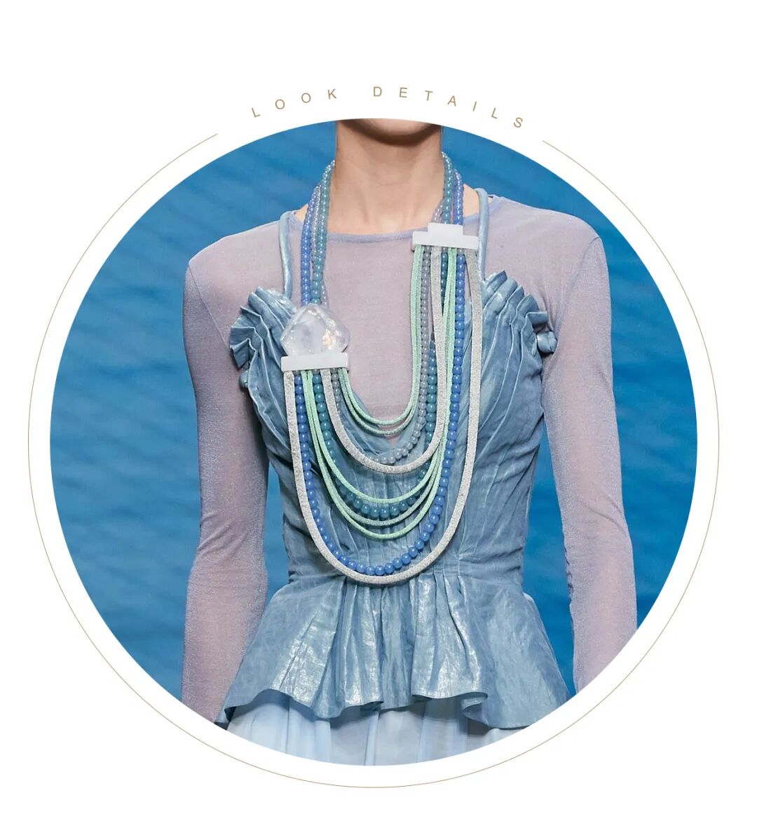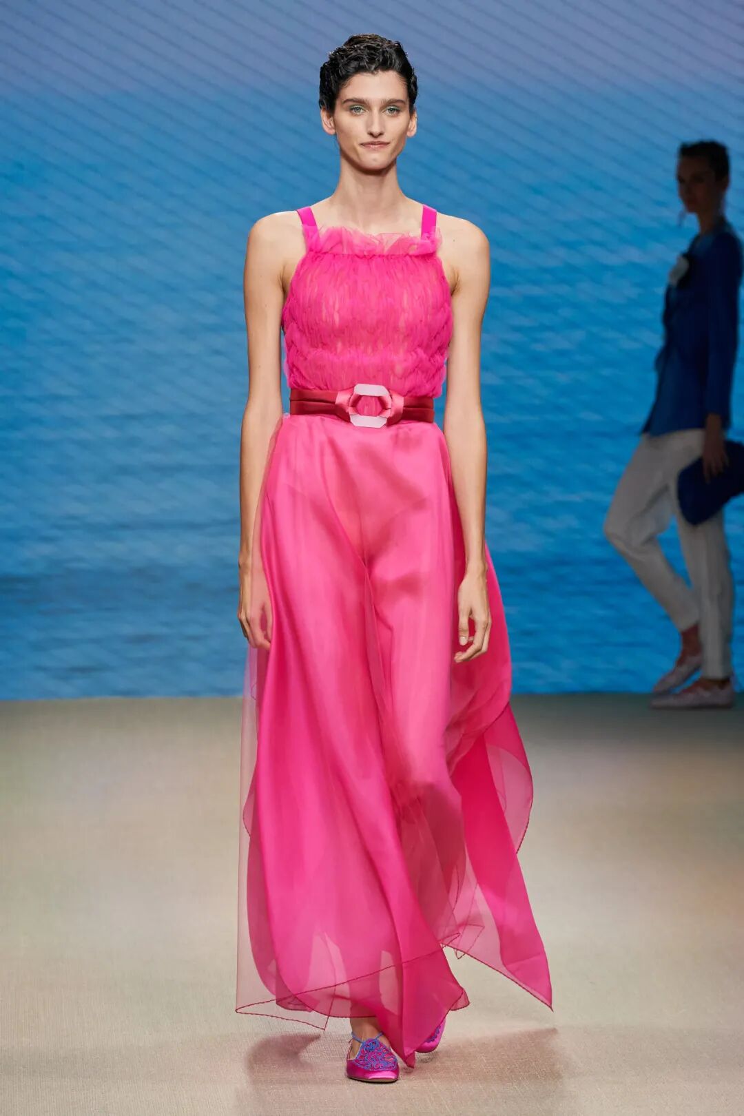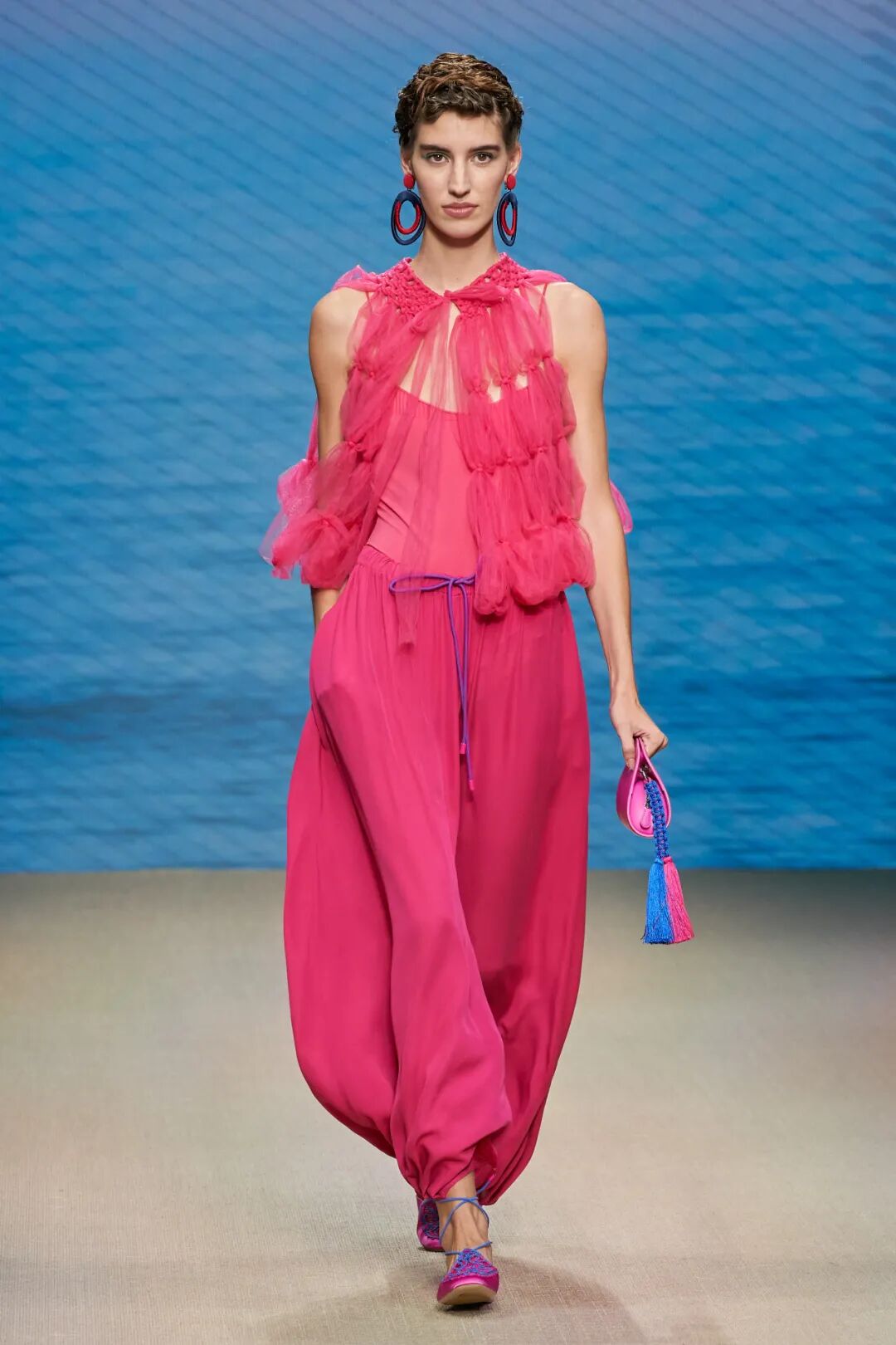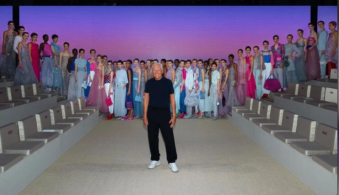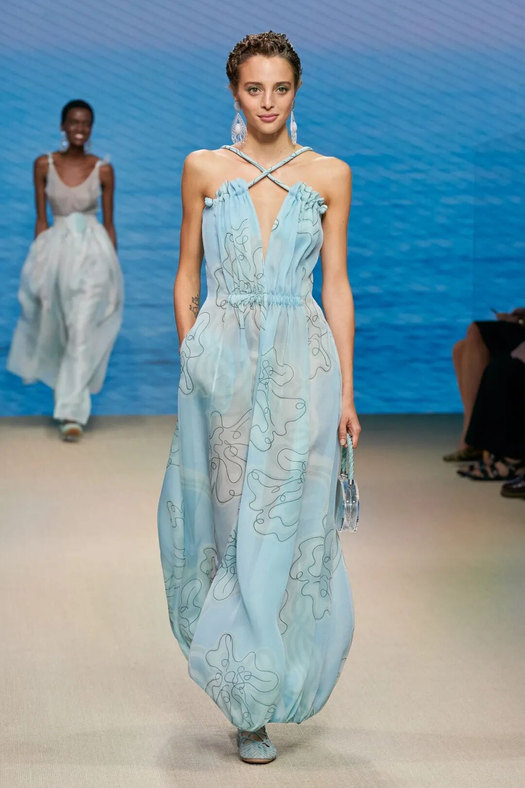 北京时间9月26日凌晨1点,Giorgio Armani 2022春夏女装系列在意大利米兰的Borgonuovo大街 21号历史剧院拉开序幕。这是品牌二十多年后再次将秀场搬回这个曾举办多场重要时装秀的标志性场地。今年87岁的Armani老先生依然积极地坚持着奋战在工作的第一线,以无穷的浪漫想象将我们带往仲夏时分的海边。在大秀开始前,品牌就在官方账号上发布了两套Giorgio Armani在上世纪90年代的女装设计,身穿时装的模特站在沙滩上,仿若海岸上的优雅美人。而“Memories of Summer(夏日记忆)”的配文,也让我们得知本季大秀的灵感来源——仲夏的蔚蓝海洋、阳光璀璨的光影变奏,以及20世纪90年代Armani曾经为我们带来的优雅着装风格。这一季,Armani 将品牌简约优雅与游牧民族气息精妙融和到时装系列里。那些绚丽的色彩、带着异域风情的装饰,如同在旅途中沿途被撷取而下,继而被赋予了时髦现代都市感,焕发出不一样的魅力,让我们再一次见证时尚的轮回。剪裁精巧的优雅套装作为第一套Look出场,从线条挺括的斜襟垫肩西装中,我们不难从中看出上世纪90年代经典西装的影子。下装部分,Armani老先生却选择了以流动的线条印花、光滑的绸缎面料打造休闲的裤装,将品牌的流线型风格展露无遗。 从面料到剪裁的变化带来随性碰撞,以及一种舒适与放松的感觉,传达着每位女性皆可随心穿搭,通过时装找到最舒服的那一个自己。随后,更柔软的绸缎风衣和衬衫上场,廓形修长流动,轻裹曼妙身躯,没有过多的繁杂设计就可让都市女性展现自身的自然优雅气质。结合着薄纱、雪纺和绸缎等材质,我们可以看到Giorgio Armani老先生将海边的波光粼粼,变幻出各种深浅不一的色彩运用到时装上,那中性柔和的色调还是Armani一贯的风格,带给视觉上更为舒适放松的时髦风格。从简约的衬衫到华丽浪漫的长款连衣裙、编织抹胸的出现,仿若白日里现代职场的活力女性,脱下束缚、换上华服,化身为夜幕下优雅的晚宴女郎。裤筒设计也变得更为宽大和飘逸,如同裙子一样,流畅的线条,微妙考究的设计,展现着Armani女性的优雅魅力。当一抹亮眼的红色出现在秀场上,昭示着太阳光线对海面的影响变化,催生出变幻莫测的美丽,大秀又掀开一场浪漫华丽的新篇章。 如同夕阳洒落海面,看着大海由蔚蓝一点点变为红色与紫色交汇的海洋,接下来登场的Armani女郎,身上的时装都被赋予了更多绚烂色彩。色彩明艳的轻质薄纱、塔夫绸赋予晚装更多的华丽和浪漫,“花朵”元素蔓延在身上,为造型增添了更多春夏的气息。随着背景色调的变化,那些极致美丽的长款礼服也幻化成不同的气质,时而静寂,时而神秘,时而绚丽,时而平和,如同大海一样有着无穷的魅力。刺绣薄纱的裙体上满布璀璨夺目的闪亮,更让礼服充满了梦幻色彩,营造出仙气满满,如同点点星光洒落在海面之上。流光溢彩的感觉,让模特仿佛踏破夜色,披着星光向我们走来,营造出甜美、大胆、无限柔和的微妙色彩。这一季,Giorgio Armani 让我们看到头饰的风潮又回来了。通过印花丝巾和钩针帽,在都市女性的时髦感和吉普赛女郎的休闲中切换两种风格,造型感十足,提升了女性柔美的气质。配饰上,夸张风格的串珠层层叠叠,呈现出带有异域感的浪漫韵味。串珠缠绕在身上作为点缀,为日常衣柜注入了更多的奇思妙想。夸张的亚克力耳环依然是造型的亮点之一,毋庸置疑,不管什么时候一副耀眼的耳饰就能够增加隆重感。包袋设计上,Giorgio Armani 增添了大胆的流线型设计。手提包的提手、包身线条都带弧形,让包包的风格变得更为优雅。而更大钩针单肩包和刺绣亮片包包上也体现到这种流线型设计,尤其在提手部分,细节处更有设计感。其实不管是时髦的都市女性,还是浪漫的吉普赛女郎,在Giorgio Armani的时装下,优雅始终都是她们形象中不变的内核。Giorgio Armani 以想象赋予现代女性随性、自在的优雅气质,正如他所说过的那样:Elegence is not about noticed,it's about being remebered.(真正的优雅不是惹人注意,而是被人铭记。)