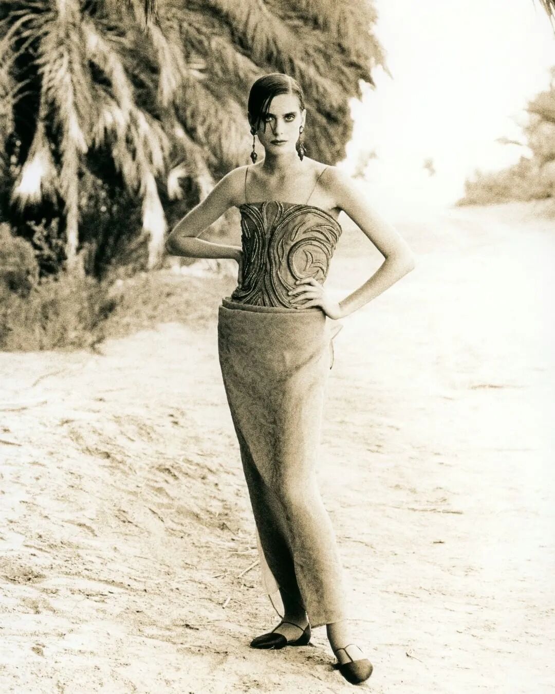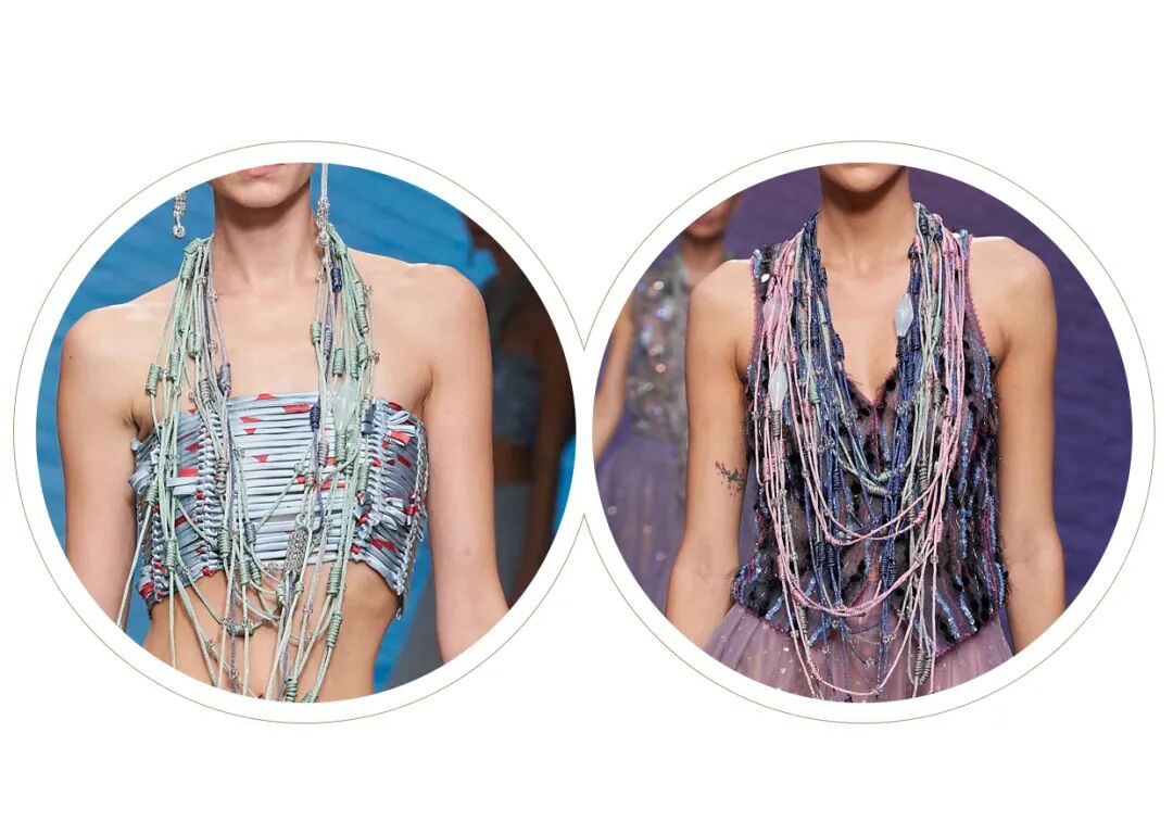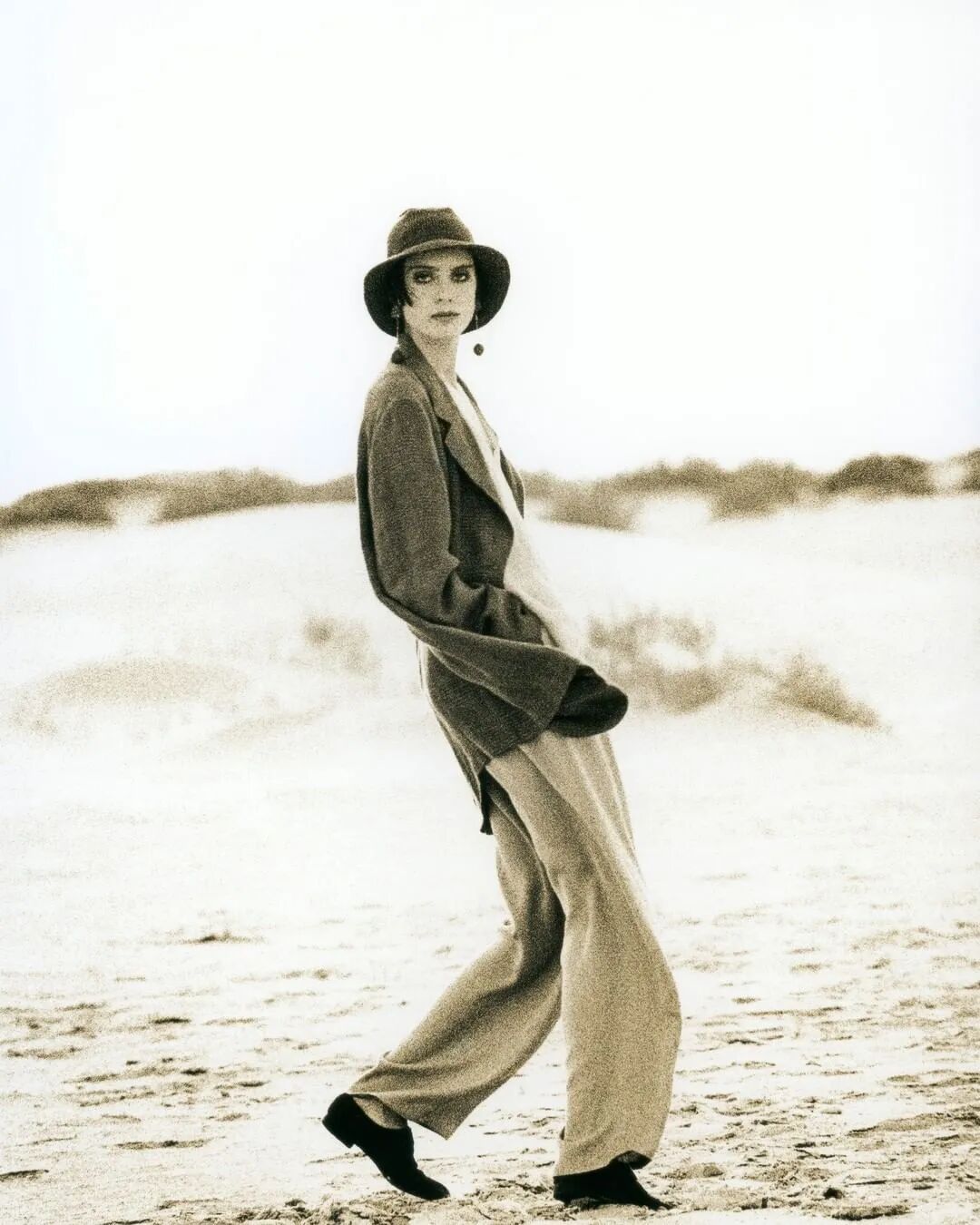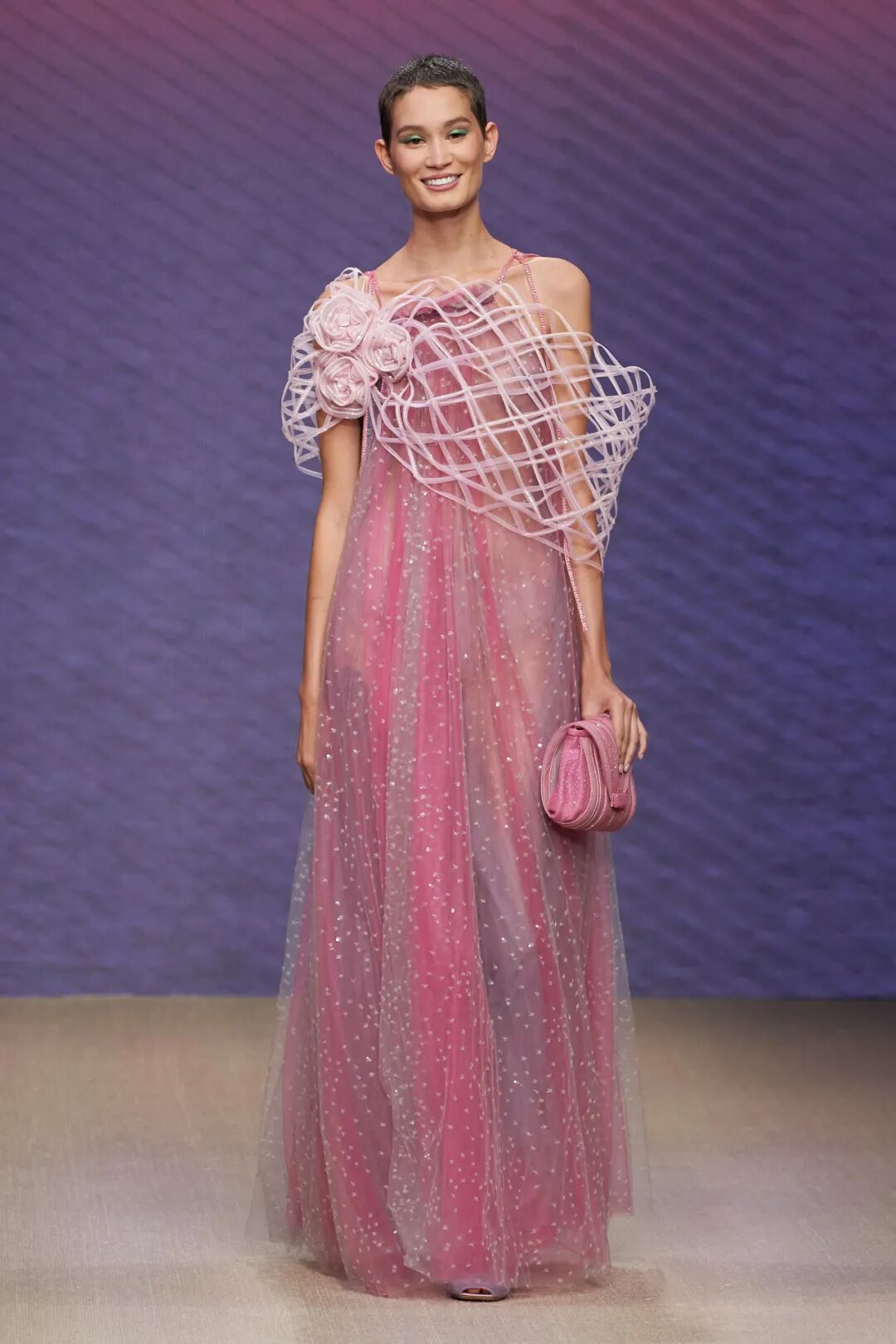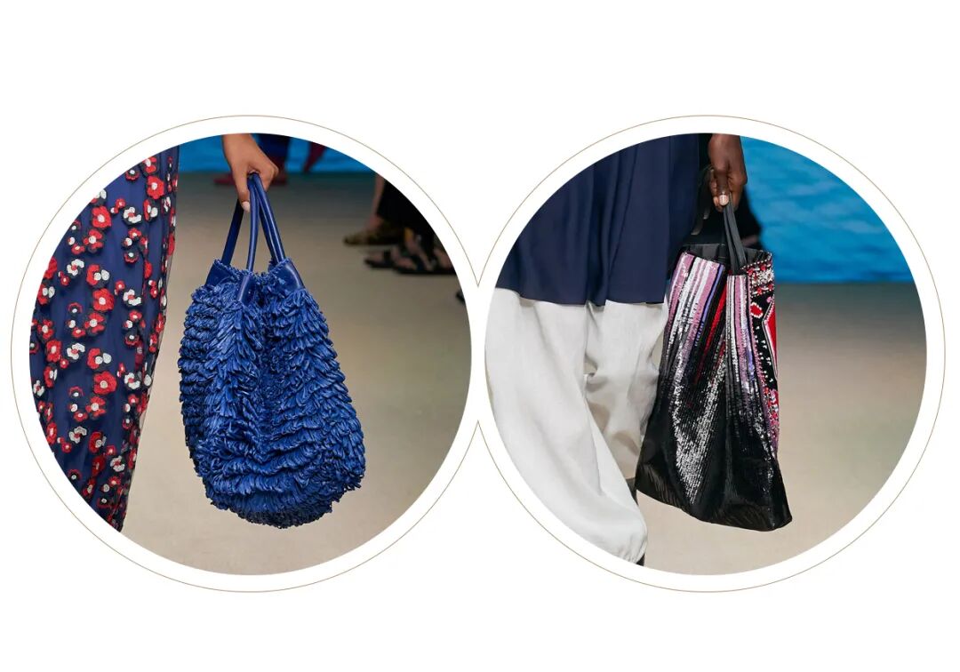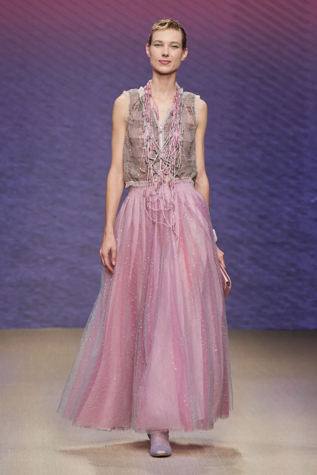 北京时间9月26日凌晨1点,Giorgio Armani 2022春夏女装系列在意大利米兰的Borgonuovo大街 21号历史剧院拉开序幕。这是品牌二十多年后再次将秀场搬回这个曾举办多场重要时装秀的标志性场地。今年87岁的Armani老先生依然积极地坚持着奋战在工作的第一线,以无穷的浪漫想象将我们带往仲夏时分的海边。在大秀开始前,品牌就在官方账号上发布了两套Giorgio Armani在上世纪90年代的女装设计,身穿时装的模特站在沙滩上,仿若海岸上的优雅美人。而“Memories of Summer(夏日记忆)”的配文,也让我们得知本季大秀的灵感来源——仲夏的蔚蓝海洋、阳光璀璨的光影变奏,以及20世纪90年代Armani曾经为我们带来的优雅着装风格。这一季,Armani 将品牌简约优雅与游牧民族气息精妙融和到时装系列里。那些绚丽的色彩、带着异域风情的装饰,如同在旅途中沿途被撷取而下,继而被赋予了时髦现代都市感,焕发出不一样的魅力,让我们再一次见证时尚的轮回。剪裁精巧的优雅套装作为第一套Look出场,从线条挺括的斜襟垫肩西装中,我们不难从中看出上世纪90年代经典西装的影子。下装部分,Armani老先生却选择了以流动的线条印花、光滑的绸缎面料打造休闲的裤装,将品牌的流线型风格展露无遗。 从面料到剪裁的变化带来随性碰撞,以及一种舒适与放松的感觉,传达着每位女性皆可随心穿搭,通过时装找到最舒服的那一个自己。随后,更柔软的绸缎风衣和衬衫上场,廓形修长流动,轻裹曼妙身躯,没有过多的繁杂设计就可让都市女性展现自身的自然优雅气质。结合着薄纱、雪纺和绸缎等材质,我们可以看到Giorgio Armani老先生将海边的波光粼粼,变幻出各种深浅不一的色彩运用到时装上,那中性柔和的色调还是Armani一贯的风格,带给视觉上更为舒适放松的时髦风格。从简约的衬衫到华丽浪漫的长款连衣裙、编织抹胸的出现,仿若白日里现代职场的活力女性,脱下束缚、换上华服,化身为夜幕下优雅的晚宴女郎。裤筒设计也变得更为宽大和飘逸,如同裙子一样,流畅的线条,微妙考究的设计,展现着Armani女性的优雅魅力。当一抹亮眼的红色出现在秀场上,昭示着太阳光线对海面的影响变化,催生出变幻莫测的美丽,大秀又掀开一场浪漫华丽的新篇章。 如同夕阳洒落海面,看着大海由蔚蓝一点点变为红色与紫色交汇的海洋,接下来登场的Armani女郎,身上的时装都被赋予了更多绚烂色彩。色彩明艳的轻质薄纱、塔夫绸赋予晚装更多的华丽和浪漫,“花朵”元素蔓延在身上,为造型增添了更多春夏的气息。随着背景色调的变化,那些极致美丽的长款礼服也幻化成不同的气质,时而静寂,时而神秘,时而绚丽,时而平和,如同大海一样有着无穷的魅力。刺绣薄纱的裙体上满布璀璨夺目的闪亮,更让礼服充满了梦幻色彩,营造出仙气满满,如同点点星光洒落在海面之上。流光溢彩的感觉,让模特仿佛踏破夜色,披着星光向我们走来,营造出甜美、大胆、无限柔和的微妙色彩。这一季,Giorgio Armani 让我们看到头饰的风潮又回来了。通过印花丝巾和钩针帽,在都市女性的时髦感和吉普赛女郎的休闲中切换两种风格,造型感十足,提升了女性柔美的气质。配饰上,夸张风格的串珠层层叠叠,呈现出带有异域感的浪漫韵味。串珠缠绕在身上作为点缀,为日常衣柜注入了更多的奇思妙想。夸张的亚克力耳环依然是造型的亮点之一,毋庸置疑,不管什么时候一副耀眼的耳饰就能够增加隆重感。包袋设计上,Giorgio Armani 增添了大胆的流线型设计。手提包的提手、包身线条都带弧形,让包包的风格变得更为优雅。而更大钩针单肩包和刺绣亮片包包上也体现到这种流线型设计,尤其在提手部分,细节处更有设计感。其实不管是时髦的都市女性,还是浪漫的吉普赛女郎,在Giorgio Armani的时装下,优雅始终都是她们形象中不变的内核。Giorgio Armani 以想象赋予现代女性随性、自在的优雅气质,正如他所说过的那样:Elegence is not about noticed,it's about being remebered.(真正的优雅不是惹人注意,而是被人铭记。)