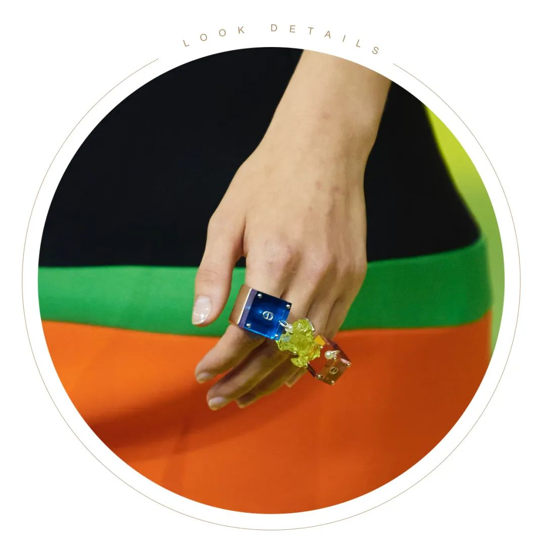 这时正在跳摇摆舞的女郎穿着黑白短裙,总觉得指尖缺少一点色彩,来呼应此时五光十色的舞厅,于是她们戴上了亚克力戒指,放肆地叠搭让指尖的色彩跳跃起来,与舞厅的灯光反射出更耀眼的光芒。