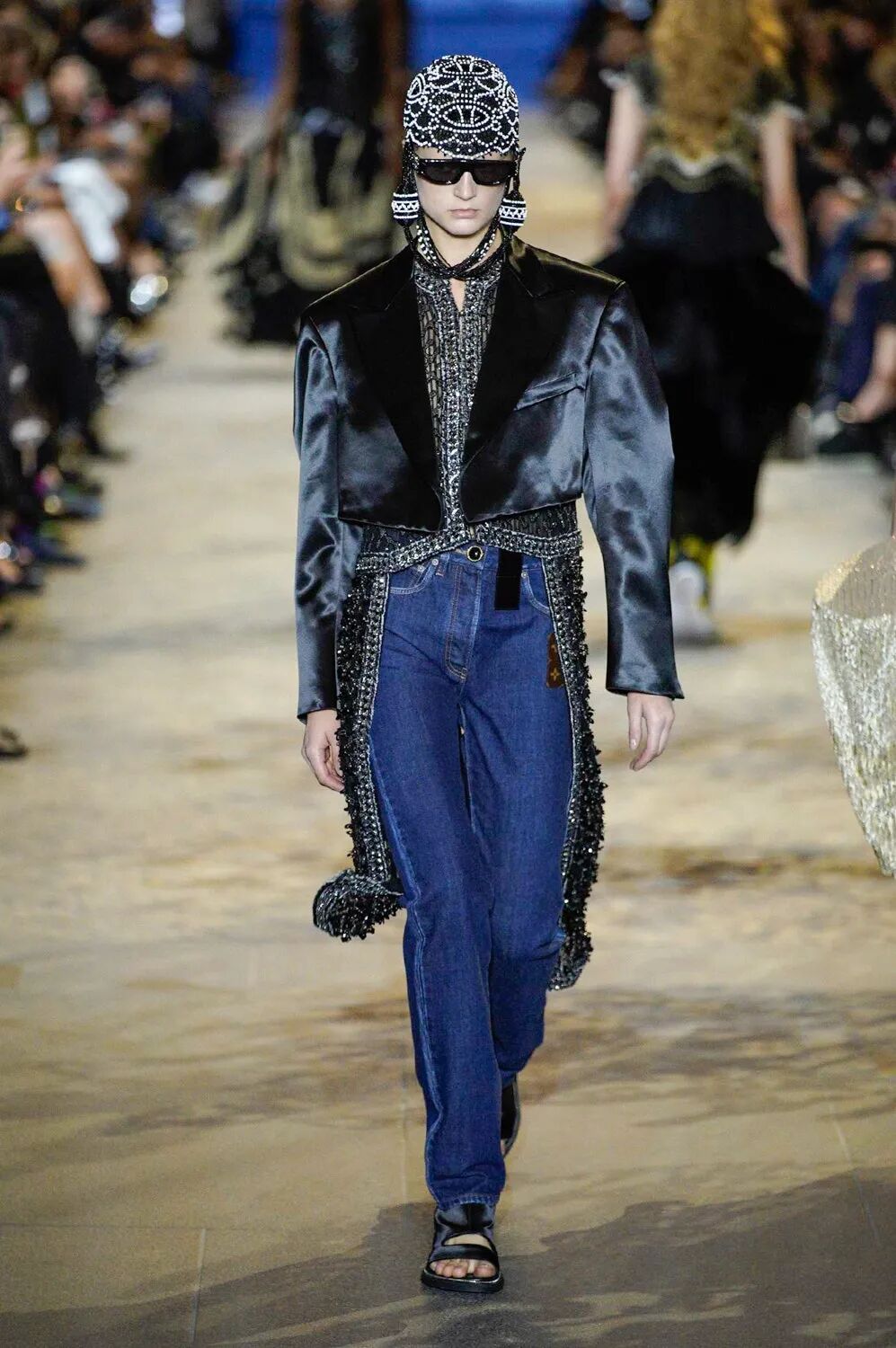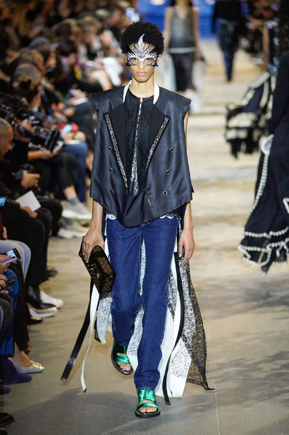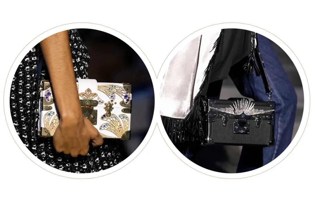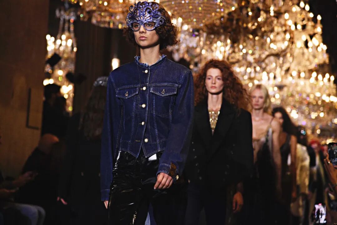 女装艺术总监Nicolas Ghesquière和自由式滑雪世界冠军谷爱凌旅行的真谛、奇妙的自然探索、建筑杰作和艺术一直以来与Louis Vuitton存在着千丝万缕的关联。当交响曲遇上摇滚乐,白天融入黑夜,从历史的灵魂中汲取风格灵感,寻常的制服变得华丽。Ghesquière的时空魔法再次开启,一场凶猛而柔美的晚会拉开帷幕。本季,极简主义被抛到了窗外,取而代之的是超越品牌规范的大胆,现代日常中的服饰被放入时间旋涡改造成一系列奢华个性的晚会礼服,每一件都是穿越时间的艺术宣言。黑色和海军蓝的深色调与浅白色和金色的穿插出场在视觉上形成鲜明对比,华丽的复古细节和配色让人想起皇室和凡尔赛宫,以及19世纪法国巴黎浪漫主义上层社会的奢华生活。与牛仔单品结合的造型贯穿始终。无论是珠饰斜裁吊带裙或立体廓形西服都可以用来搭配休闲直筒牛仔裤,让人仿佛置身于新千年之初。将牛仔夹克摇身一变做成燕尾服的设计更是令人拍手称奇。随着大秀进程的推进,造型的层次变得越来越复杂。连衣裙搭配廓形西装外套,背心与吊带连衣裙的双重叠穿,锋利的肩部和突出的腰线、精致的蕾丝拉夫领以及厚实的天鹅绒,无论男女都独立又充满活力。大秀尾声,引人注目的披风是旧时代巴黎式化妆舞会和21世纪派对装扮的完美结合。灵感源于Ghesquière为即将推出的HBO Max影视剧中Alicia Vikander的角色所设计的服装。细节方面堪称精彩,Ghesquière为几乎每一个造型都搭配了假面舞会风格的大太阳镜、眼罩或头饰,把全新系列的戏剧张力推向高潮。21世纪初的角斗士凉鞋与建筑感及踝靴的结合,搭配珍珠、扣眼装饰和充满活力的缎面及亮色漆皮,让每个造型高度升级。万众瞩目的包袋方面,这一季主打撞色漆皮材质,Cannes水桶包、Coussin手包都被赋予了全新摩登活力。加长版Petite Malle盒子包,经过升级衍生出了不同材质与花纹,既可通勤又精致如珠宝。全新登场的Pochette也成为了秀场上的吸睛神器,经典材质配色结合多种背法的多功能肩带设计,即将成为都市时髦女郎的不二选择。时间能消融功能与规则的壁垒,也可以融合时装风格的多样,经典与神圣在卢浮宫之中进行了完美的结合。当我们自以为了解了所有时尚“规则”时,Ghesquière以一声巨响结束2022春夏时装周,在新一季Louis Vuitton女装中再次超越了自己。-