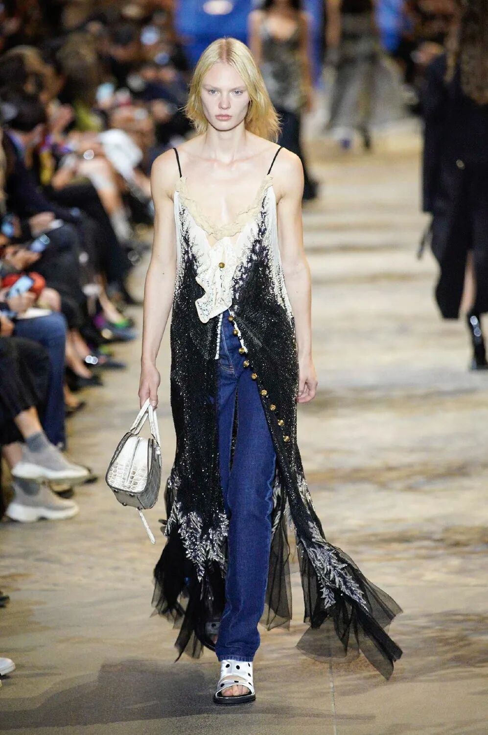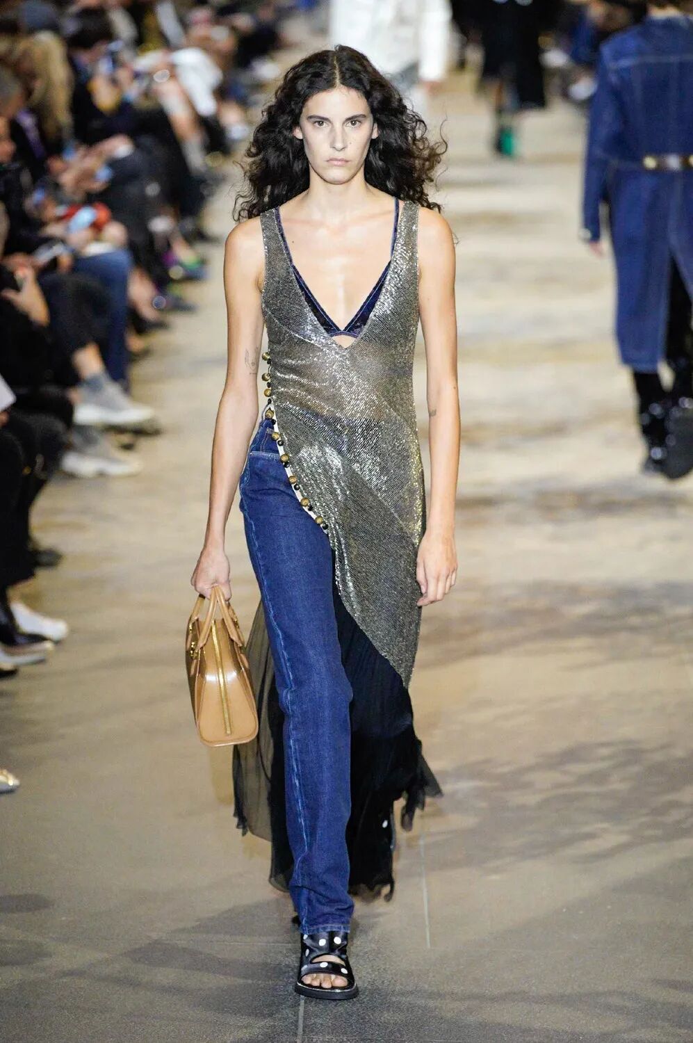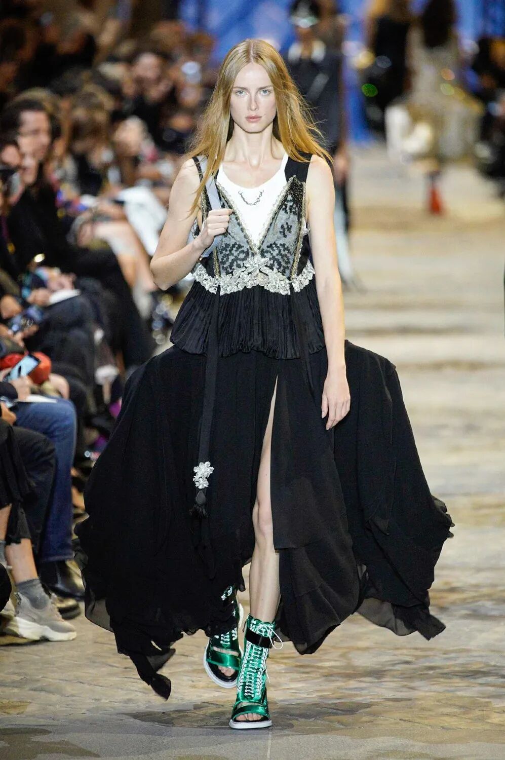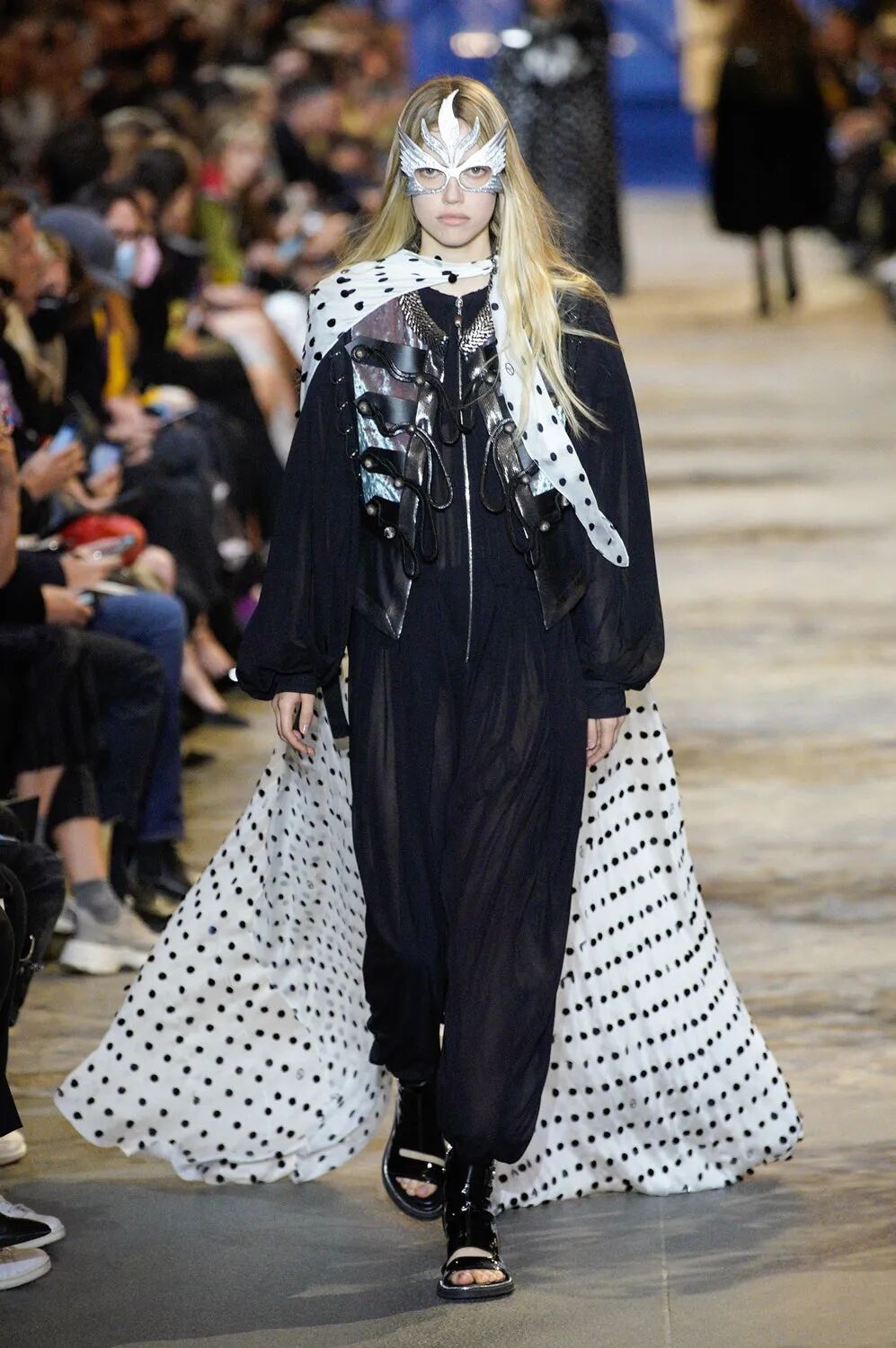 女装艺术总监Nicolas Ghesquière和自由式滑雪世界冠军谷爱凌旅行的真谛、奇妙的自然探索、建筑杰作和艺术一直以来与Louis Vuitton存在着千丝万缕的关联。当交响曲遇上摇滚乐,白天融入黑夜,从历史的灵魂中汲取风格灵感,寻常的制服变得华丽。Ghesquière的时空魔法再次开启,一场凶猛而柔美的晚会拉开帷幕。本季,极简主义被抛到了窗外,取而代之的是超越品牌规范的大胆,现代日常中的服饰被放入时间旋涡改造成一系列奢华个性的晚会礼服,每一件都是穿越时间的艺术宣言。黑色和海军蓝的深色调与浅白色和金色的穿插出场在视觉上形成鲜明对比,华丽的复古细节和配色让人想起皇室和凡尔赛宫,以及19世纪法国巴黎浪漫主义上层社会的奢华生活。与牛仔单品结合的造型贯穿始终。无论是珠饰斜裁吊带裙或立体廓形西服都可以用来搭配休闲直筒牛仔裤,让人仿佛置身于新千年之初。将牛仔夹克摇身一变做成燕尾服的设计更是令人拍手称奇。随着大秀进程的推进,造型的层次变得越来越复杂。连衣裙搭配廓形西装外套,背心与吊带连衣裙的双重叠穿,锋利的肩部和突出的腰线、精致的蕾丝拉夫领以及厚实的天鹅绒,无论男女都独立又充满活力。大秀尾声,引人注目的披风是旧时代巴黎式化妆舞会和21世纪派对装扮的完美结合。灵感源于Ghesquière为即将推出的HBO Max影视剧中Alicia Vikander的角色所设计的服装。细节方面堪称精彩,Ghesquière为几乎每一个造型都搭配了假面舞会风格的大太阳镜、眼罩或头饰,把全新系列的戏剧张力推向高潮。21世纪初的角斗士凉鞋与建筑感及踝靴的结合,搭配珍珠、扣眼装饰和充满活力的缎面及亮色漆皮,让每个造型高度升级。万众瞩目的包袋方面,这一季主打撞色漆皮材质,Cannes水桶包、Coussin手包都被赋予了全新摩登活力。加长版Petite Malle盒子包,经过升级衍生出了不同材质与花纹,既可通勤又精致如珠宝。全新登场的Pochette也成为了秀场上的吸睛神器,经典材质配色结合多种背法的多功能肩带设计,即将成为都市时髦女郎的不二选择。时间能消融功能与规则的壁垒,也可以融合时装风格的多样,经典与神圣在卢浮宫之中进行了完美的结合。当我们自以为了解了所有时尚“规则”时,Ghesquière以一声巨响结束2022春夏时装周,在新一季Louis Vuitton女装中再次超越了自己。-