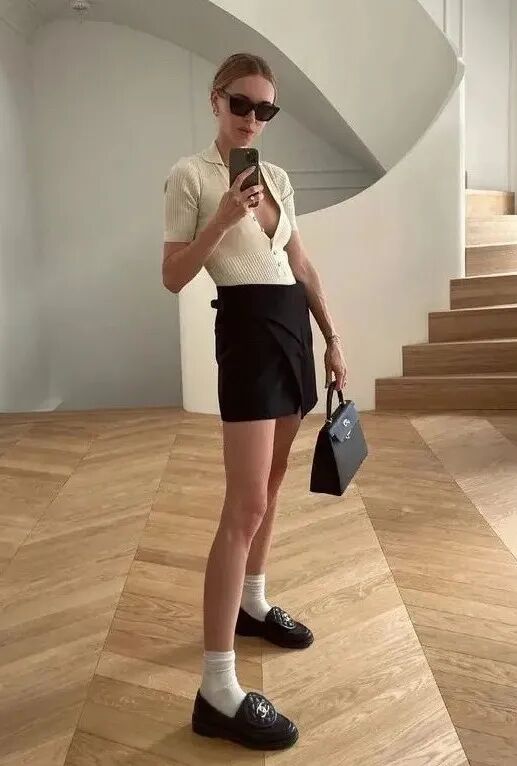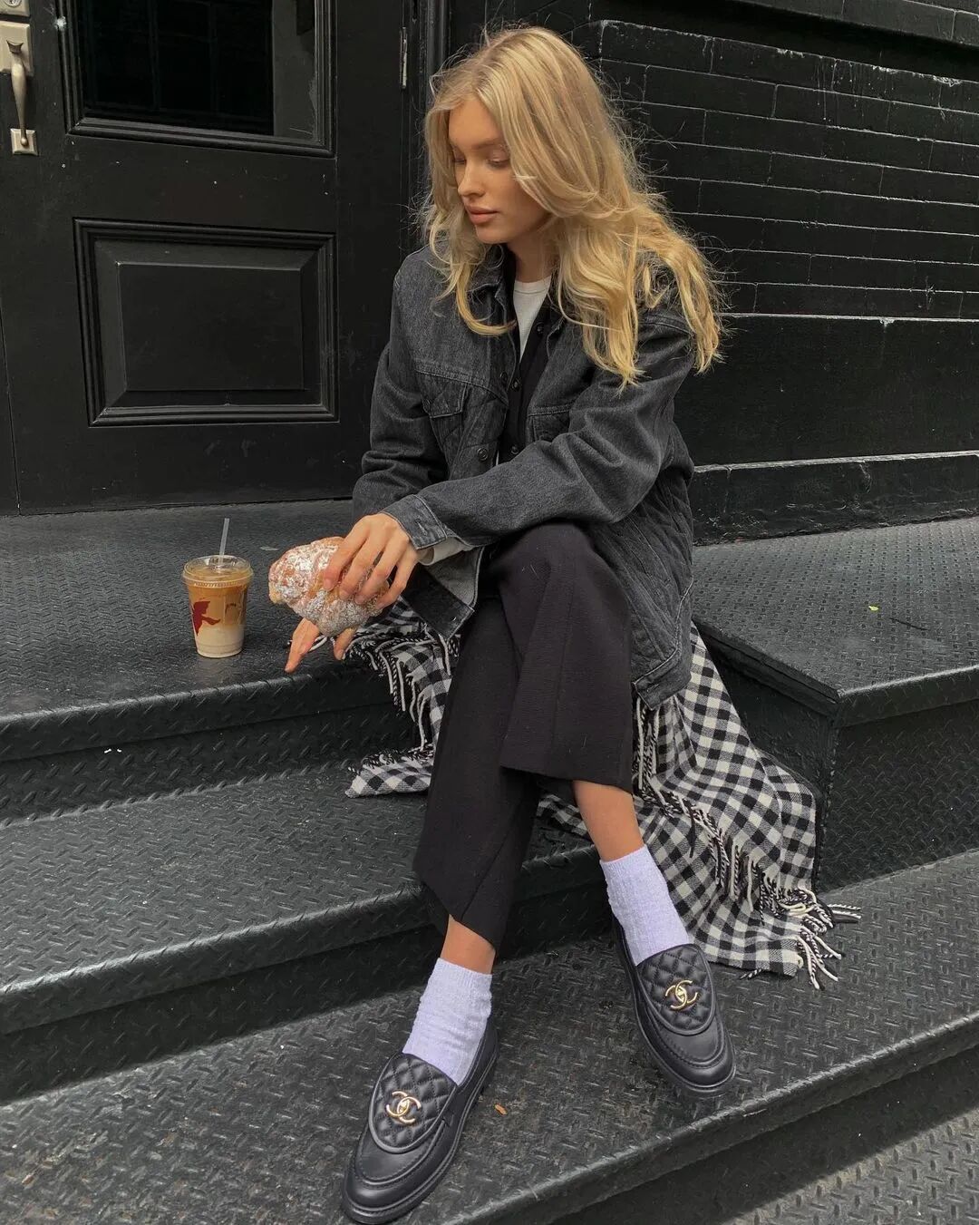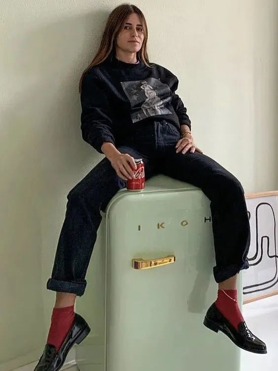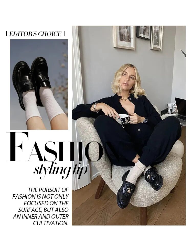 这种搭配其实也不是今年才流行起来的。换上五分短裤和百褶短裙,搭配短袜、乐福鞋,就是上世纪60年代经典的Preppy Style学院风。在气温尚暖和的地区,你们大可放心继续这样穿,不管是搭配百慕大短裤的男孩子气,还是A字短裙的甜美俏皮都合适。北方的同学也可以参考CELINE秋冬秀场上的造型,换成更能御寒的长裙款式,用中性的乐福鞋来搭配,介于硬朗与温柔之间的气质,显得特别有魅力。当然了,更可爱的娃娃裙也可以搭配乐福鞋。两者都带有减龄属性,用乐福鞋的帅气来平衡甜腻感,俏皮中还带着酷感。乐福鞋与直筒牛仔裤、西装长裤的搭配,也是极为常见的组合。只要套上西装外套或者板型挺括的风衣,轻松搞定秋季休闲时髦的通勤Look,不仅穿着舒服,还很有造型感。乐福鞋和短袜的搭配最经典。袜筒长度选在脚踝附近就好,能打造出层次感同时,也为穿搭加入几分正式感。颜色上,如果是白色短袜,在今年尤其加分。亮眼的色彩碰撞能完美诠释乐福鞋的帅气随性,总之是谁穿谁时髦~黑色短袜也是百搭之选,比白袜子更酷,在任何场合都不会出错。如果搭配黑色的乐福鞋和长裤,三者顺色,整体视觉也非常和谐。穿搭高手还可以试试挑战彩色短袜,只要和身上其他单品颜色作呼应,整体就会太违和。棕色、酒红等秋冬的必备色系都可以尝试。