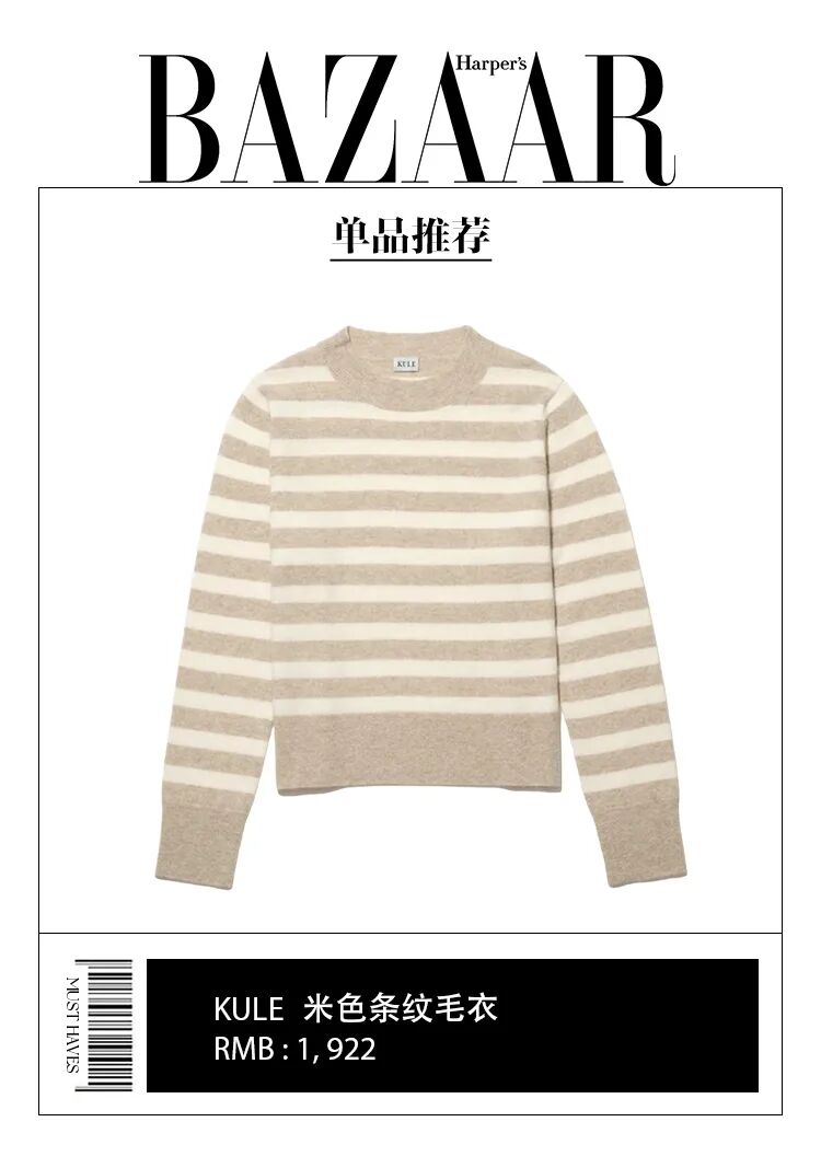 条纹毛衣在颜色搭配上,就是要营造Effortless Chic的高级质感。黑、白、米,还可以再增加一个牛仔色,这四种颜色相互搭配基本不会出错。