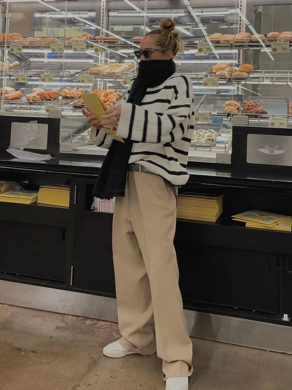 条纹毛衣中黑白条纹中的白色其实大多数更偏向于米白色,所以我们在搭配时可以巧妙地运用不同米色之间的色差,来打造一身符合秋天氛围的米色穿搭。