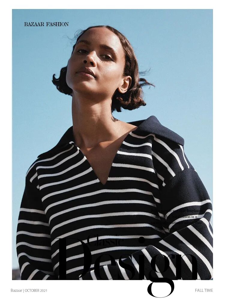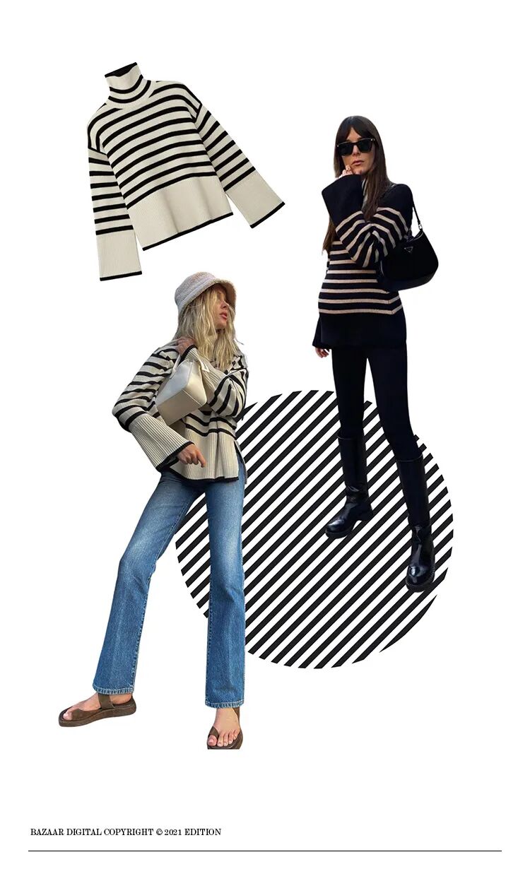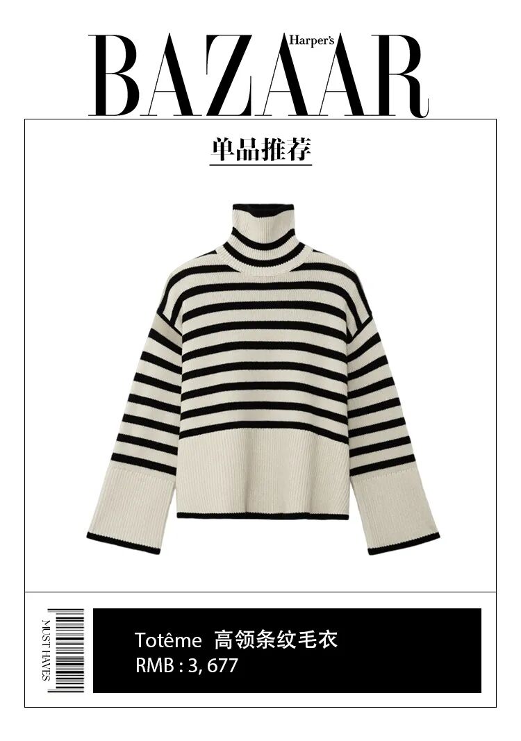 所以对于小骨架女生来说,条纹的使用就是要放肆一点,拼接、高领这样的元素都可以运用起来,从而加强肩部的存在感,同时再用上松下紧优化比例,这才是属于小个子女生穿条纹毛衣的正确打开方式。