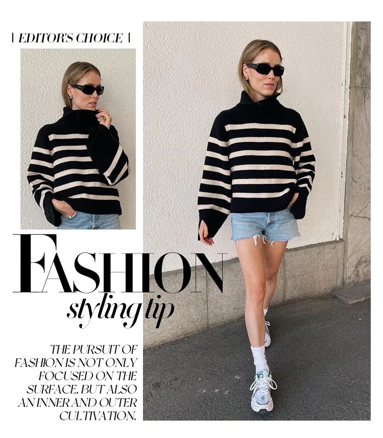 Polo领不仅可以拉长脖颈线条,而且还为条纹毛衣增添了一点设计感,拉链款可以自由调节领口的敞开程度,还可以把领子微微立起,有一种不输男装的潇洒。