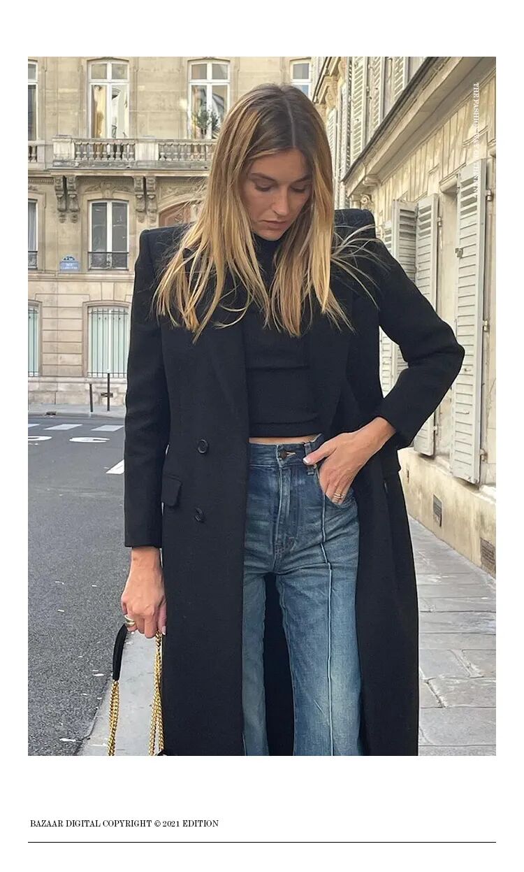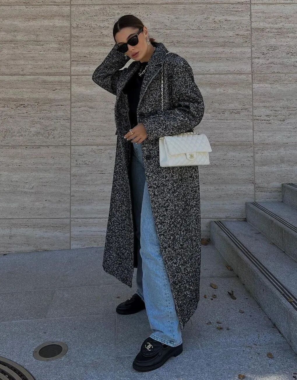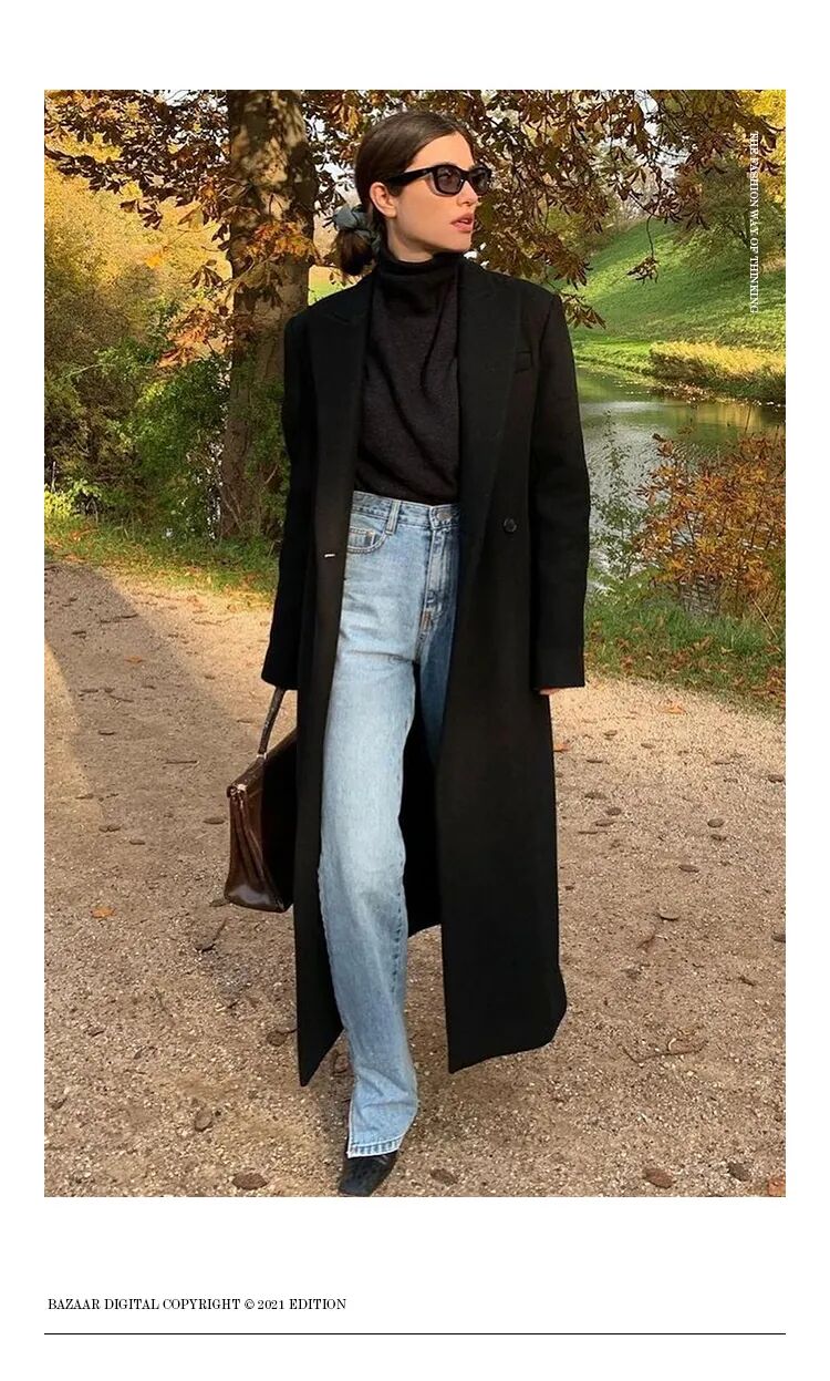 超长大衣还很适合搭配休闲随性的牛仔裤。牛仔材质的不羁和洒脱可以打破大衣的正式和成熟,让整体穿搭多了一丝街头的活力感。不管什么颜色的超长大衣,和牛仔裤搭配起来都很和谐,这种基础万能 Look 不管上班、出街都无压力~