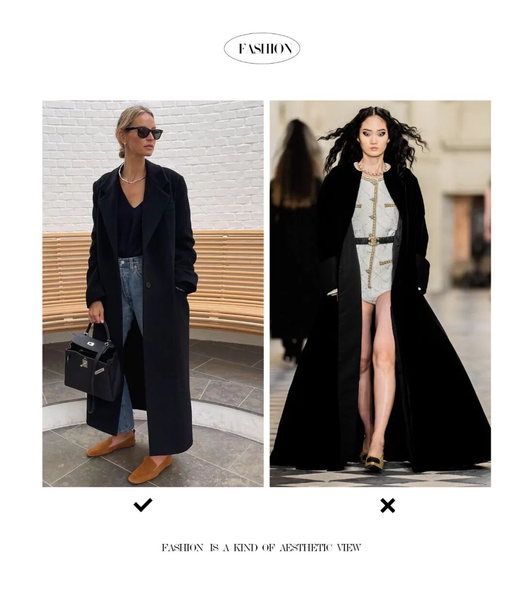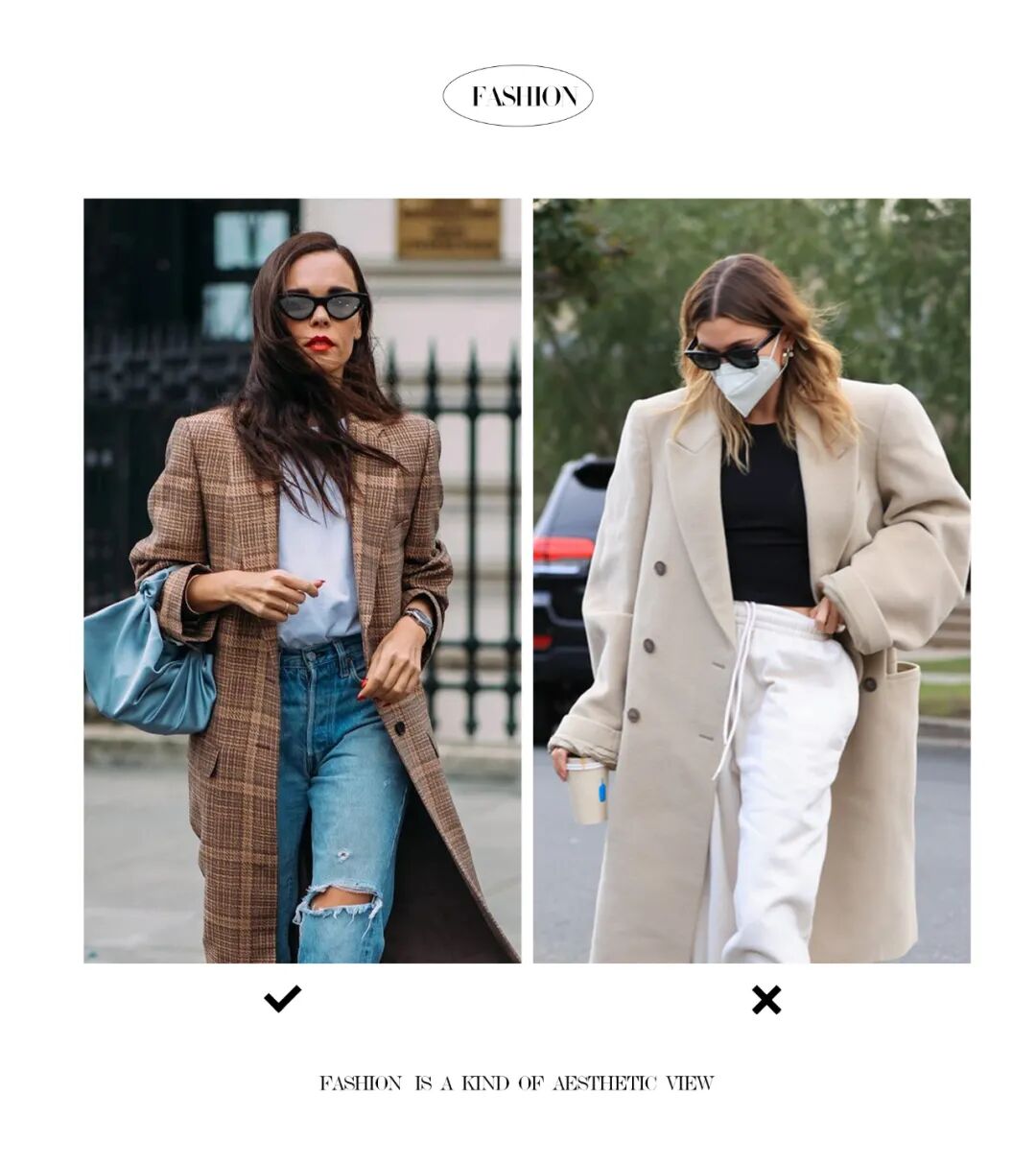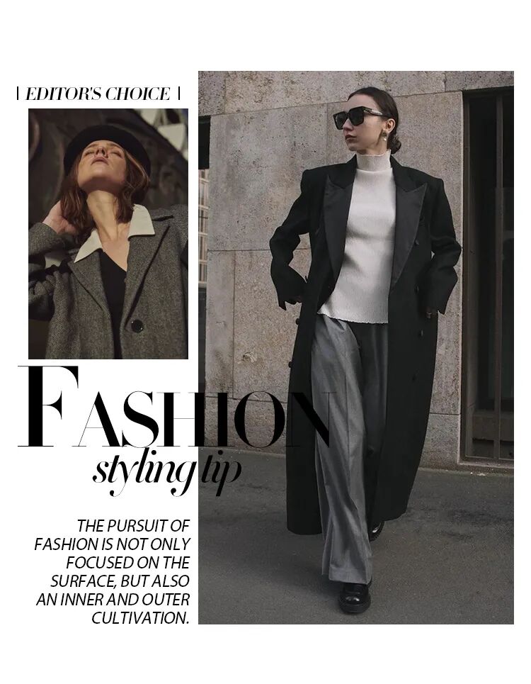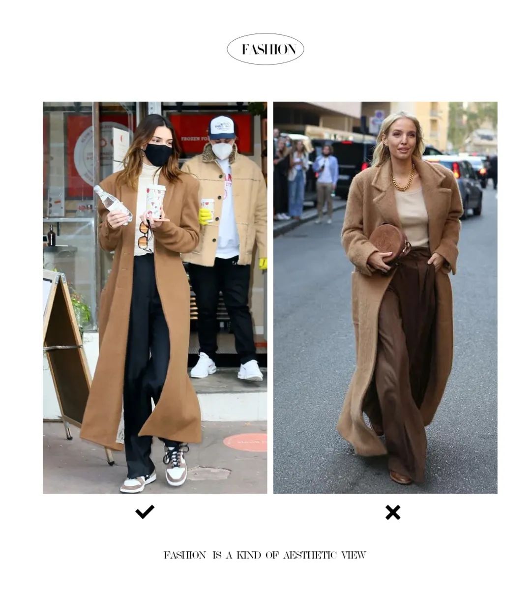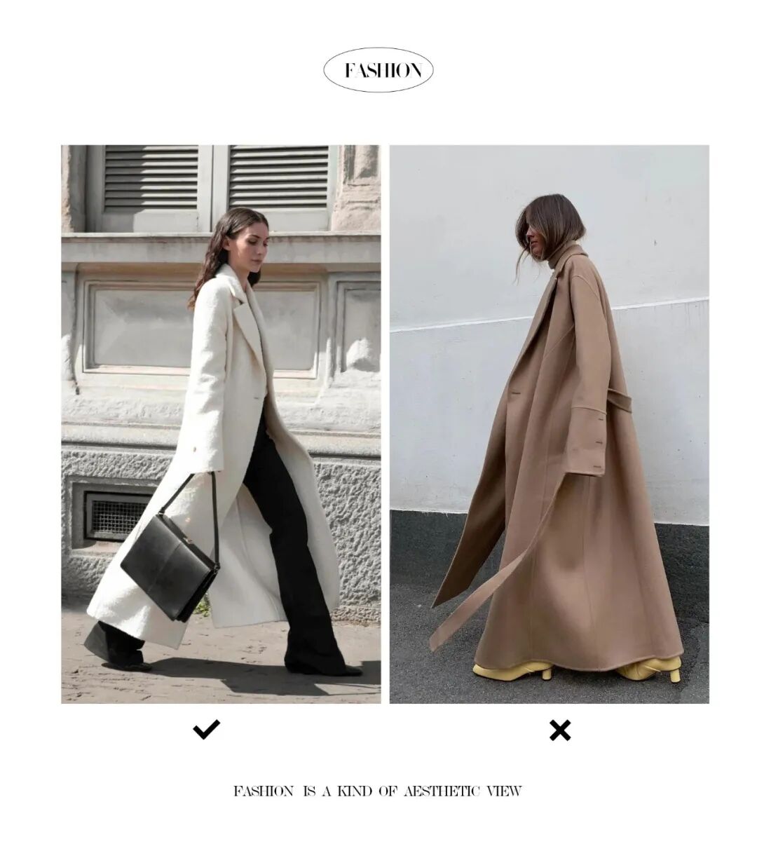最后再来说说经常被忽略的面料细节。超长大衣的面料越硬挺、垂坠感越好,便越能有纵向的延伸感,在视觉上也能更显高。相反,如果大衣的面料选得不好,感觉比较蓬,便会让衣服看上去很宽大,这样整体就很容易压个子了。所以,挑选超长大衣时也要避免有膨胀感的材质,选择垂坠感更好的面料,这样穿上身妥帖又垂顺,人看起来自然高了很多。