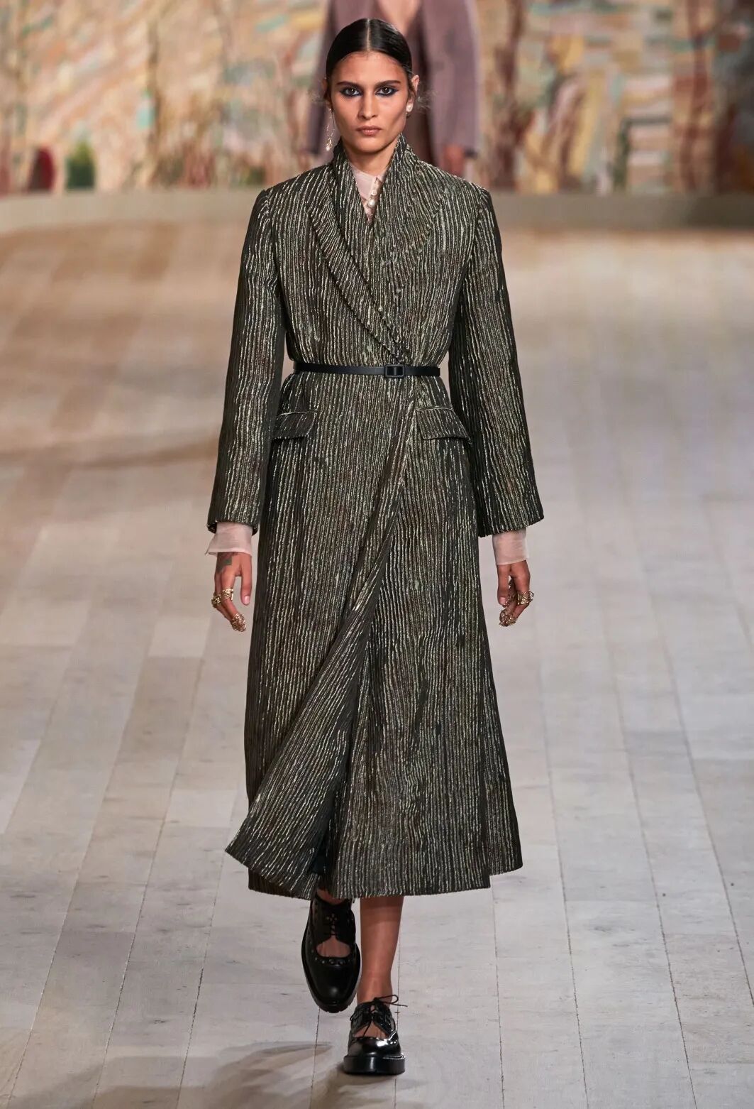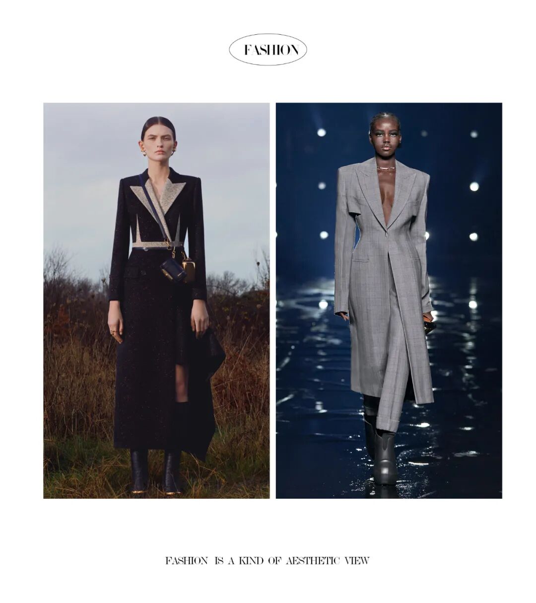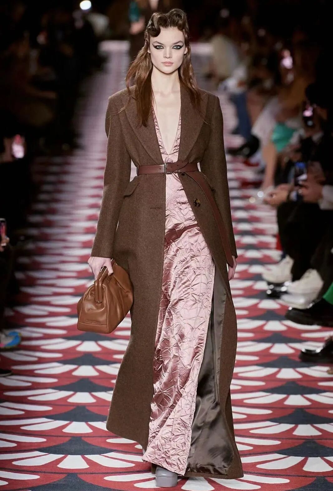 另外,挑选超长大衣时也要注意衣服下摆不宜过分宽大。夸张的下摆容易拉低视觉重心,让人显得没有造型感又拖沓。微扩的设计便有足够的气场,上身藏肉同时实力诠释优雅大方。虽是超长款式,但大衣也不是越长越好。一般来说,大衣长度到脚踝偏上的位置正合适,既不会太压个子,又能穿出大女主的气场。如果大衣过长、没过脚踝,整个人就像被包裹住,会有种透不过气的感觉。所以,尽量选择能露出脚踝部分的设计,才能避免整体显得拖沓、毫无精神。而且袖子的长度也要留心。尤其是小个子的女生,袖长到手腕附近就刚刚好,适当露出双手的腕线来,看起来才更显得干练利落。除了板型和长度,大衣的肩部设计也是不容忽视的细节。像甜茶身上的大衣基本都是肩线分明,显得整个人非常挺拔有精神。而在今年秀场上,气场型垫肩长大衣的出现频率非常高,加宽的肩线比例和垫肩修饰,穿上就有霸道总裁雷厉风行的气质。