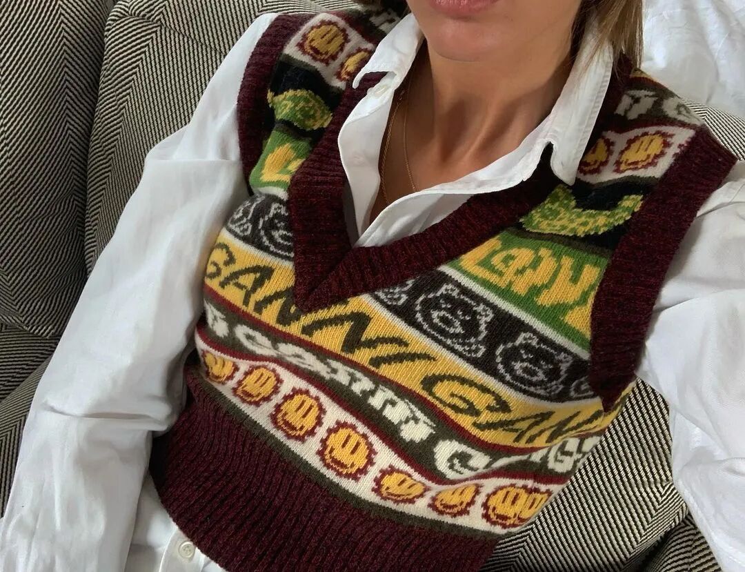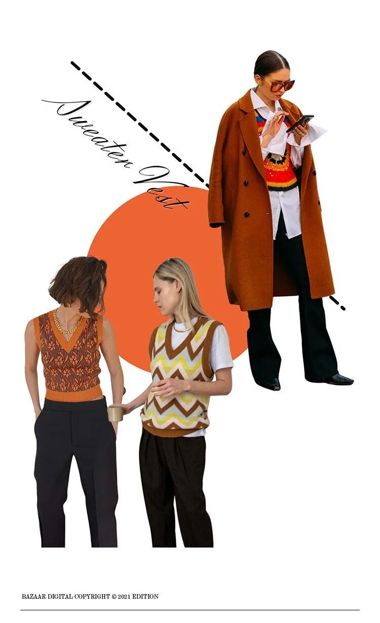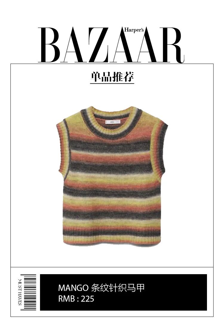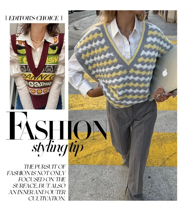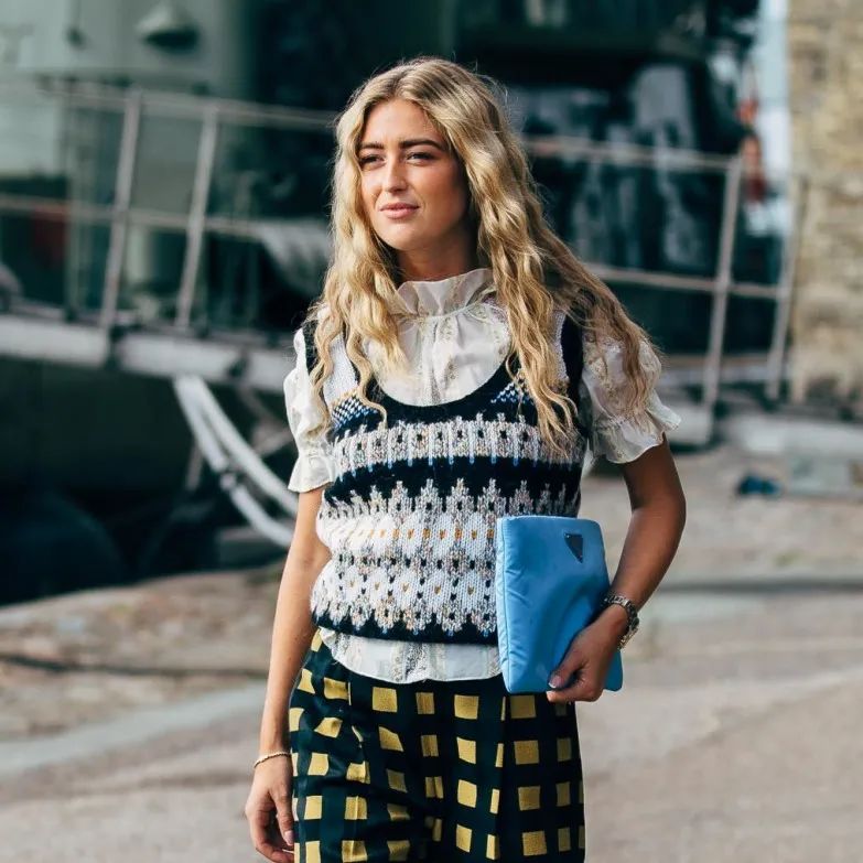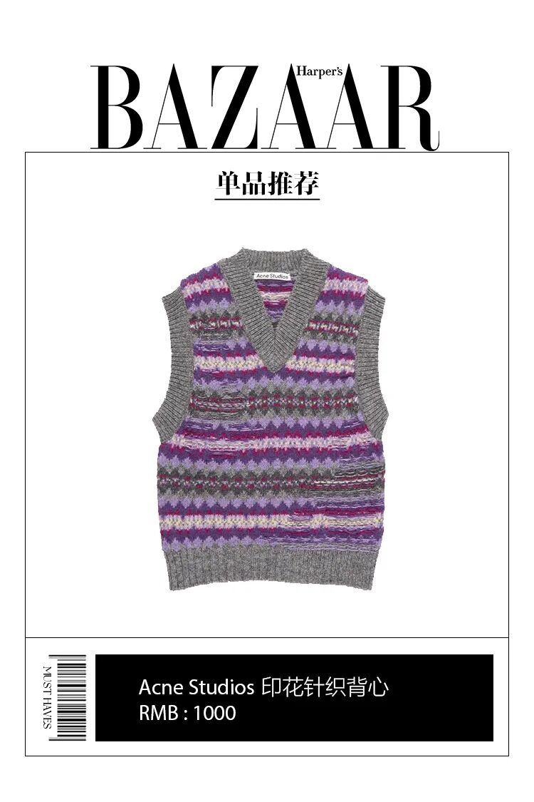 各种图案的针织马甲看起来花哨,其实配上我们的购买习惯是更容易出彩的时尚单品。因为很少购入五颜六色的下装,所以把搭配时的注意力转移到上装可以为穿搭创造更多可能。