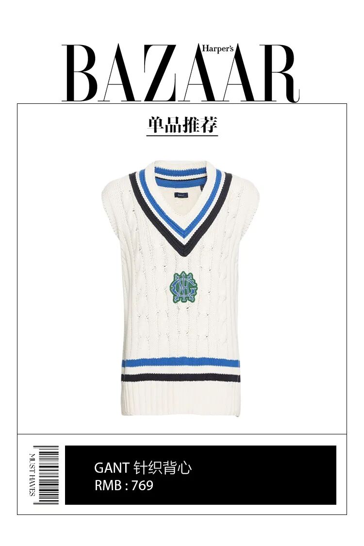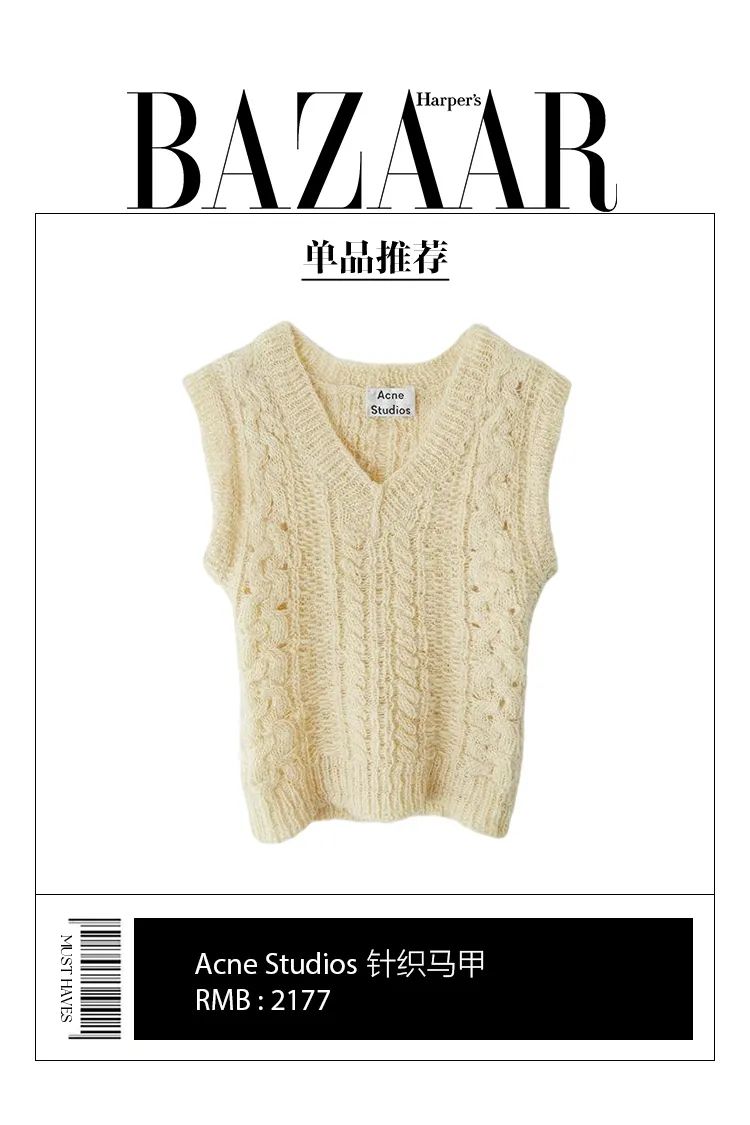 运动休闲感的针织马甲上这种扭花纹路很有80年代的复古感,也很容易让人联想到Polo式的美式休闲,所以在搭配时也没有太多禁忌,衬衫和T恤通吃,只看你今天想温柔女人一点还是男孩子气一点。