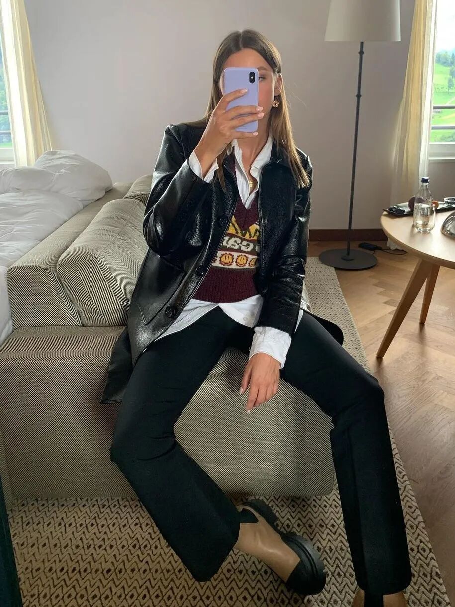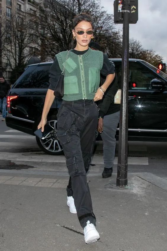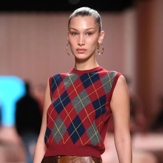 Bella Hadid则用针织背心搭配大比例的皮质单品,学院气的菱格纹针织背心刚好可以中和皮衣和皮裤的硬朗,穿出了千禧酷女孩的风格。