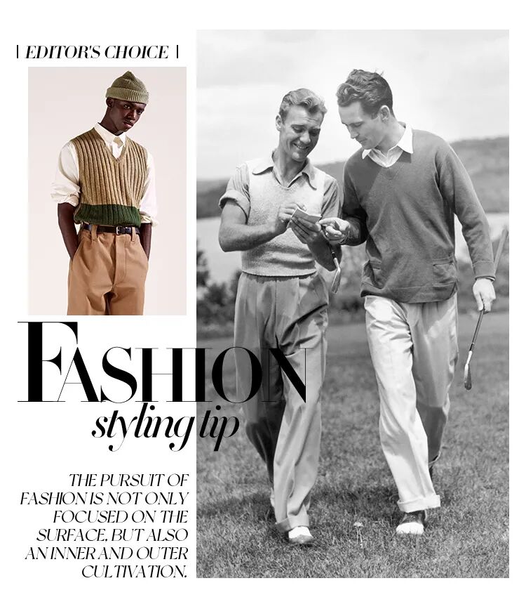 针织马甲的这份儒雅来自于绅士的男士运动——高尔夫球、马球以及划船,起初只是为了运动时保暖同时方便胳膊活动的无袖设计,在后来竟然成为了休闲装中的一股清流,休闲中又不失绅装的优雅。