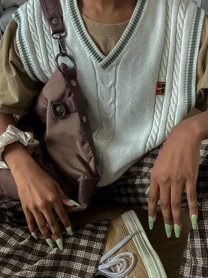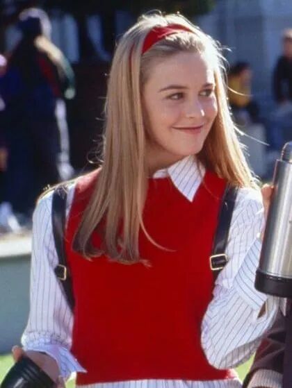 以20世纪美国校园为背景的经典电影《独领风骚》中,女主角Cher经常用针织马甲来打造甜辣的美式校园风格,Cher的甜妹造型至今都是美式校园穿搭的模板。