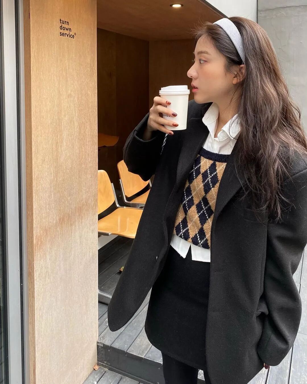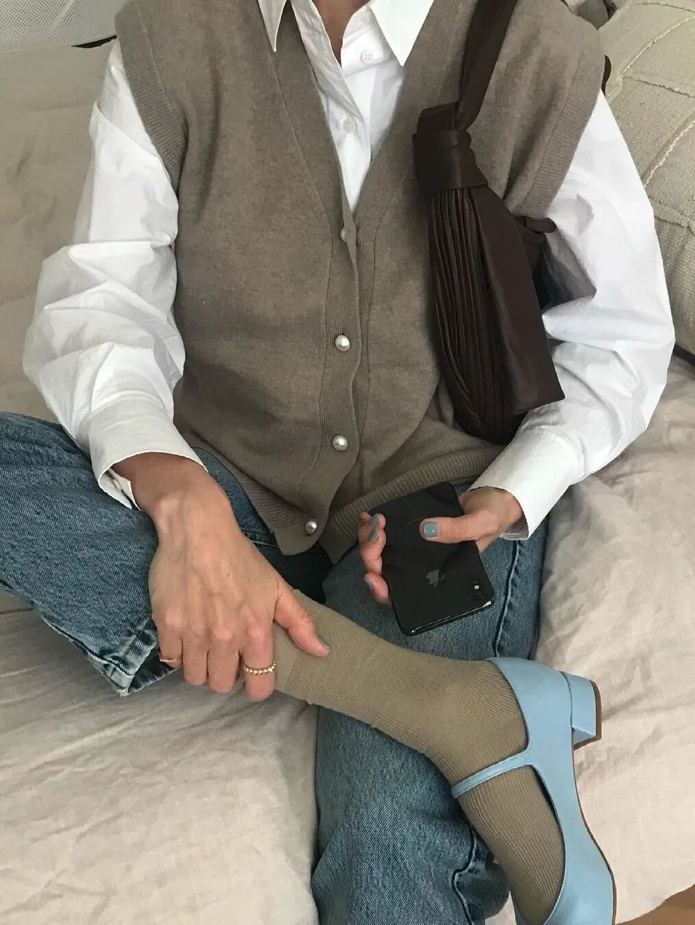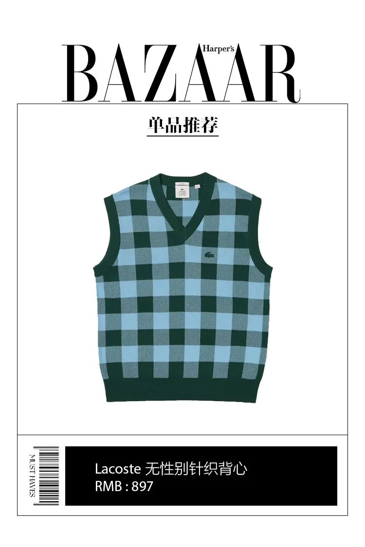 在挑选这种风格的针织马甲时,一定要注意下摆要收紧,不能太过宽松,才能让上衣贴合地塞进下装中。这样在秋冬叠搭的时候,单品之间的层次感才能不显得臃肿。