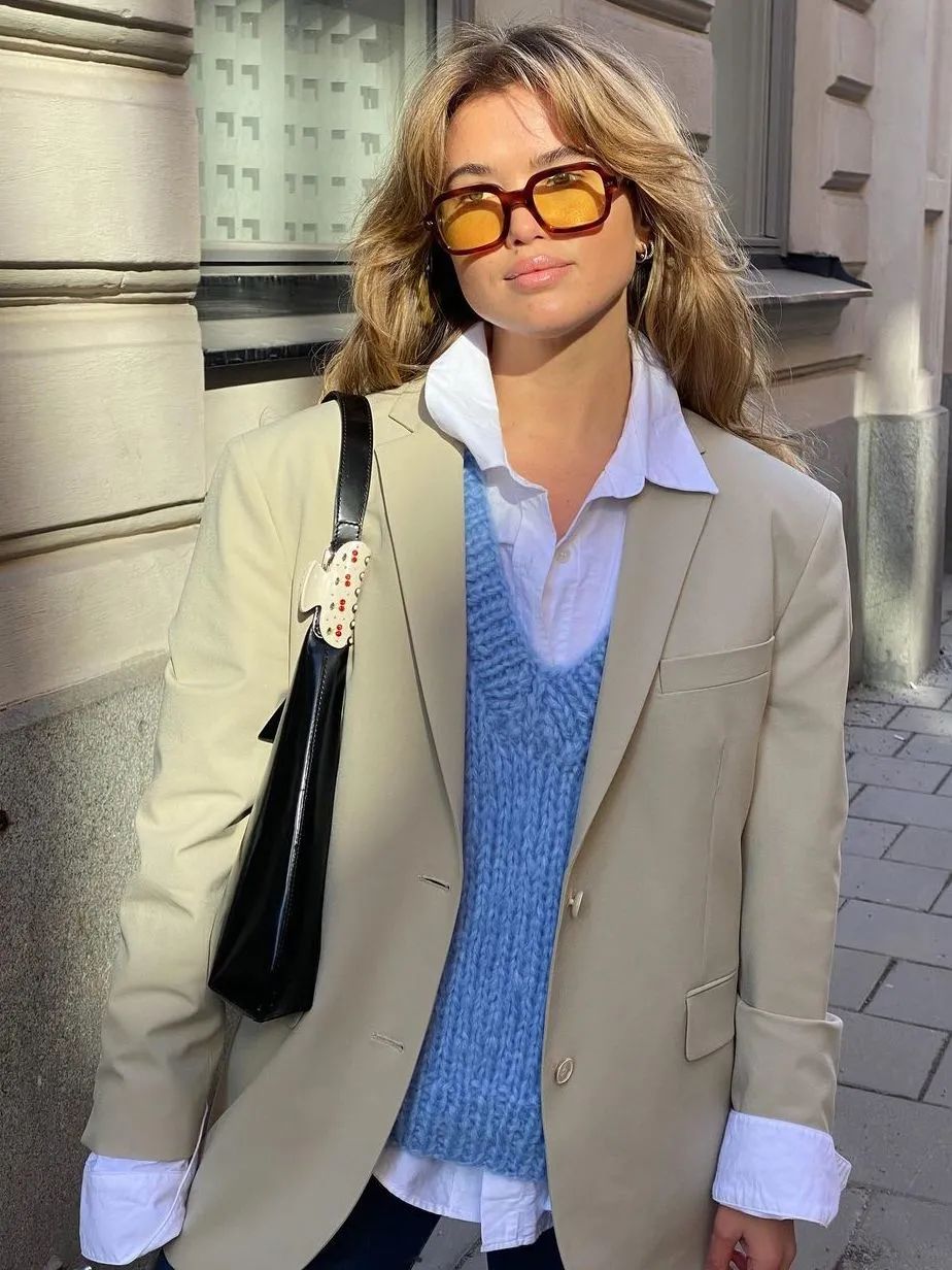 针织马甲和各种款式的衬衫都能进行搭配,夏天遗留下来的娃娃领和荷叶边别着急收起来,叠搭一件针织马甲又能再穿一周。