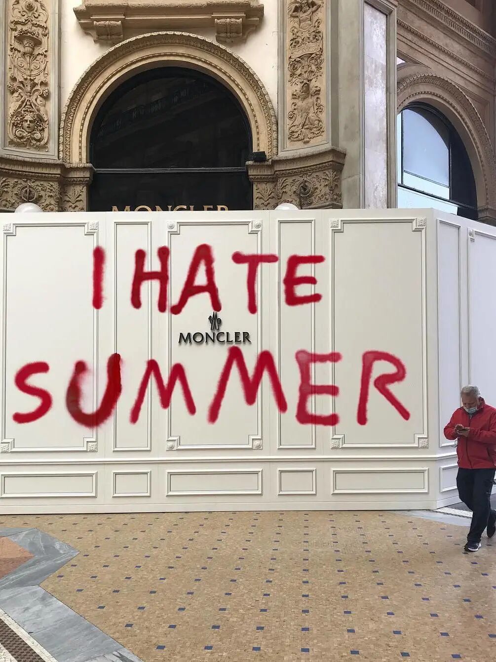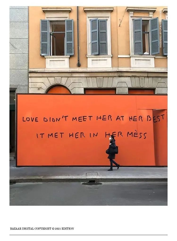 涂鸦艺术家PietroTerzini在4月份在米兰Hermès新店装修区外设计了这个极具辨识度的标语:“Love didn't meet her at her best, it met her in her mess.”(爱也许不会在你光芒万丈的时候到来,却会在你深陷谷底时来到身边。)