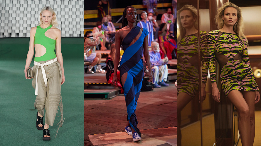 实在不好意思,就小露点侧腰吧。Stella McCartney如泳衣般的连体衣和连体裤以弧形挖空,流线剪裁很显身材;Marni的不经意露肤来自缠绕,随意到给人破碎的感觉;Dundas看似二维的镂空剪裁在Natasha Poly身上非常张扬,这告诉我们,只要有好身材,披块破布就可以释放性感。