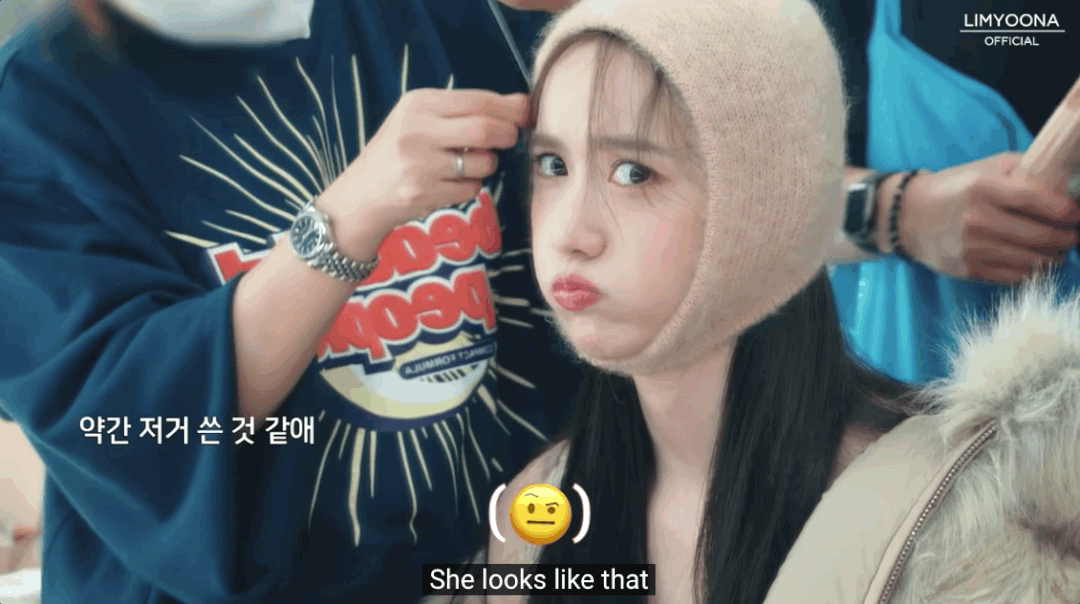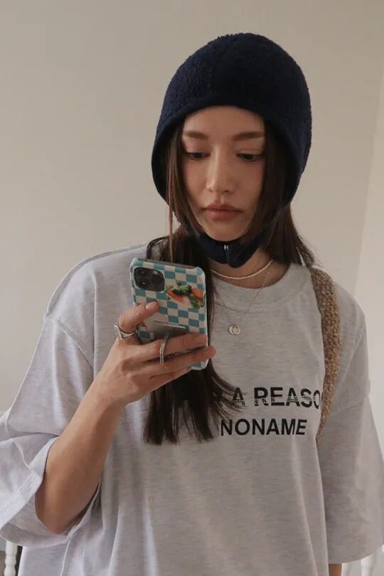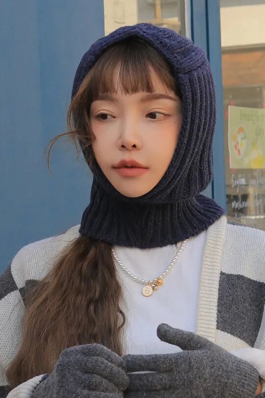 巴拉克拉法帽在佩戴时也有一定技巧,千万不要让帽檐完全卡住整张脸,一定要让帽檐遮住耳朵的同时多露出一点颅顶,在脸侧保留碎发。就算是包裹性较强的款式也可以像允儿这样,挑一点额前的碎发出来修饰脸形搭配眼下腮红,可爱少女感满分。