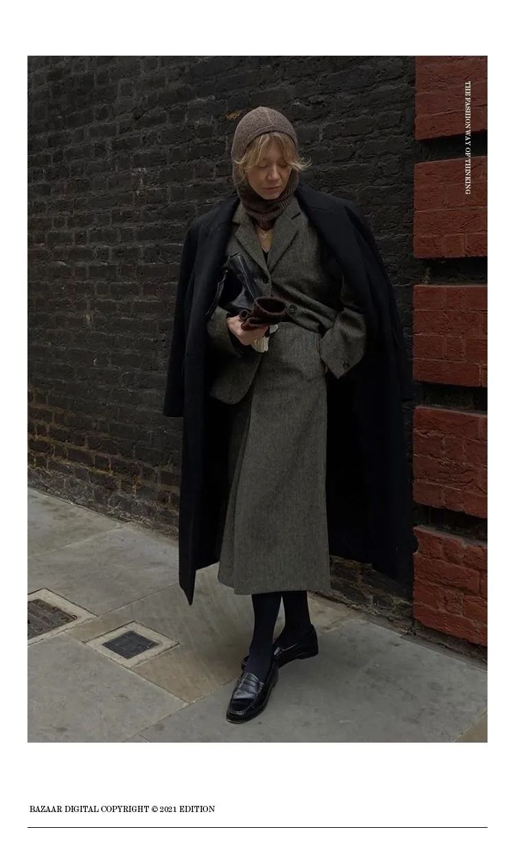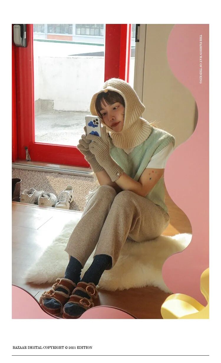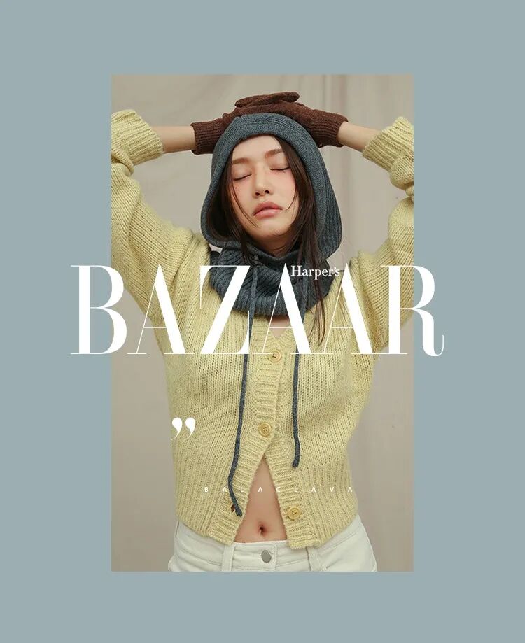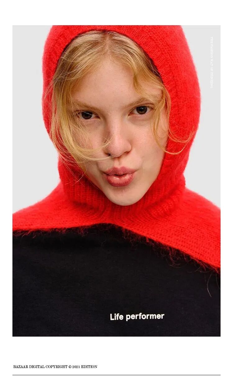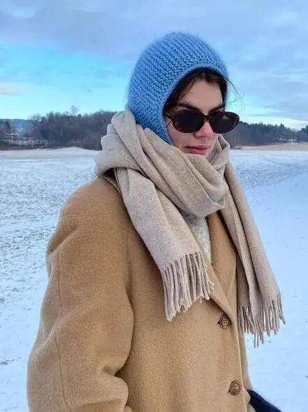 对于巴拉克拉法帽初级学者来说,可以尽量选择跟上衣颜色相近的色系,让视觉上更加有连接性,仿佛是围巾到毛衣的自然过渡,这样不会在初次尝试时觉得太过突兀。比起裹脸款式的巴拉克拉法帽,松垮的款式更加日常,看起来像是帽子+围巾的叠搭接受度更高。也可以用高领毛衣或围巾来遮挡住领口,不仅是初学者容易接受的搭配,还达到了双层保暖的效果,北京的大风天真的很需要这样的装备来打败冬天的魔法攻击。