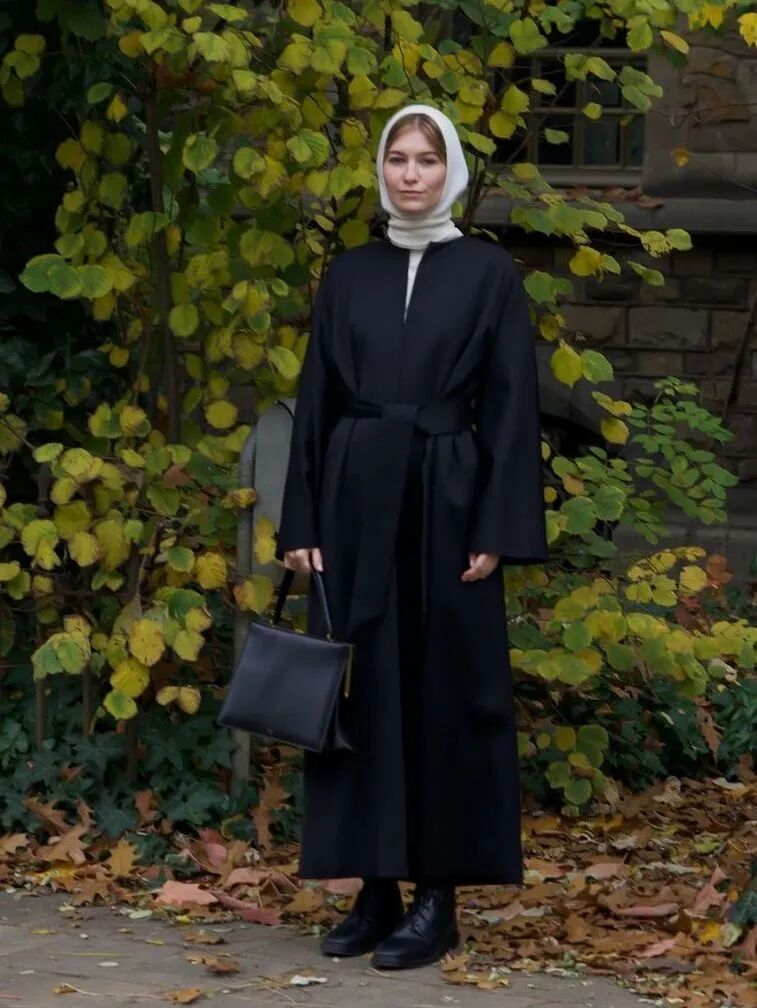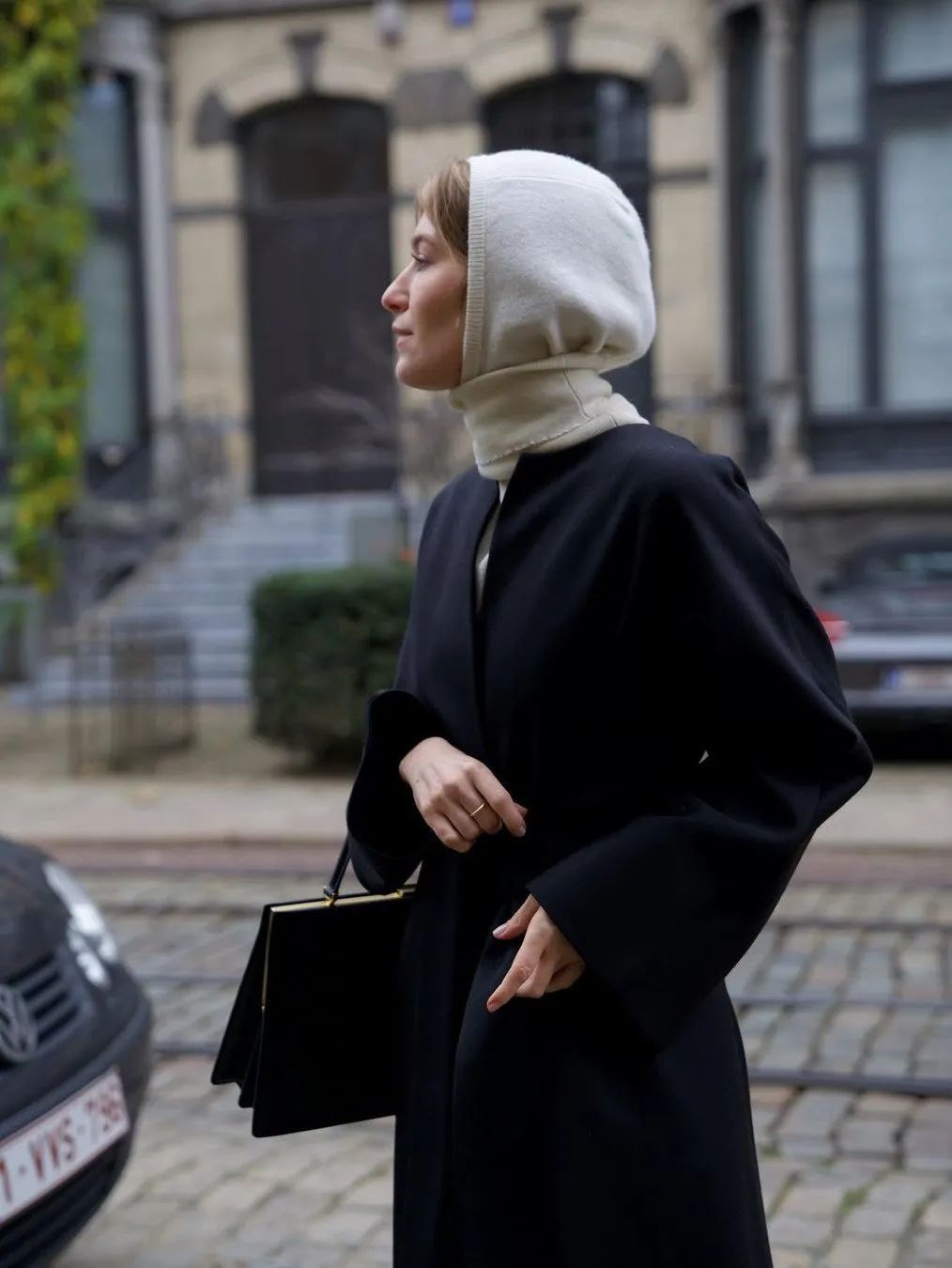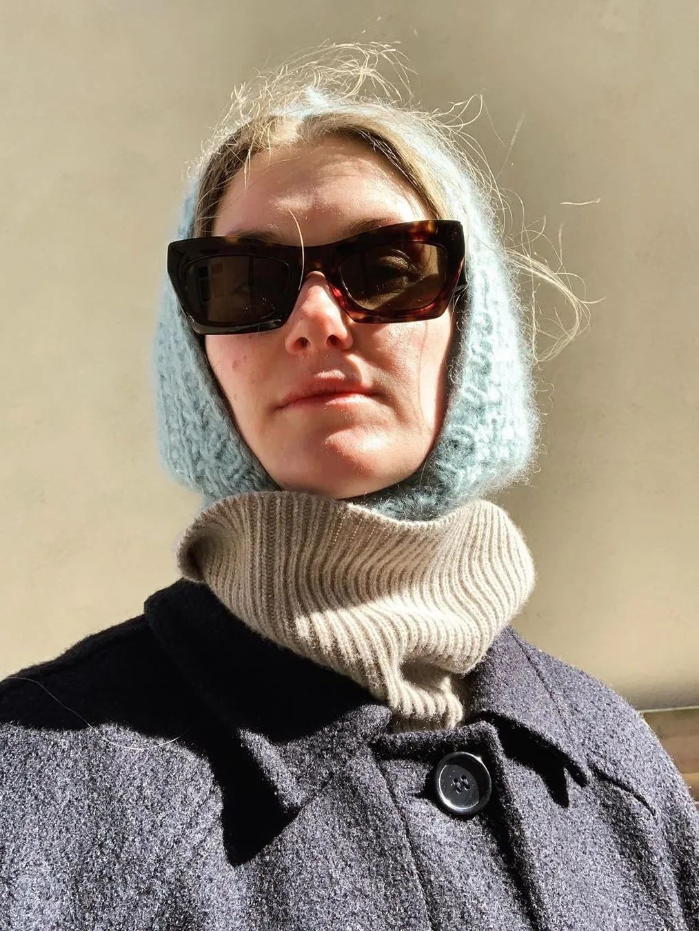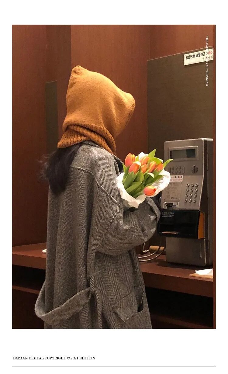 对于巴拉克拉法帽初级学者来说,可以尽量选择跟上衣颜色相近的色系,让视觉上更加有连接性,仿佛是围巾到毛衣的自然过渡,这样不会在初次尝试时觉得太过突兀。比起裹脸款式的巴拉克拉法帽,松垮的款式更加日常,看起来像是帽子+围巾的叠搭接受度更高。也可以用高领毛衣或围巾来遮挡住领口,不仅是初学者容易接受的搭配,还达到了双层保暖的效果,北京的大风天真的很需要这样的装备来打败冬天的魔法攻击。