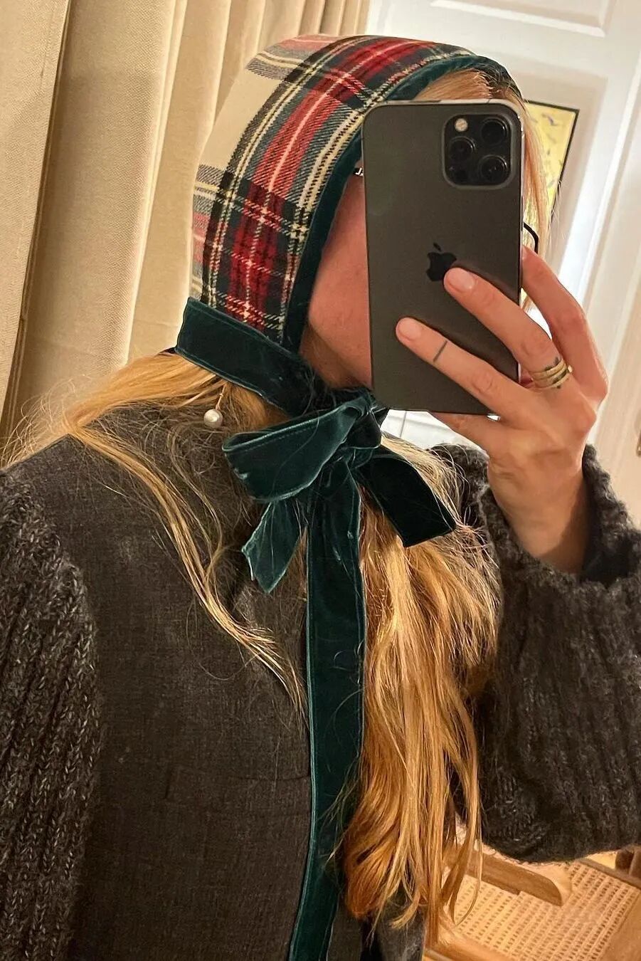 这款帽子还很有圣诞氛围,经典的苏格兰格纹搭配上丝绒蝴蝶结,这不冬日节日装备就安排上了。